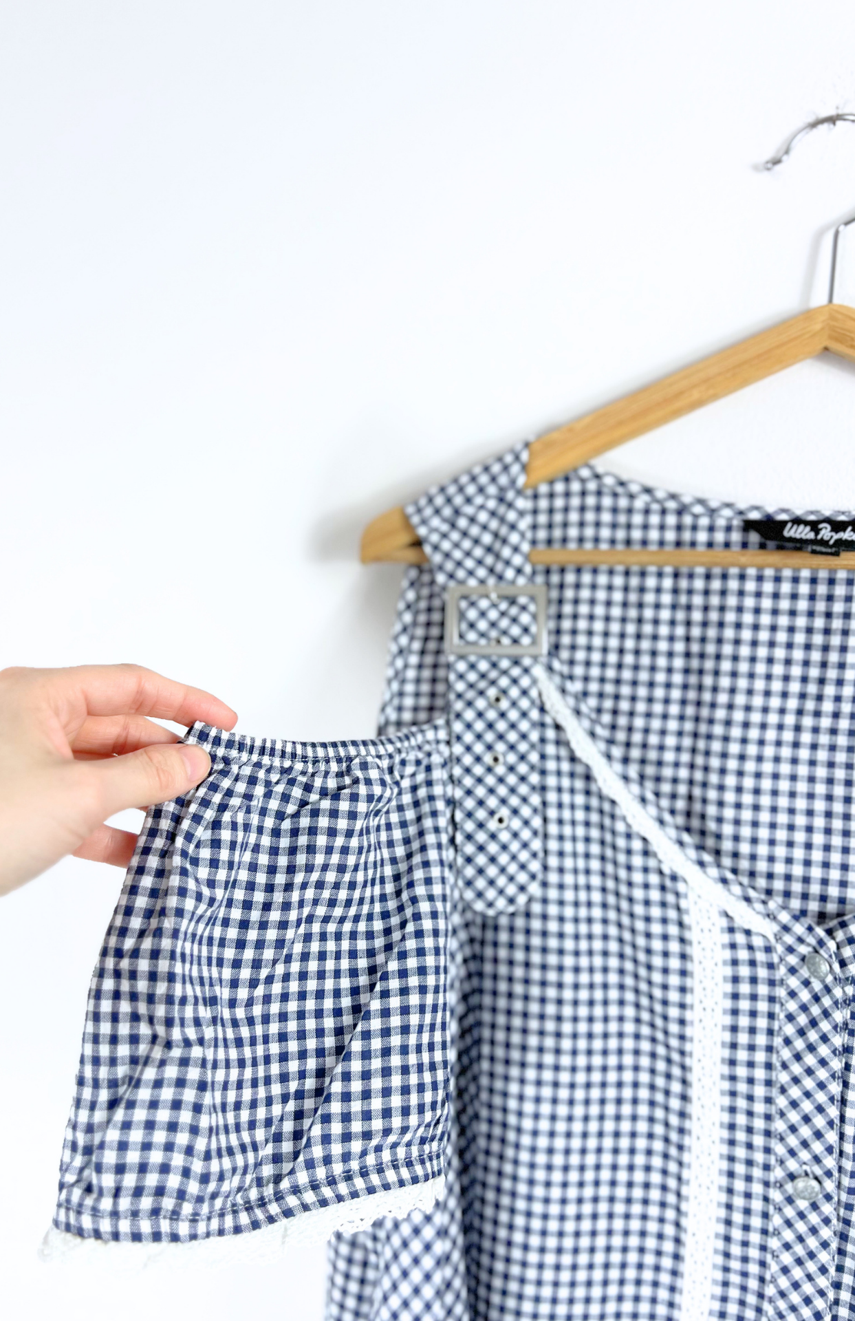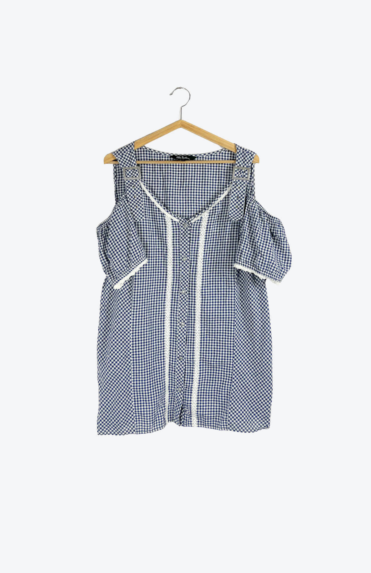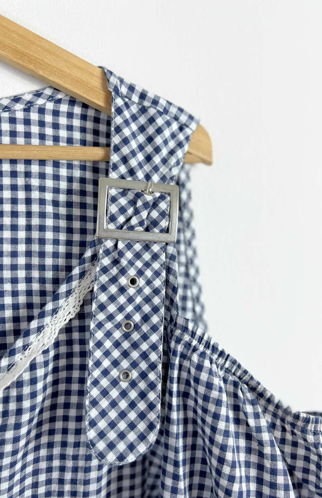 Folklorní top s průstřihy na ramenou. Má kovovou sponu na nastavení délky a detaily s krémovou krajkou.