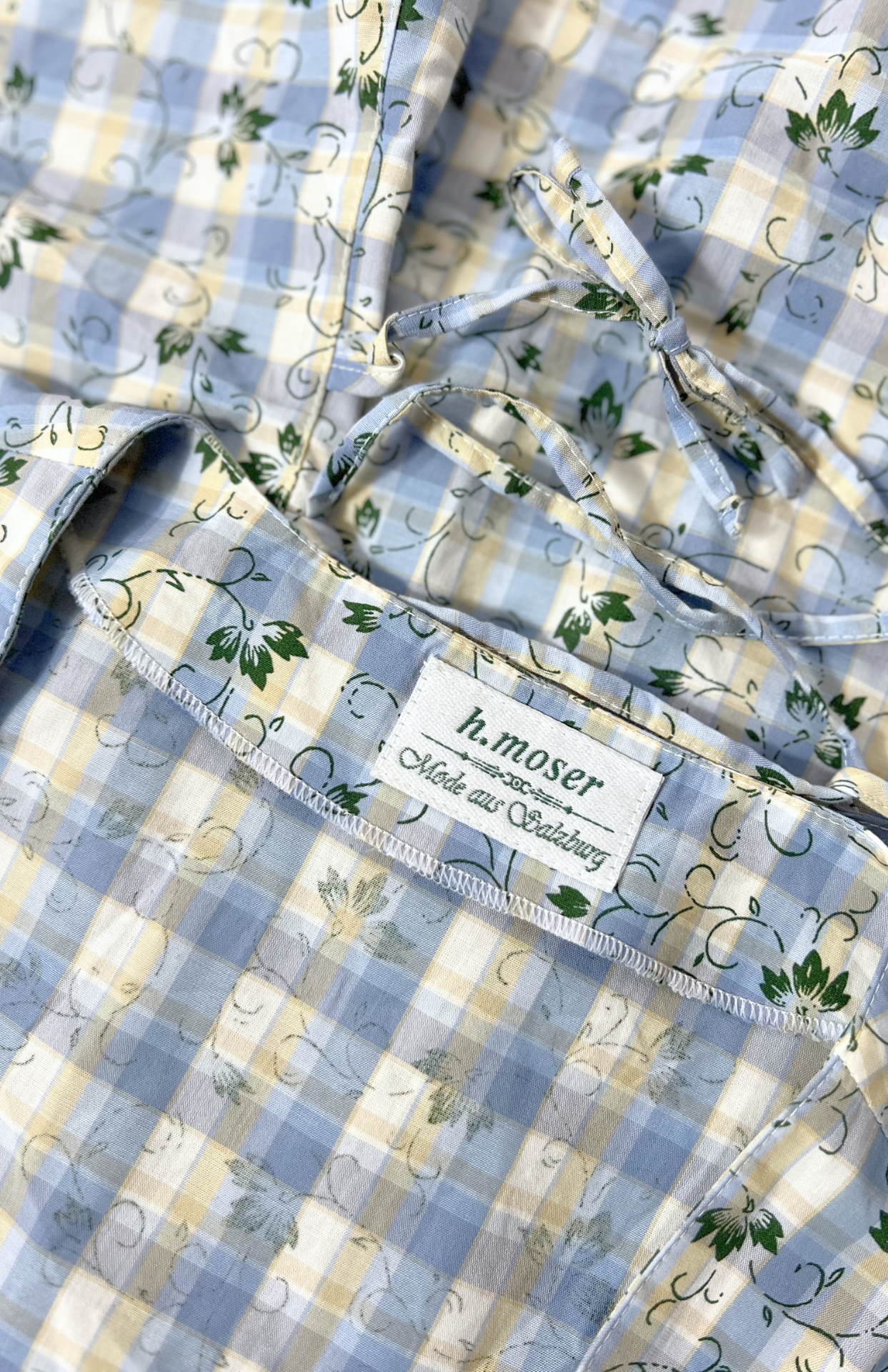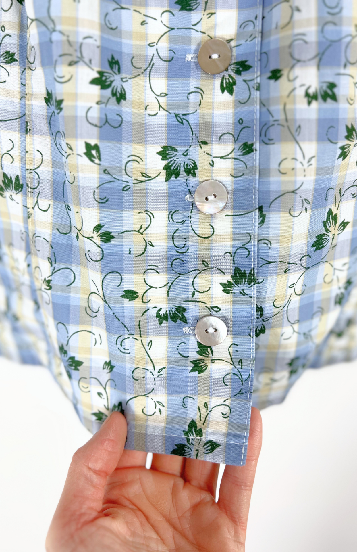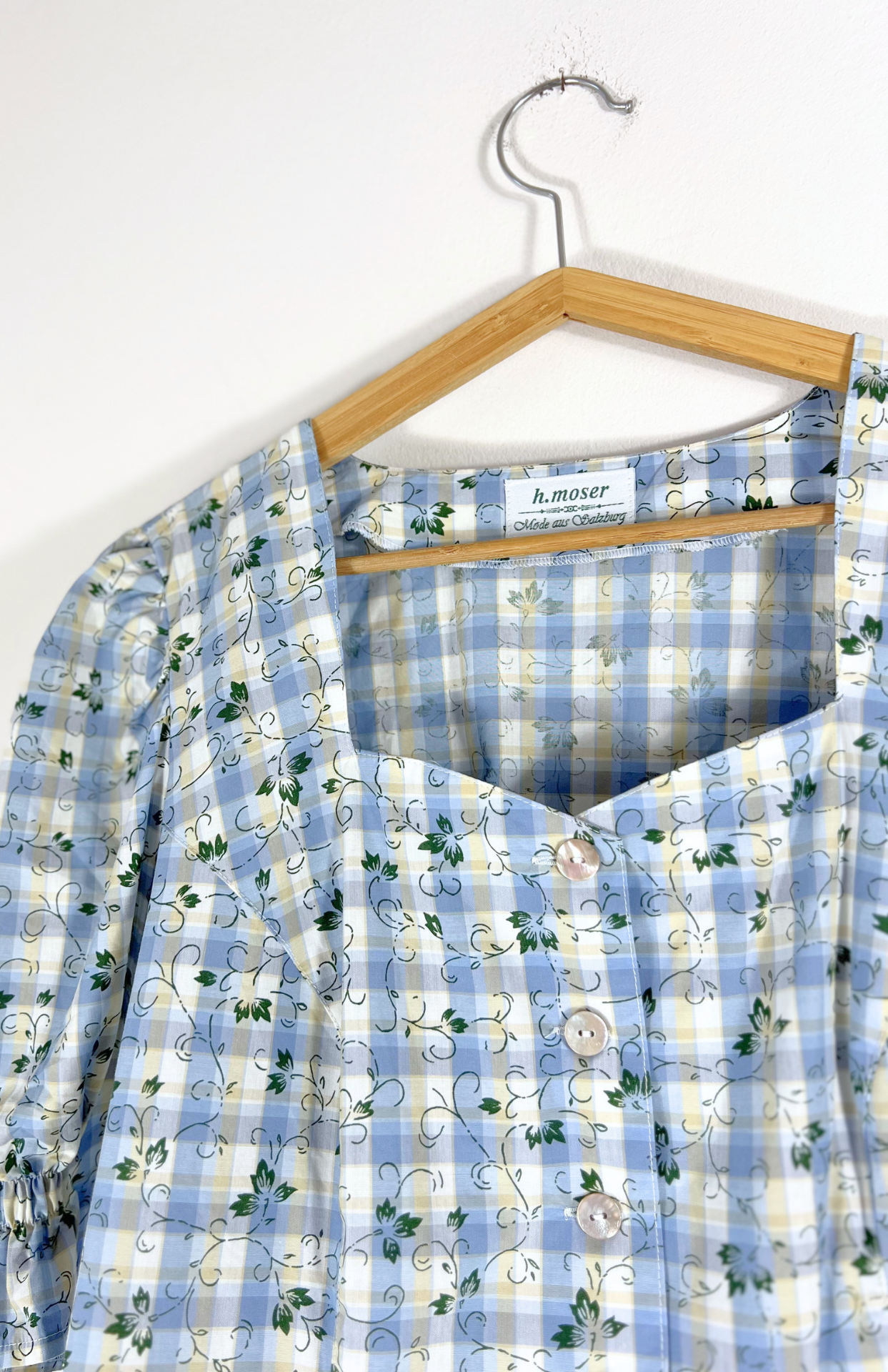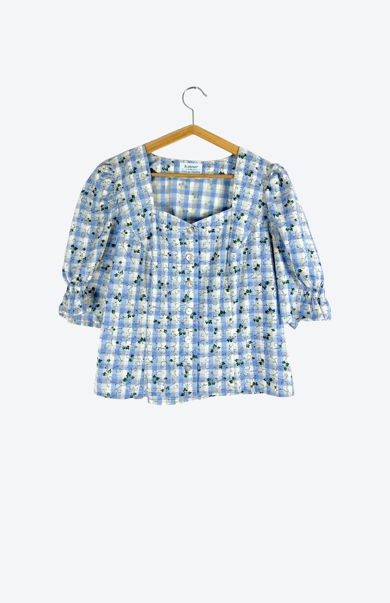 Trachtová vintage halenka se šněrováním. Má drobný tmavě zelený květinový vzor, nabíraný rukáv a perleťové knoflíčky. Utažení se šněrováním na zádech.