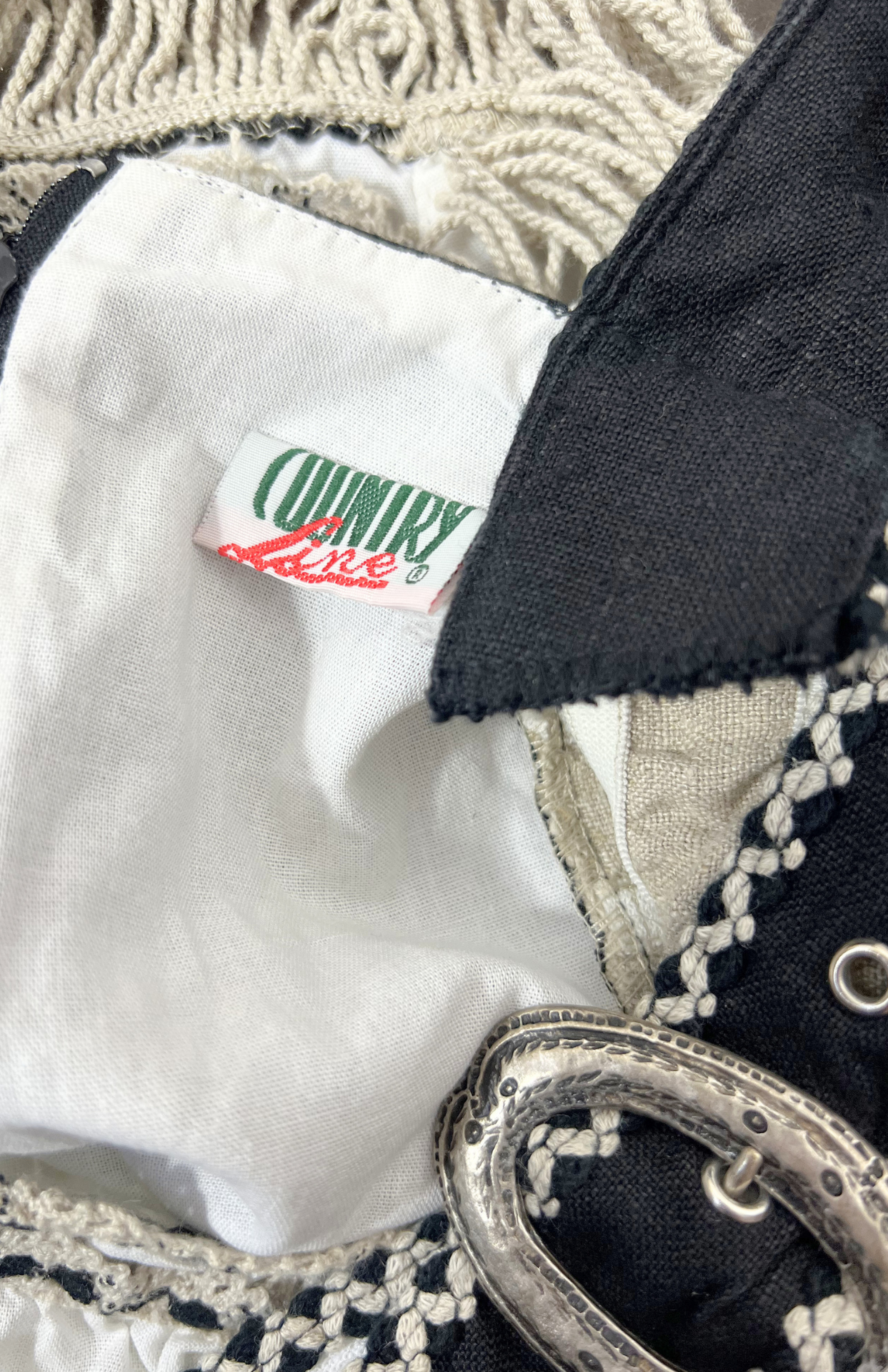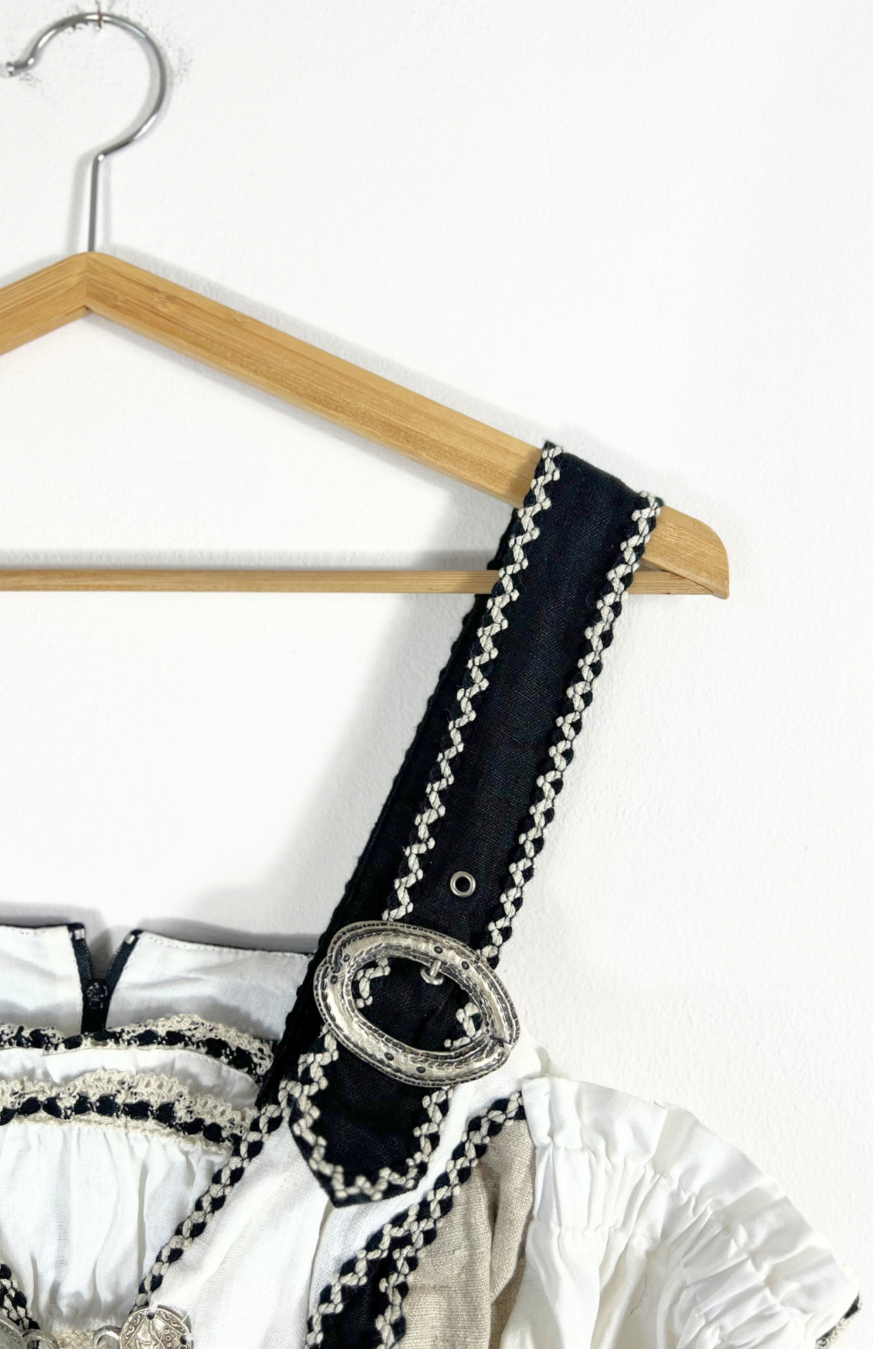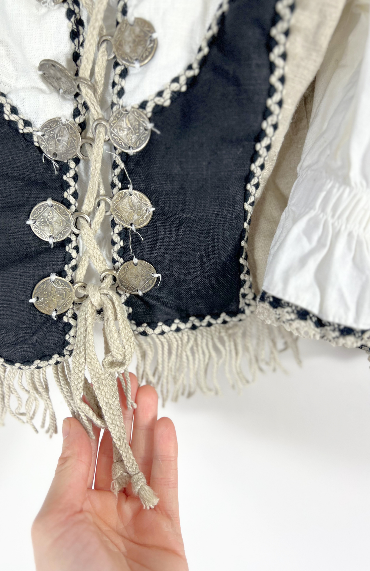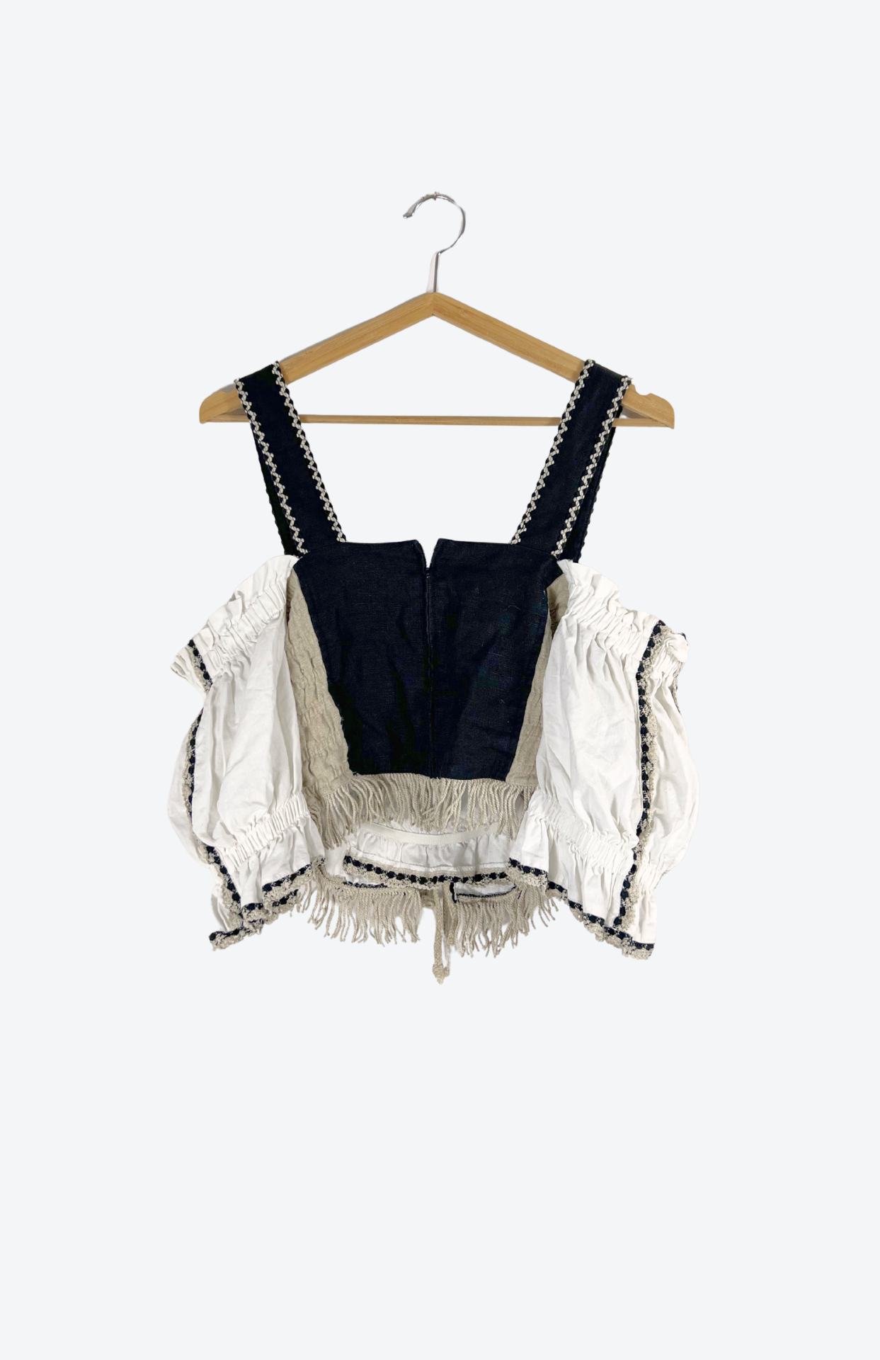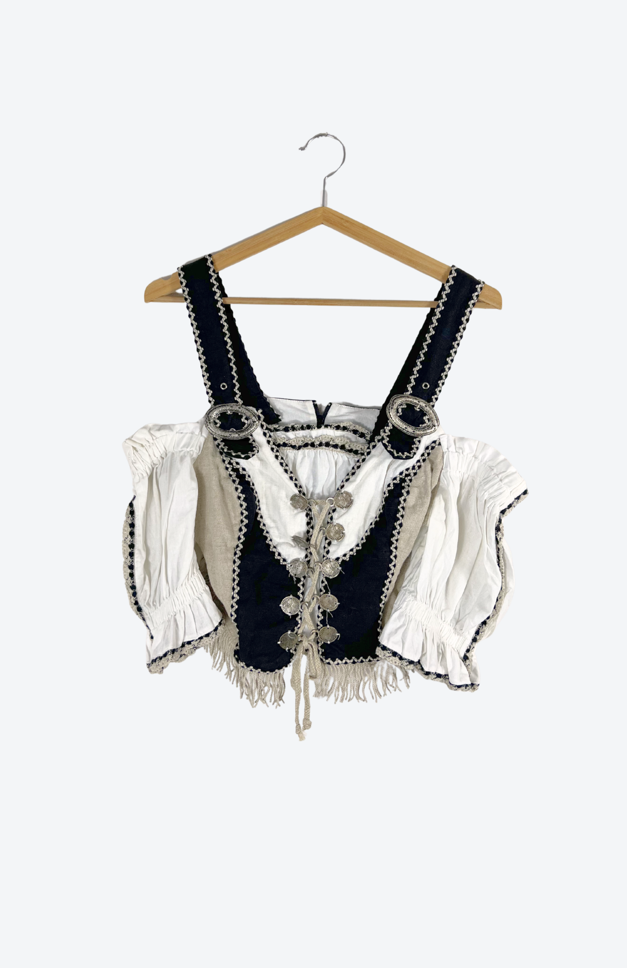 Folklorní vintage halenka se šněrováním. Originální, bohémský kousek s výraznými detaily. Nastavitelná ramínka na silné řemínky s přezkou. Krásné detaily a třásně na spodní části.