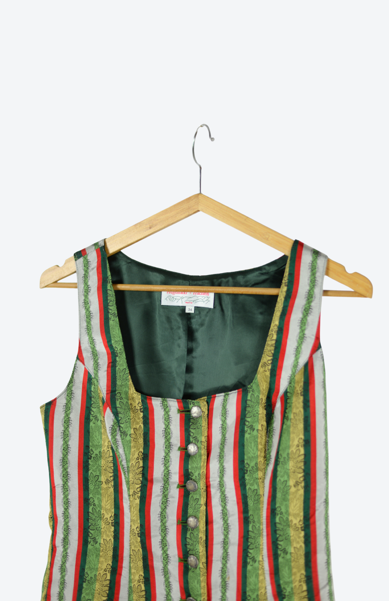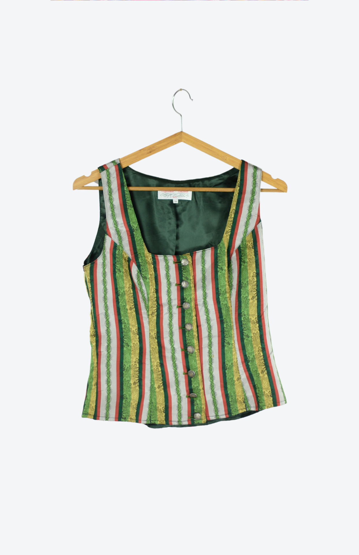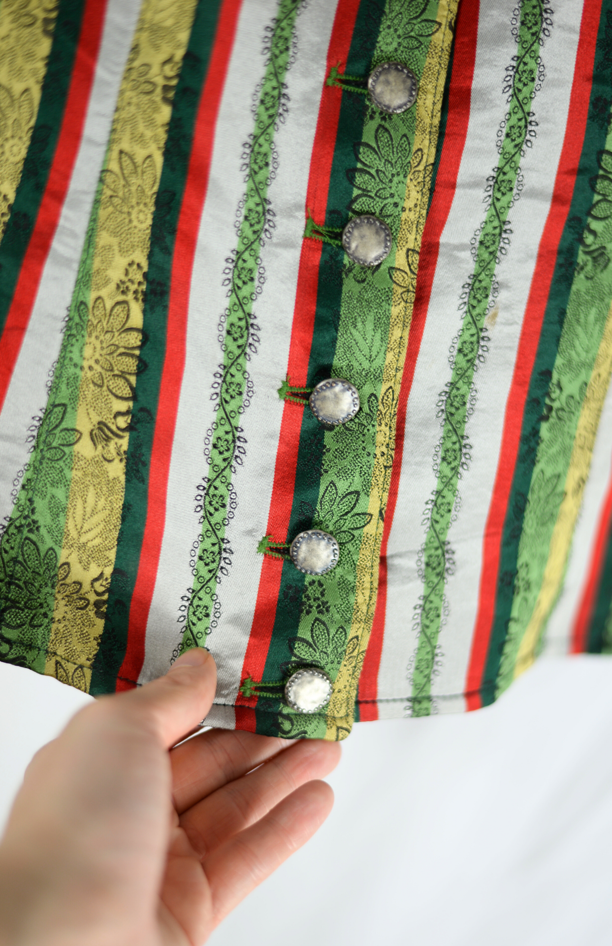 Hedvábná vesta s folklorním vzorem a barevnými proužky. Propínací na zdobené kovové knoflíčky. Originální trachtový kousek.