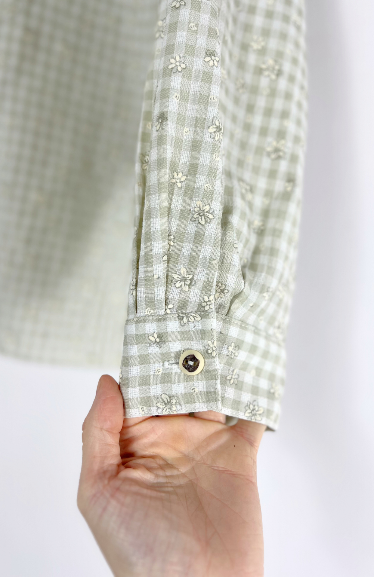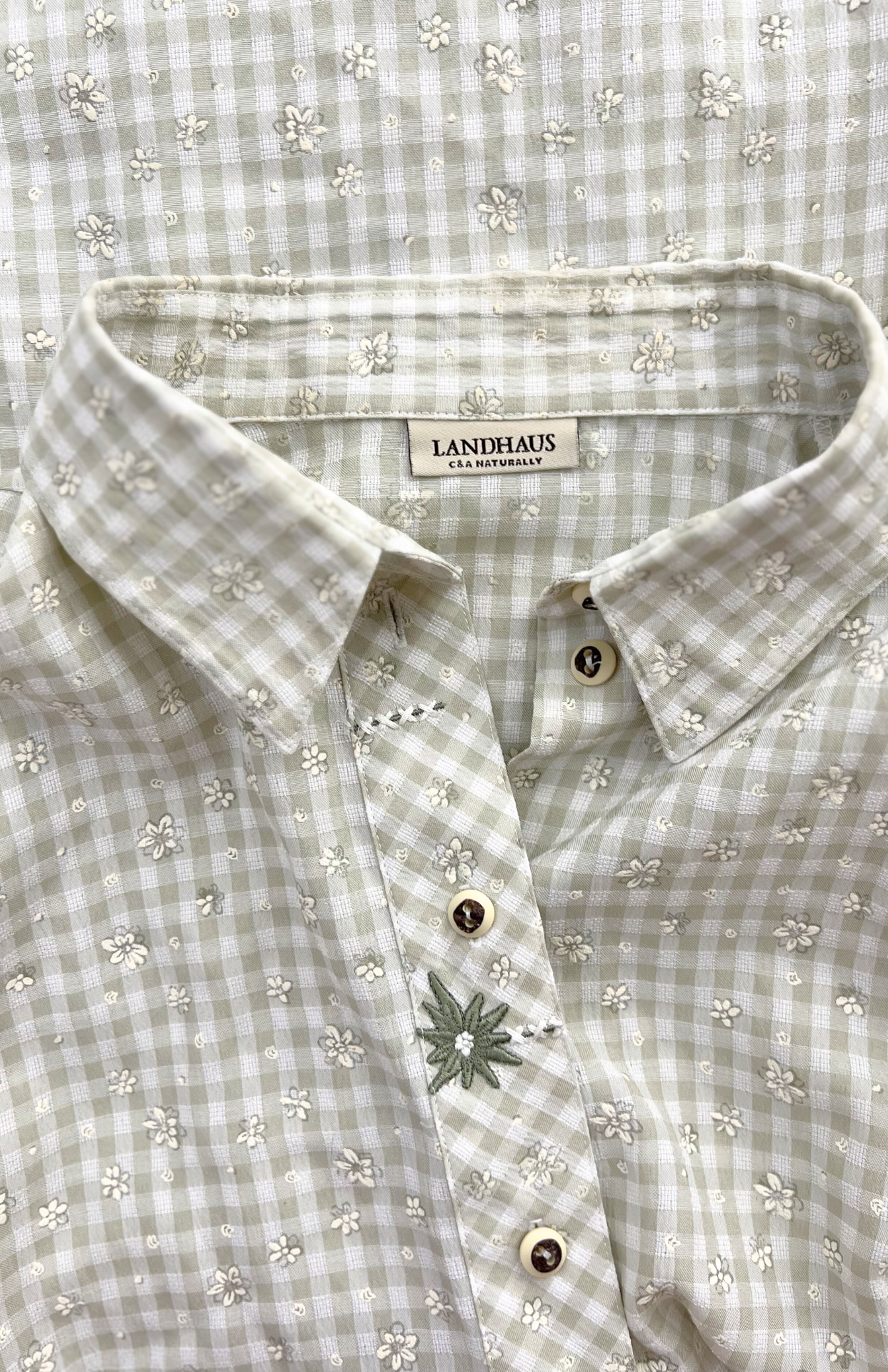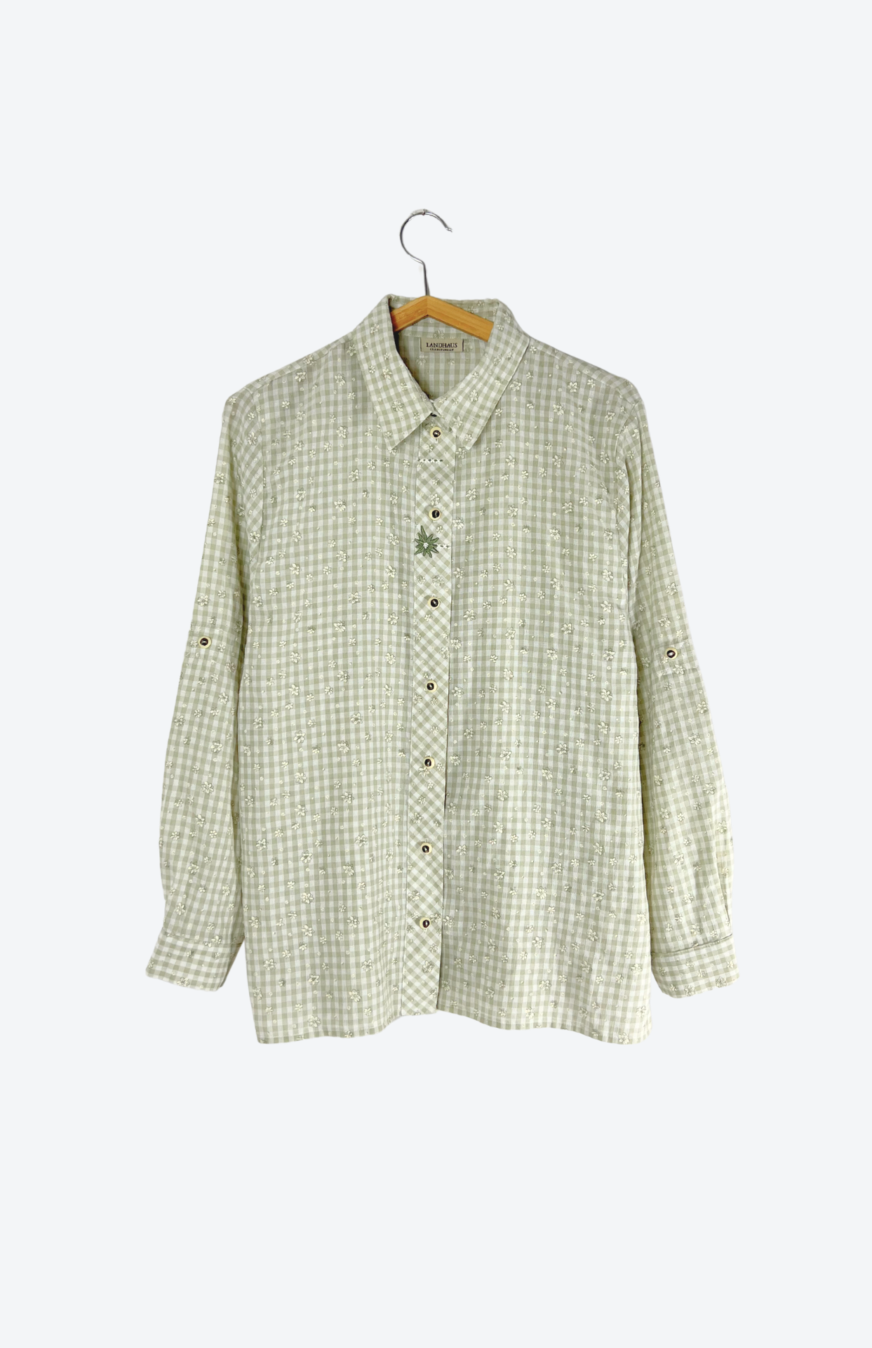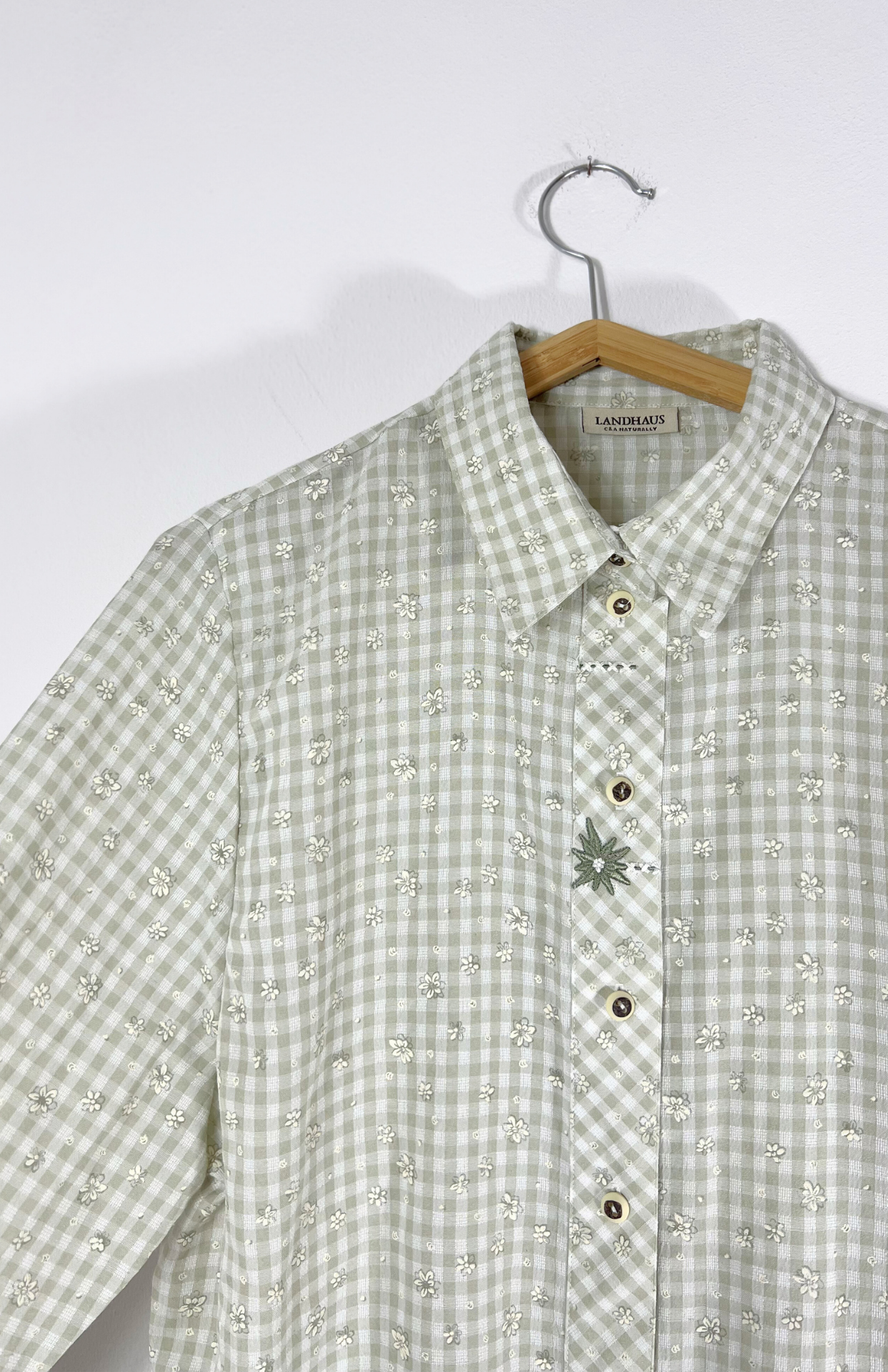 Folklorní košile se světlou kostkou a vzorem s kvítky. Má výšivku s protěží, drobný myslivecký knoflík a volný střih.