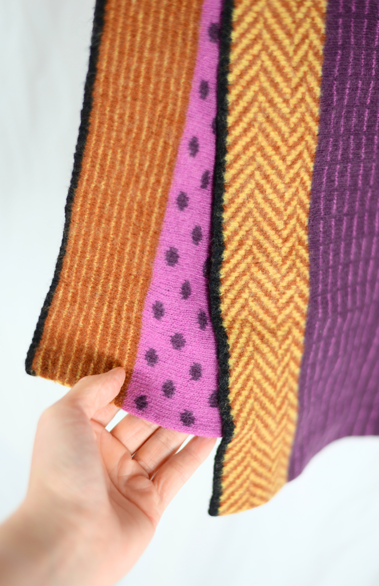 Hodně funky barevná šála. Proužky, puntíky a perforovaný vzor. Moc pěkně zpracovaný a velmi teplý kousek.