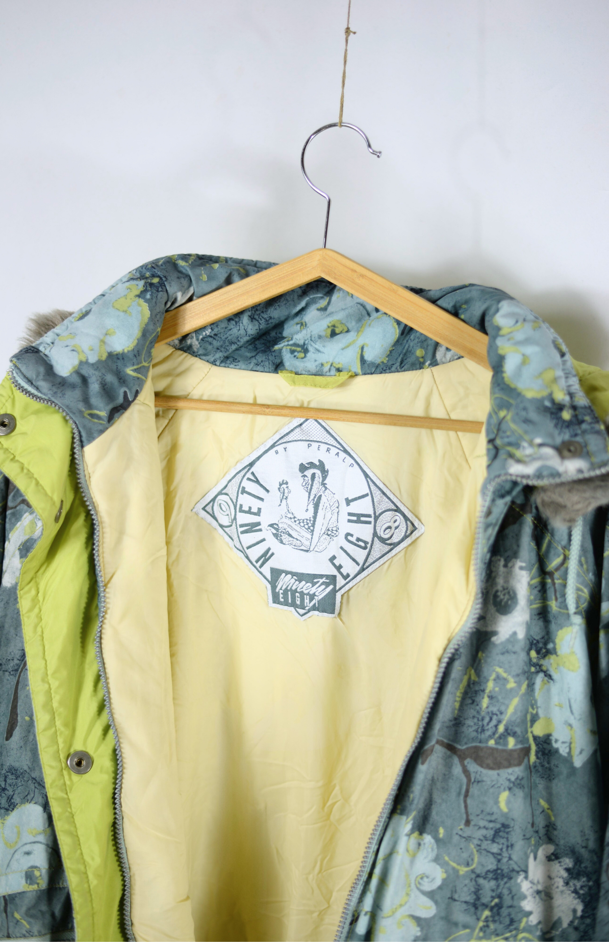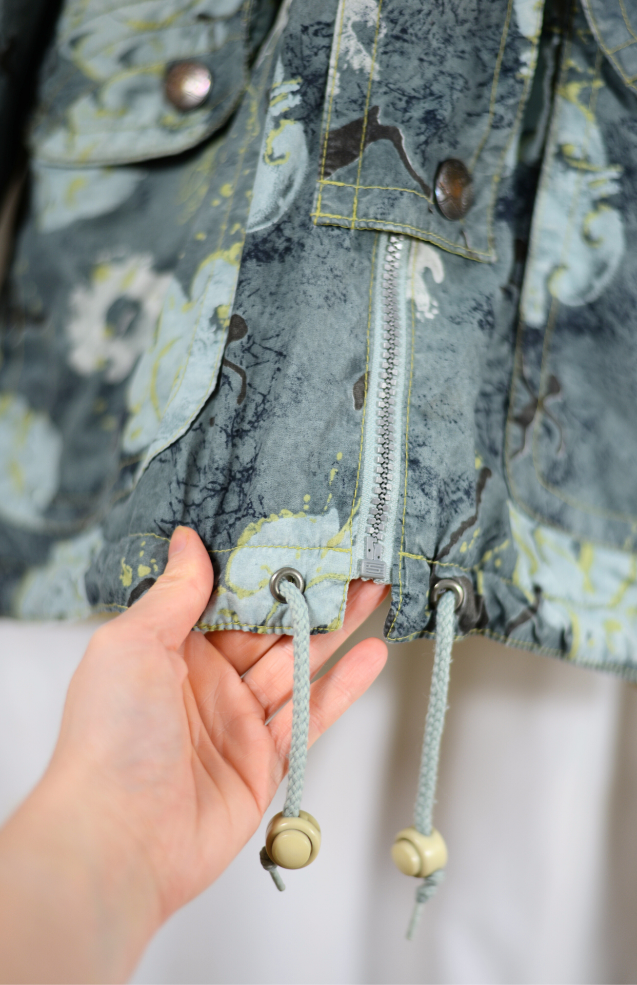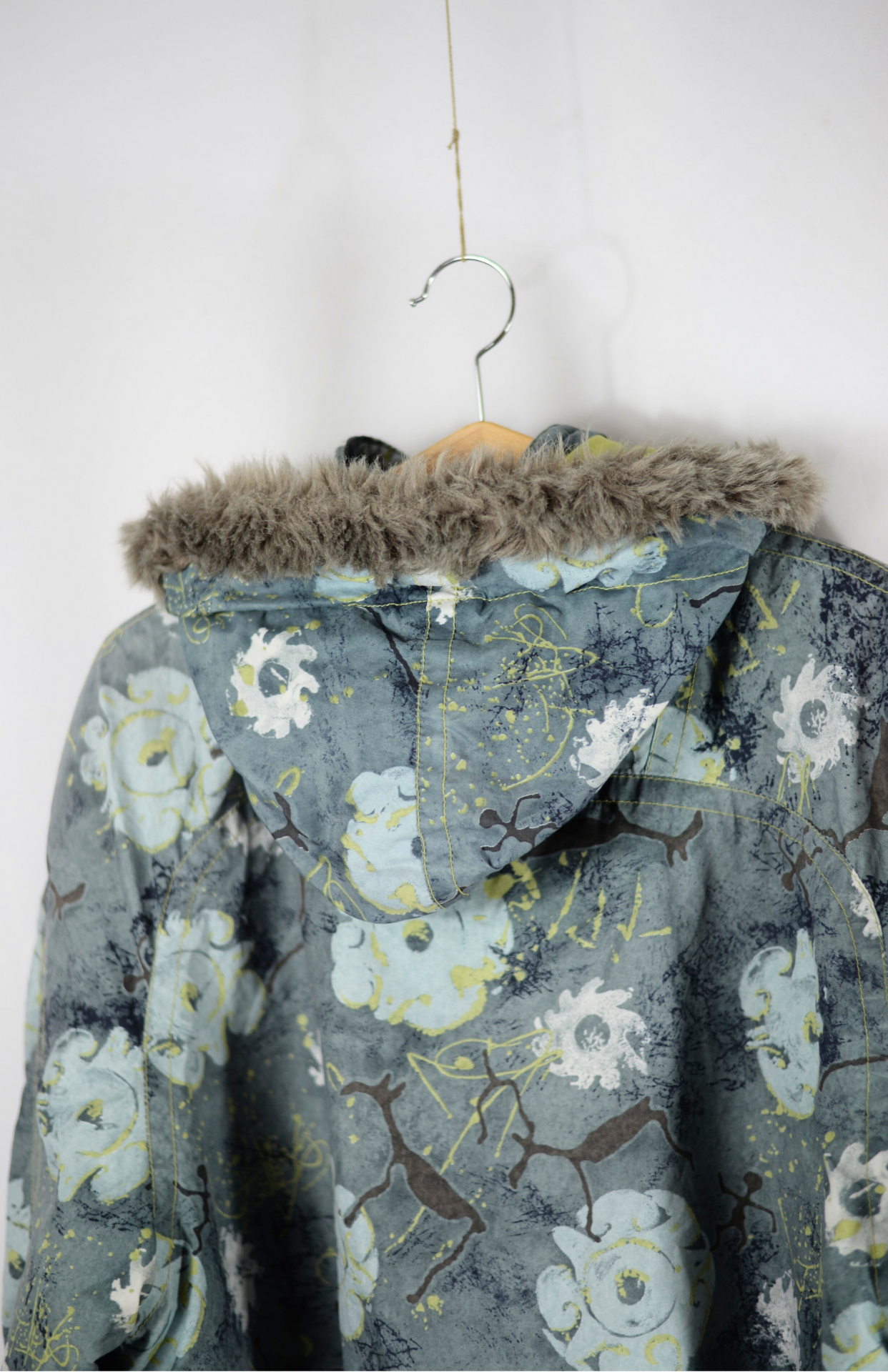 Oldschool bunda s květinovým vzorem. Má volný rukáv, odnímatelnou kapuci s umělým kožíškem vzadu, zapínání na druky a kapsy po stranách.
