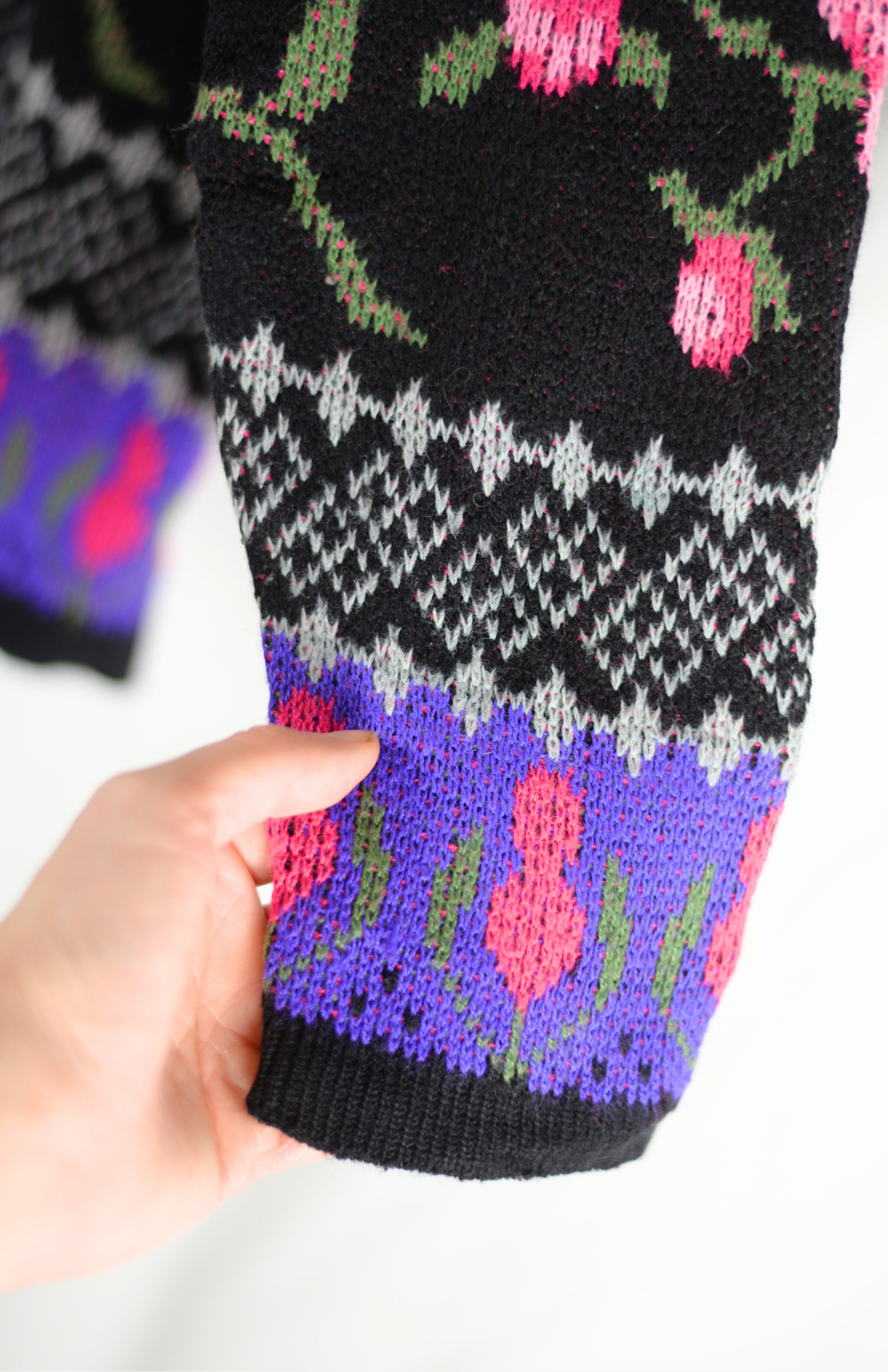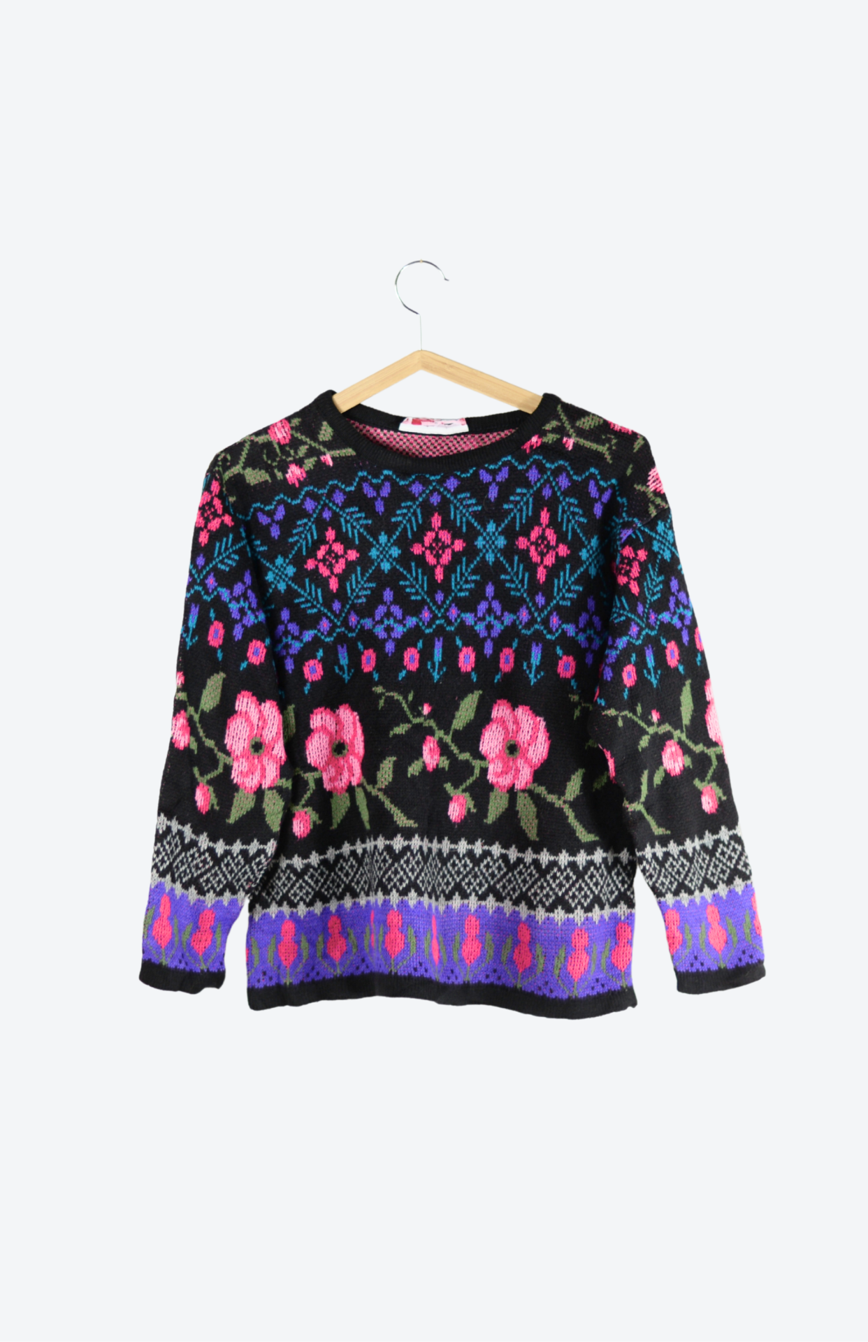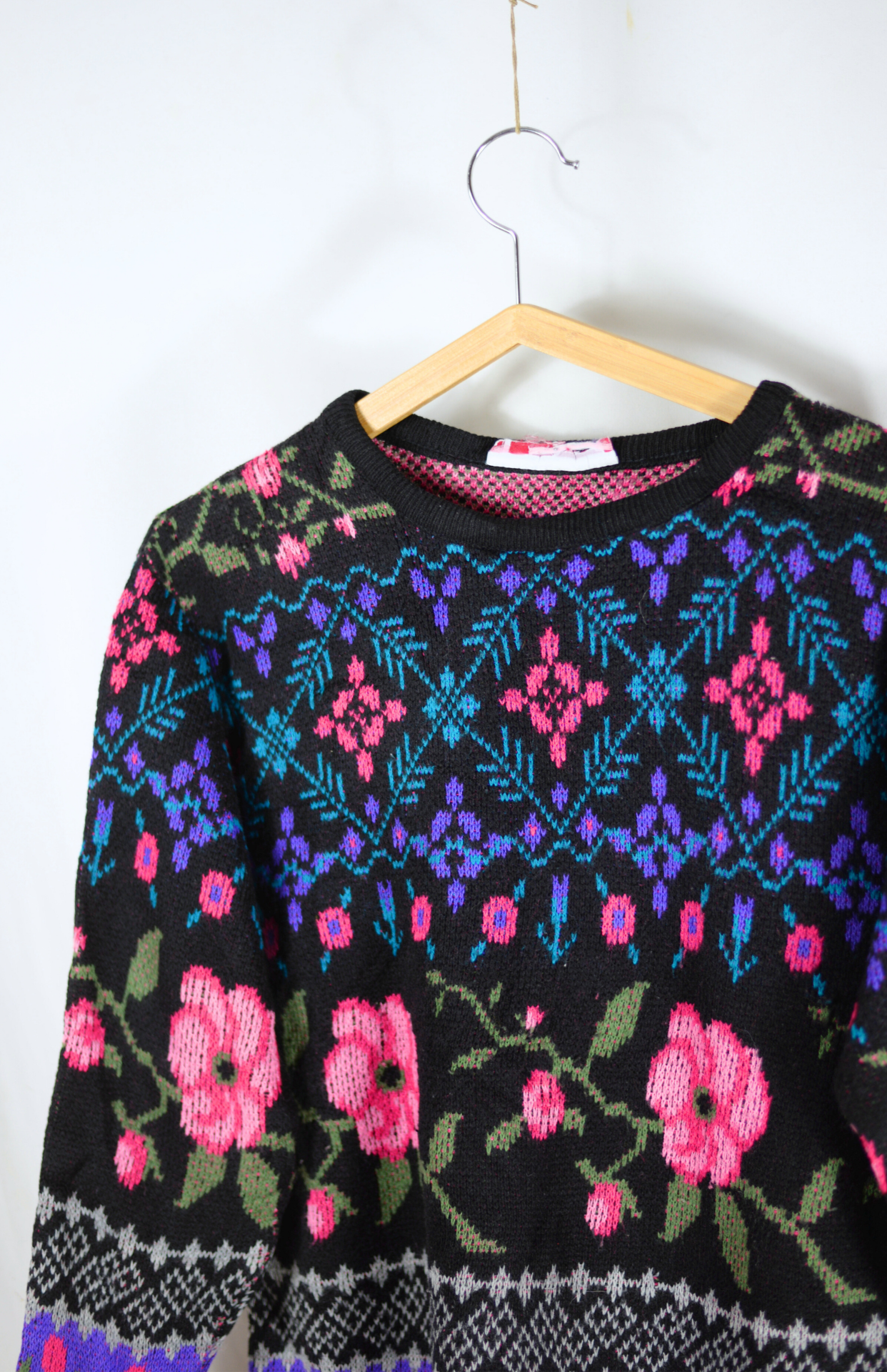 Vinatge svetr s funky květinovým vzorem. Má kratší střih a středně silný úplet. Originální a pěkně zpracovaný.Stav: Vintage kousek ve skvělém stavu, bez vad. Pouze drobné známky nošení.Materiál: bez cedulky
