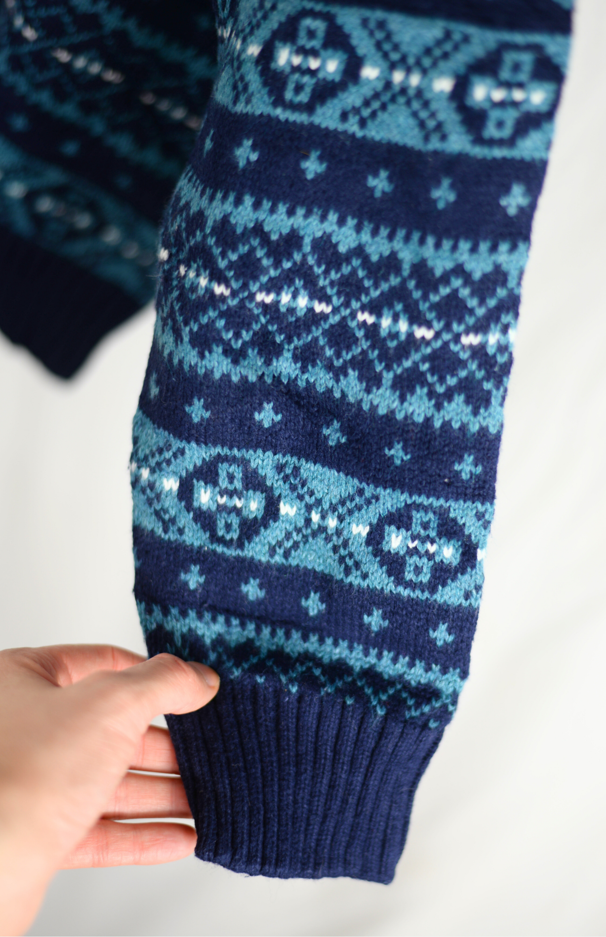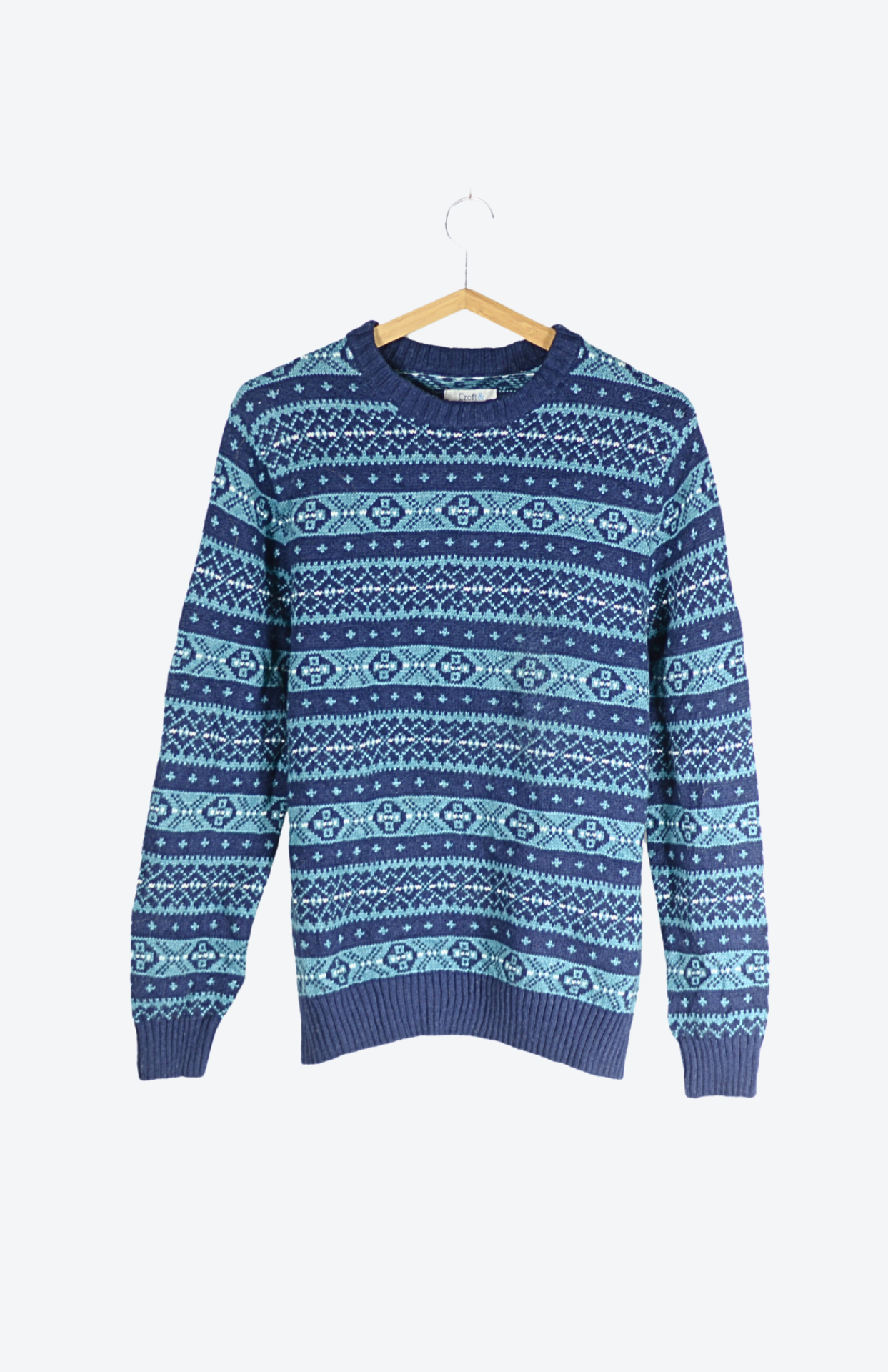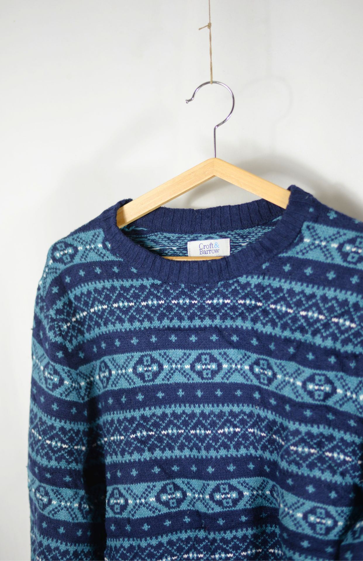 Modrý bavlněný vzorovaný retro svetr. Pěkný drobný vzor v proužcích po celé ploše. Příjemný unisex kousek.Stav: Ve skvělém stavu, bez vad.