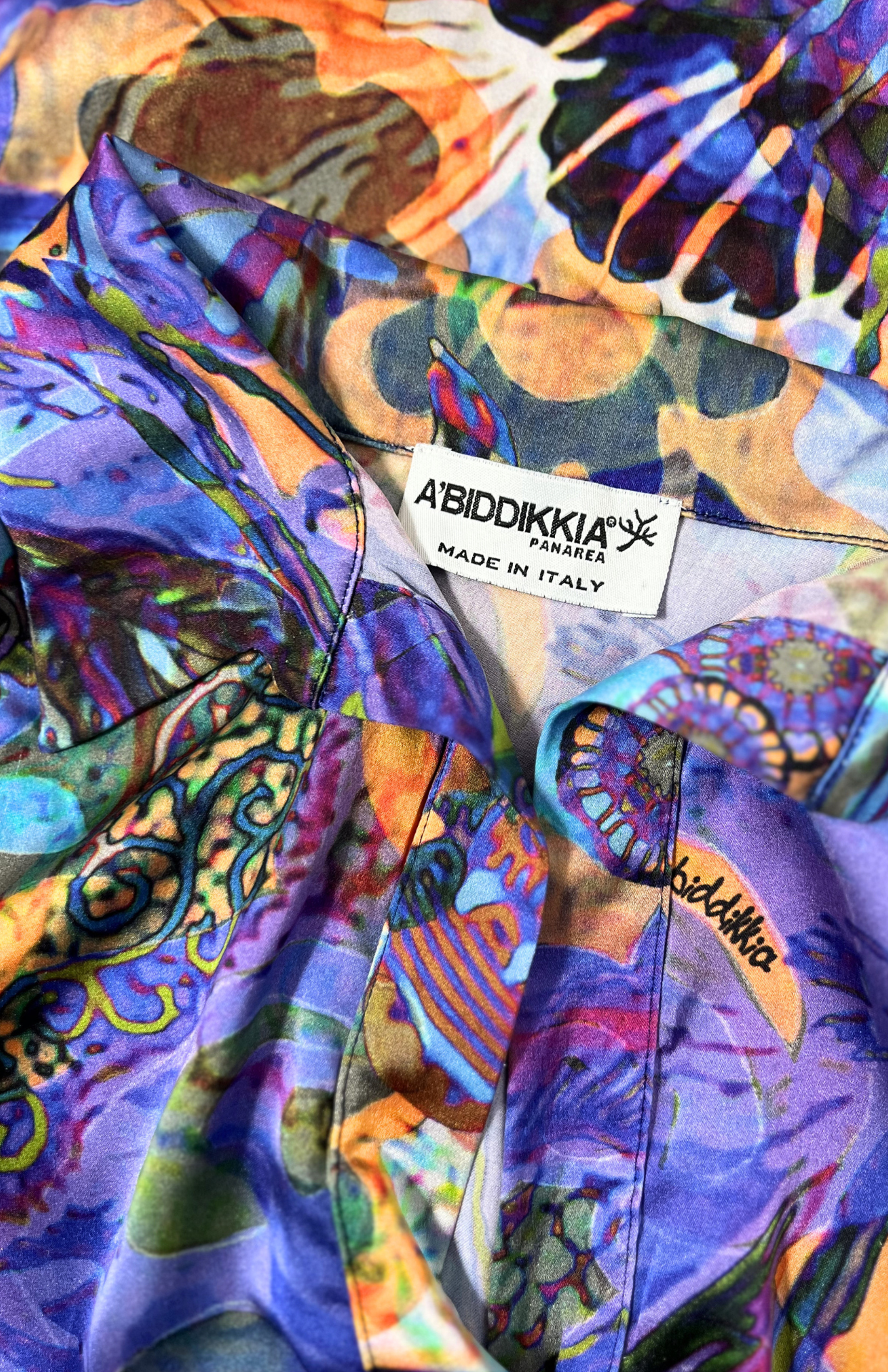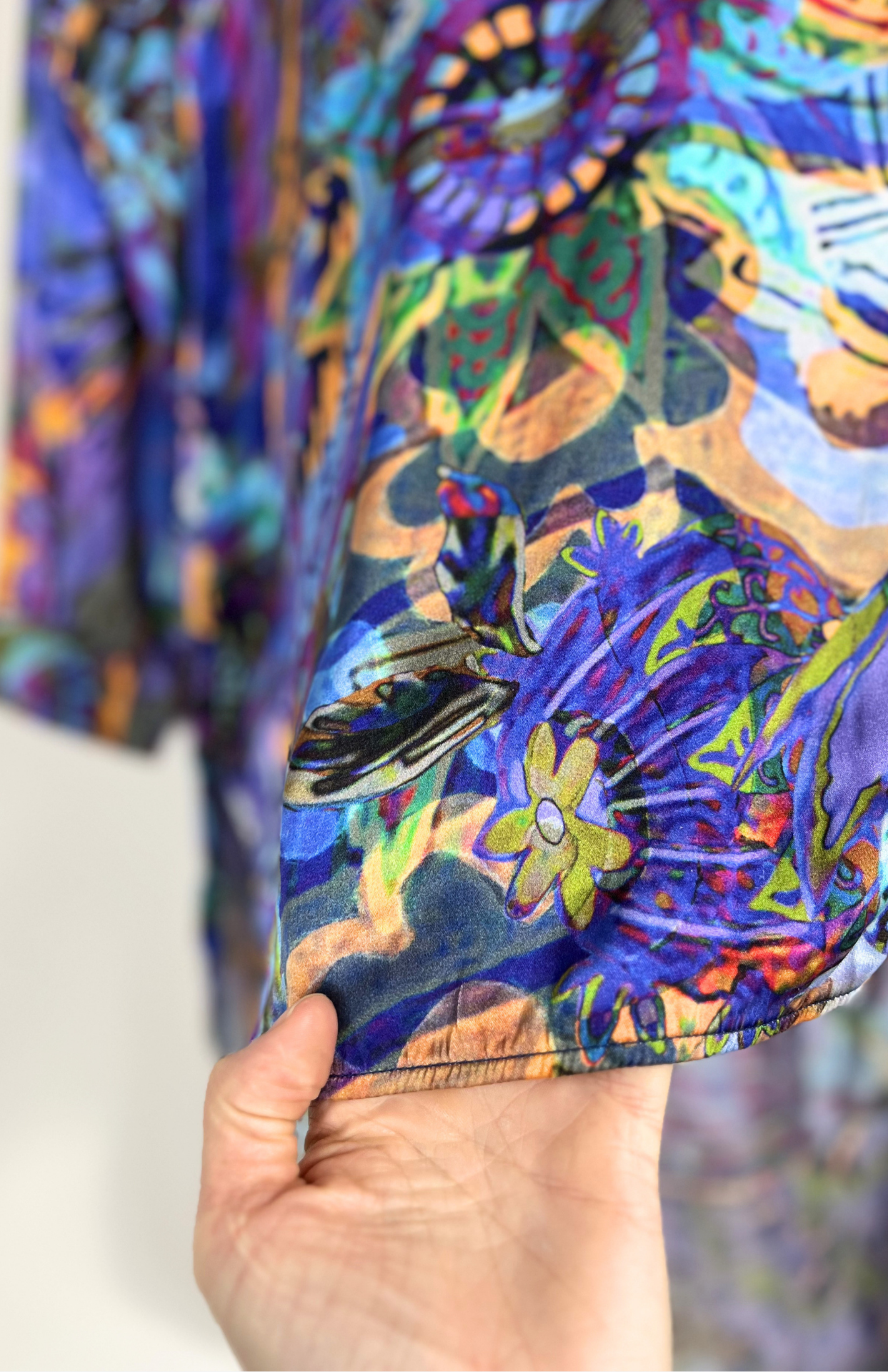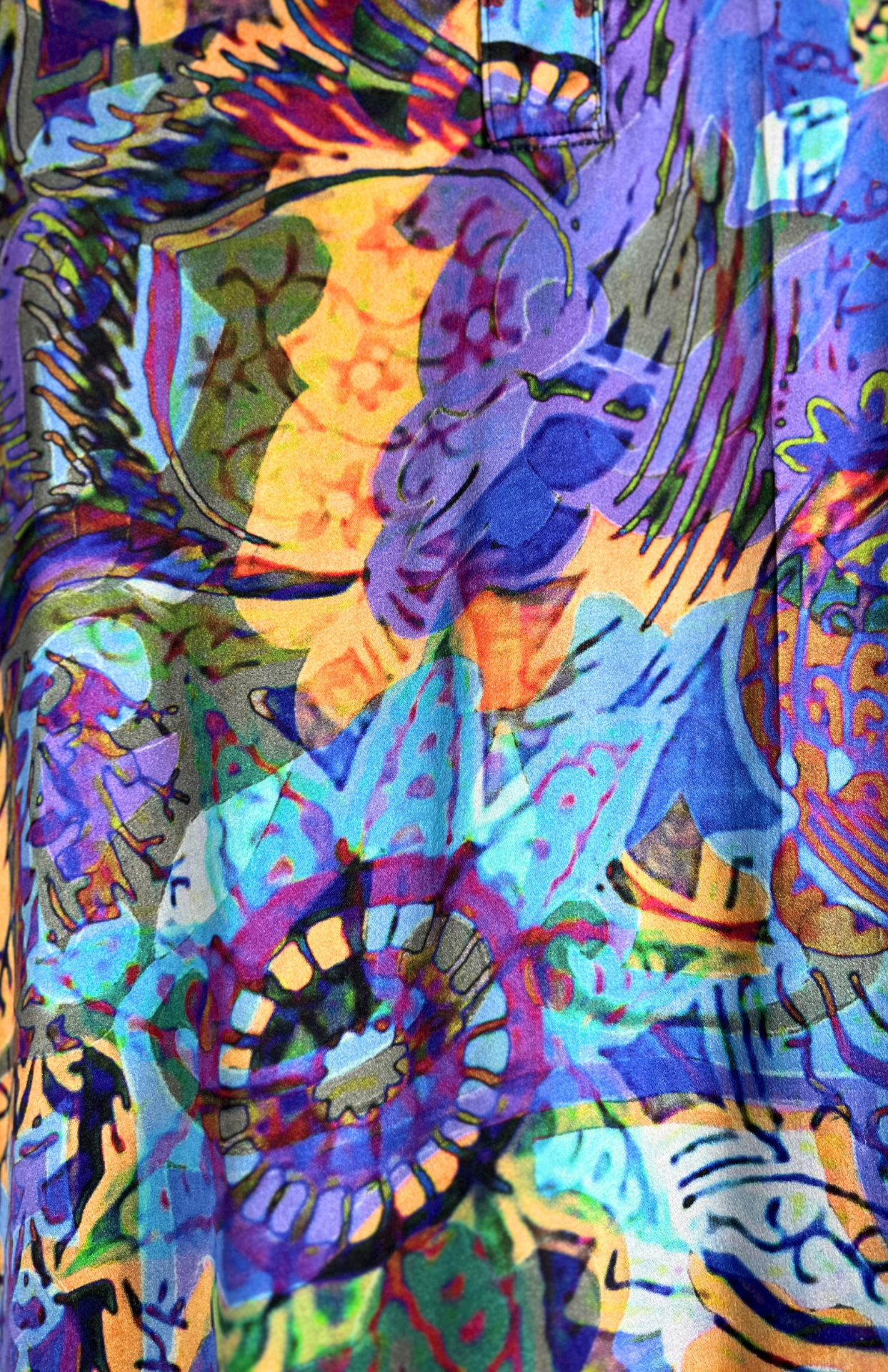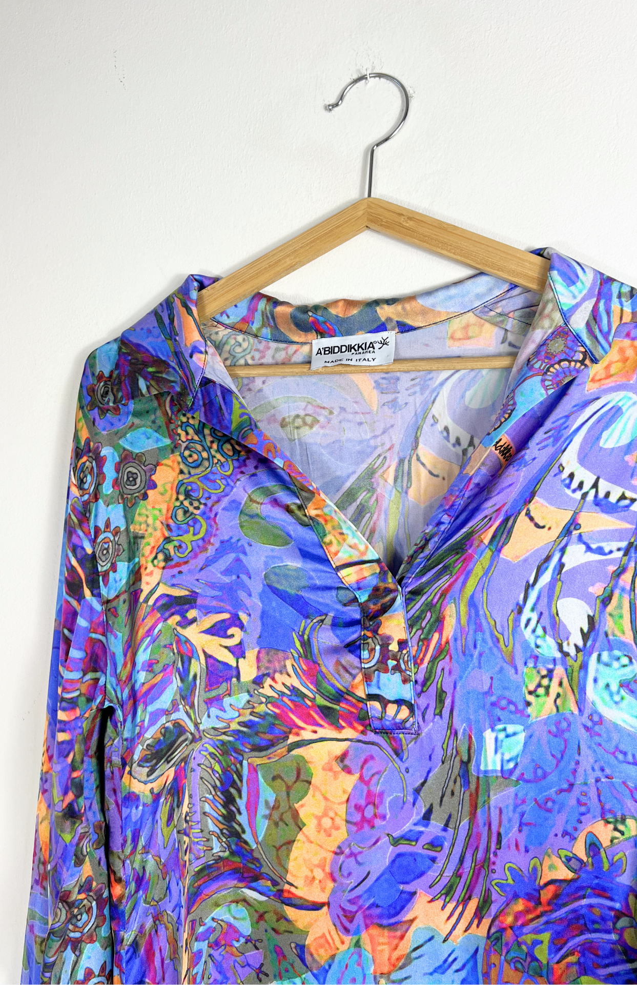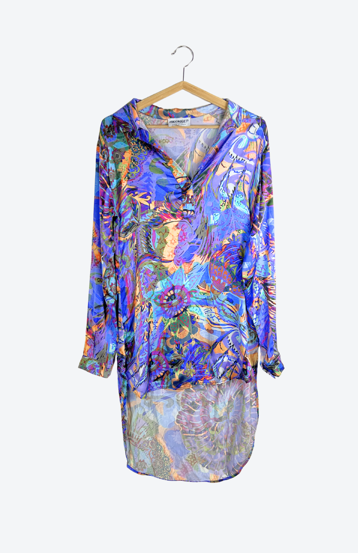 Originální barevné šaty s výrazným malovaným vzorem. Mají lehce košilový střih s límečkem a prodlouženou délku vzadu. Originální a zajímavě zpracovaný kousek.