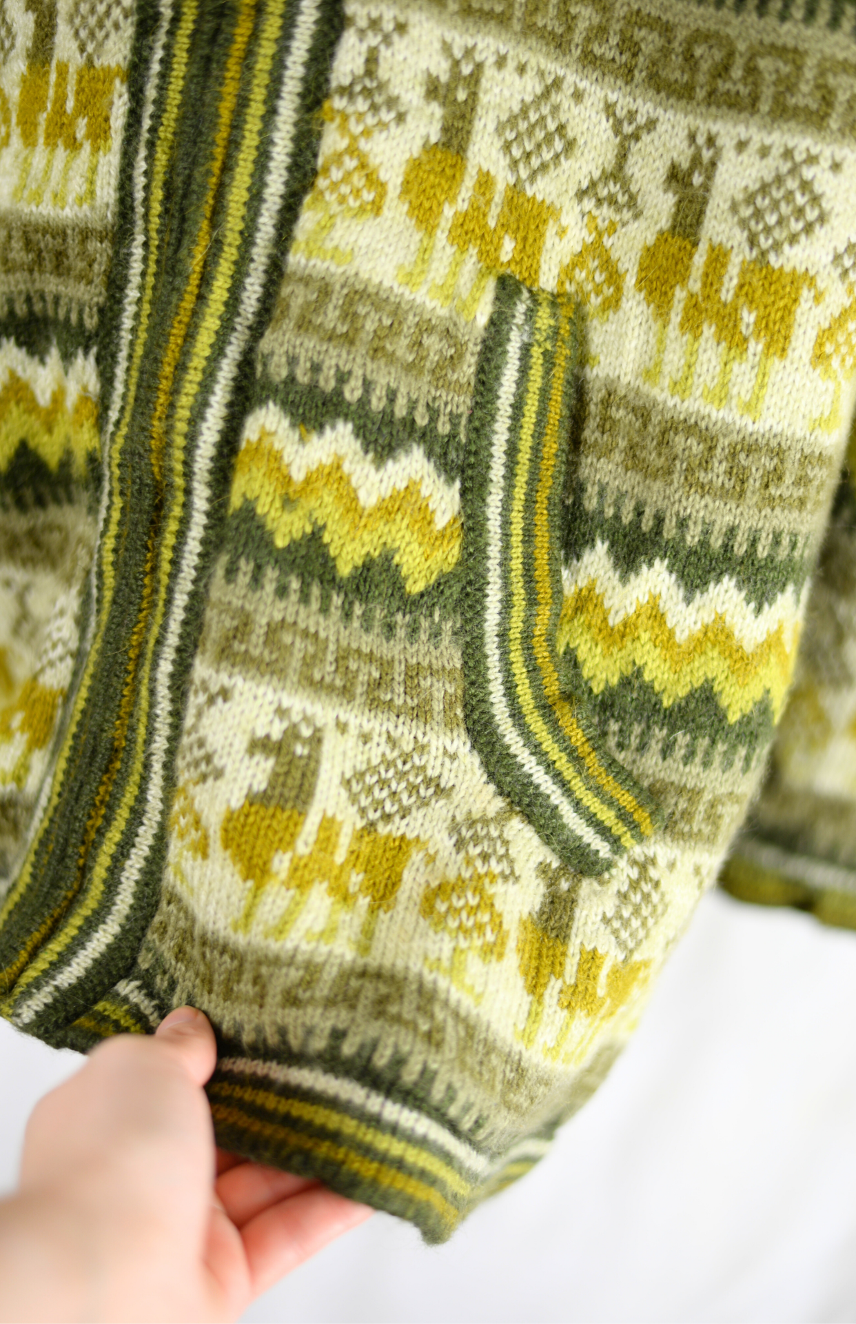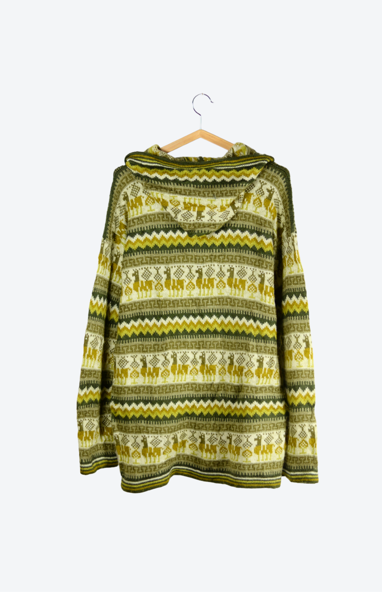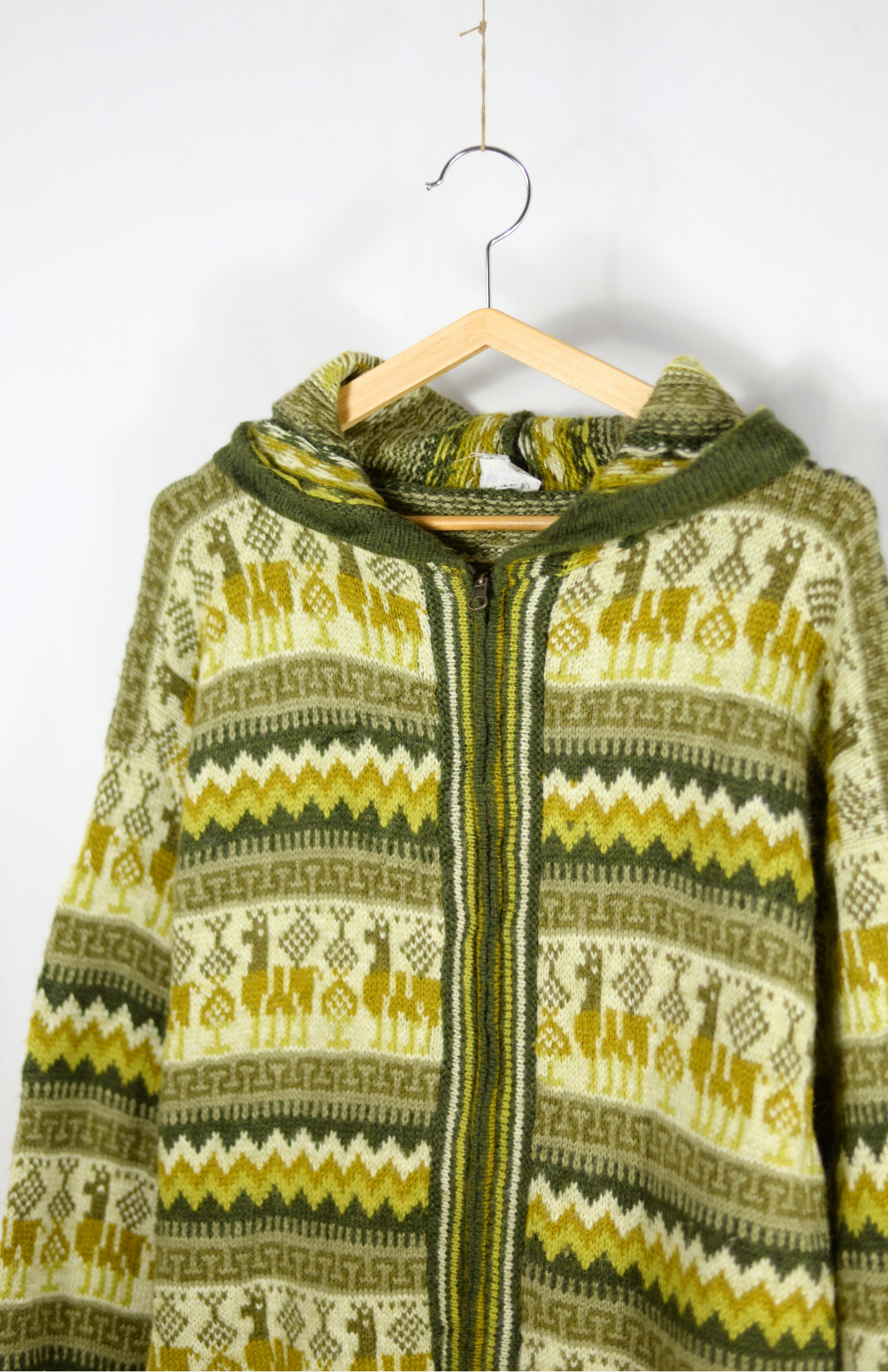Vinatge svetr s funky barevným vzorem s lamami. Má delší střih a jemnější, příjemný úplet. Zapíná se na zip, má kapsy na bocích a vzadu kapucu. Pěkně zpracovaný.