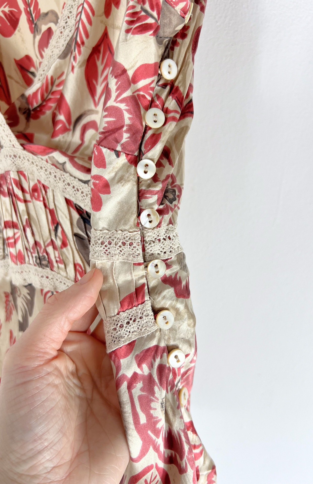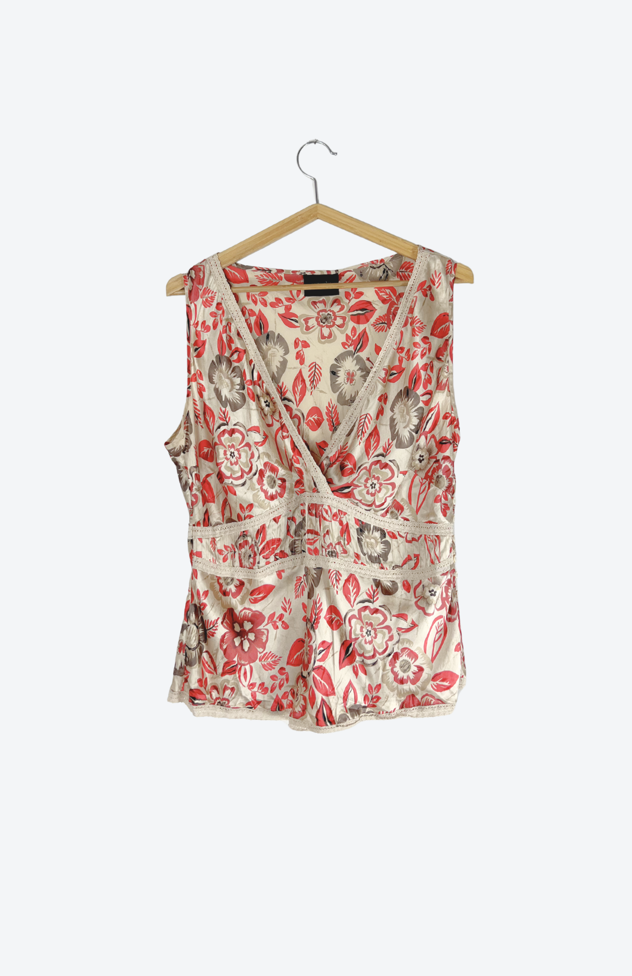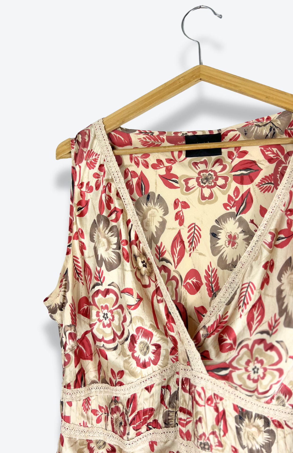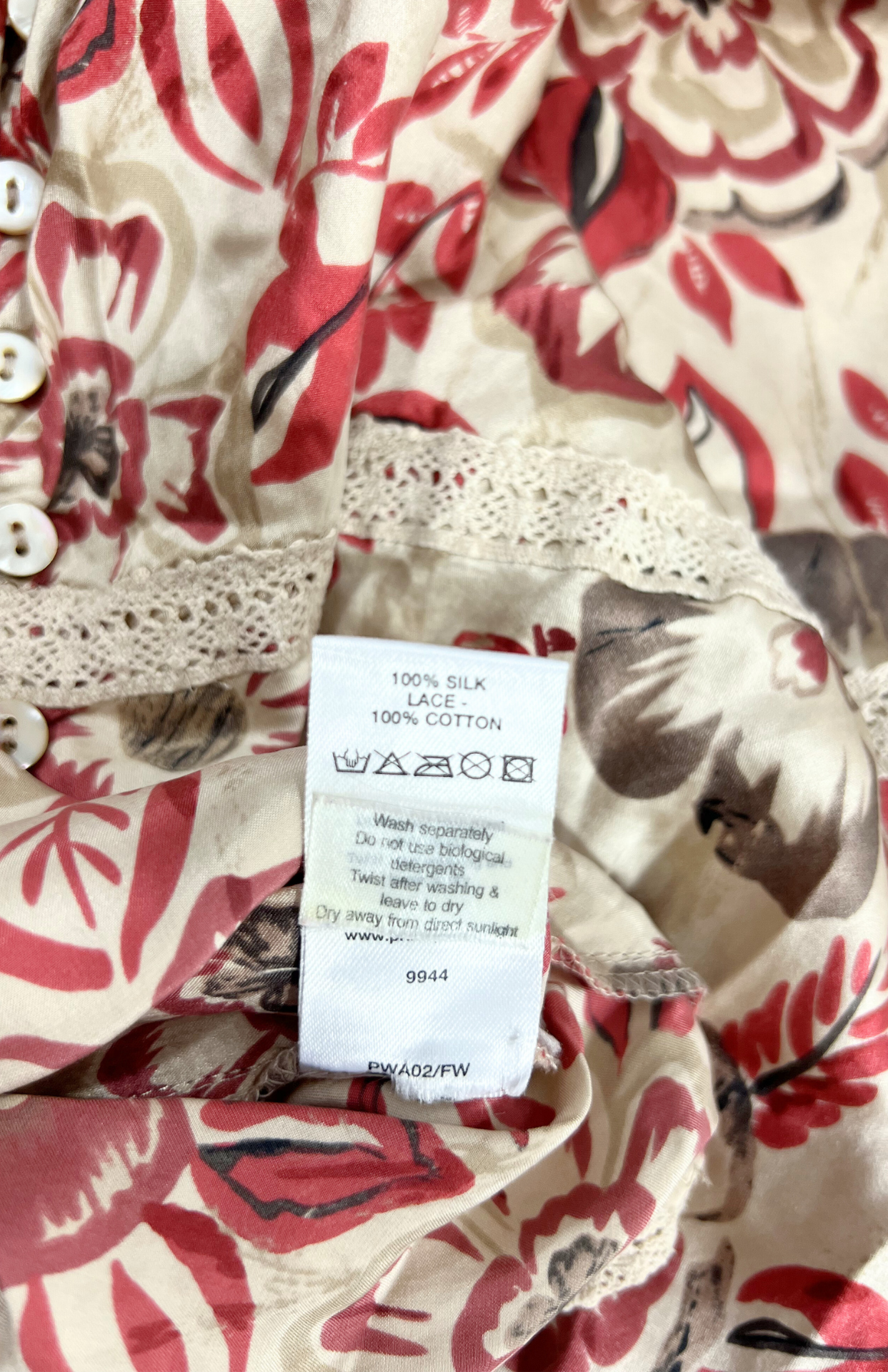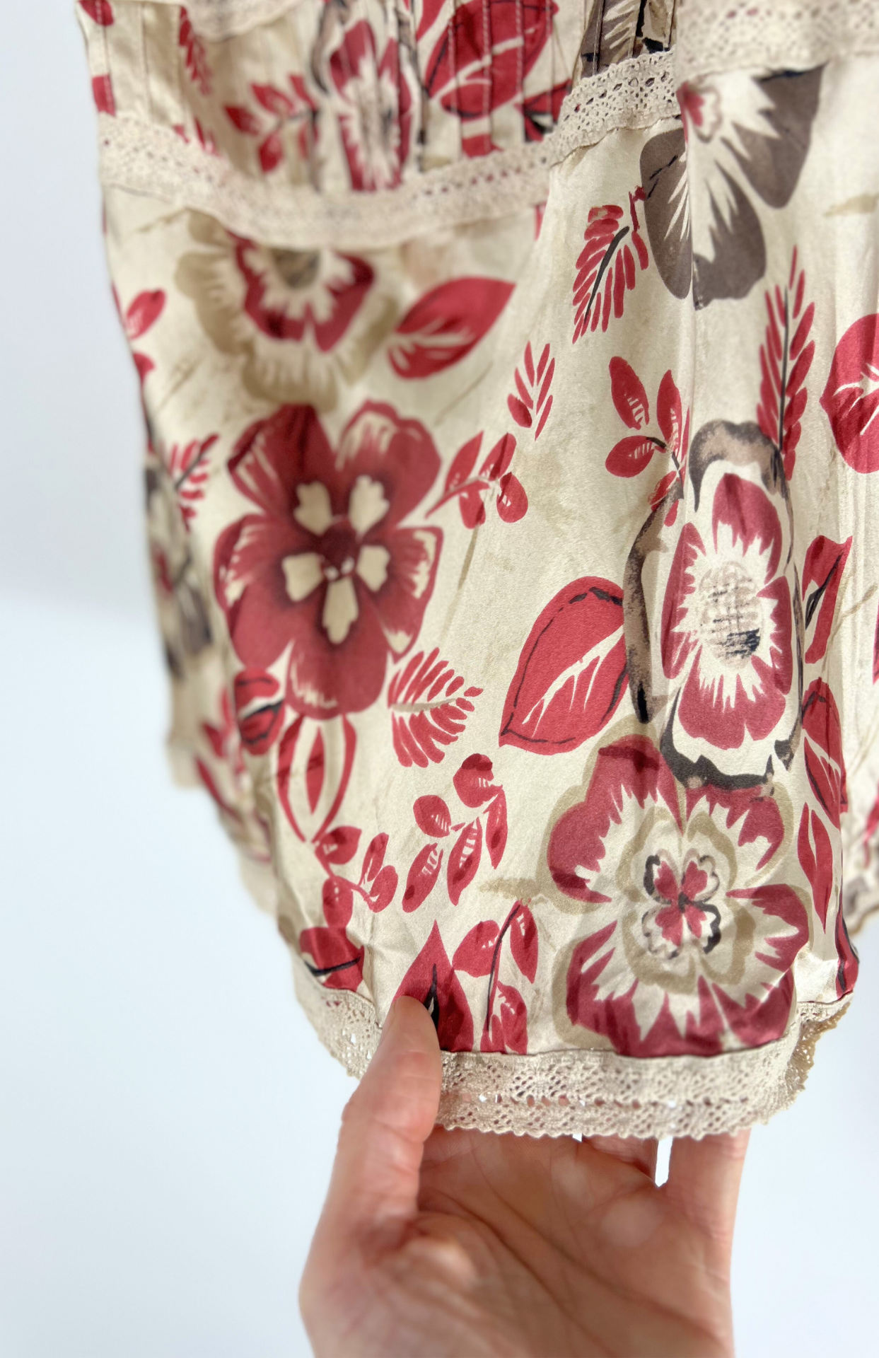 Hedvábný vzorovaný top s krajkou. Krásně zpracovaný - detail s plisé a obšívání krémovou krajkou. Příjemný kousek do horkých dní. Na boku zapínání na perleťpvé knoflíčky.