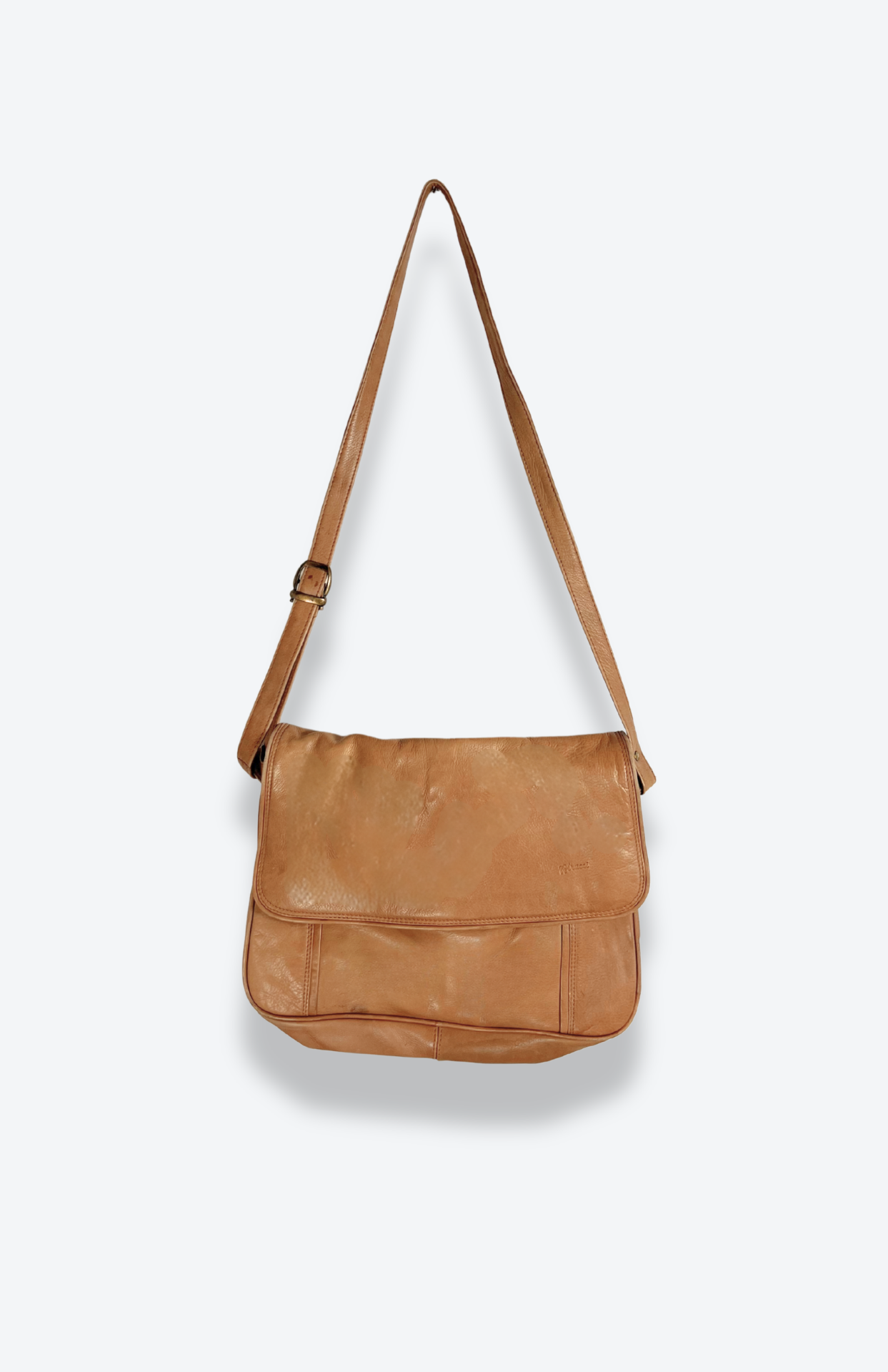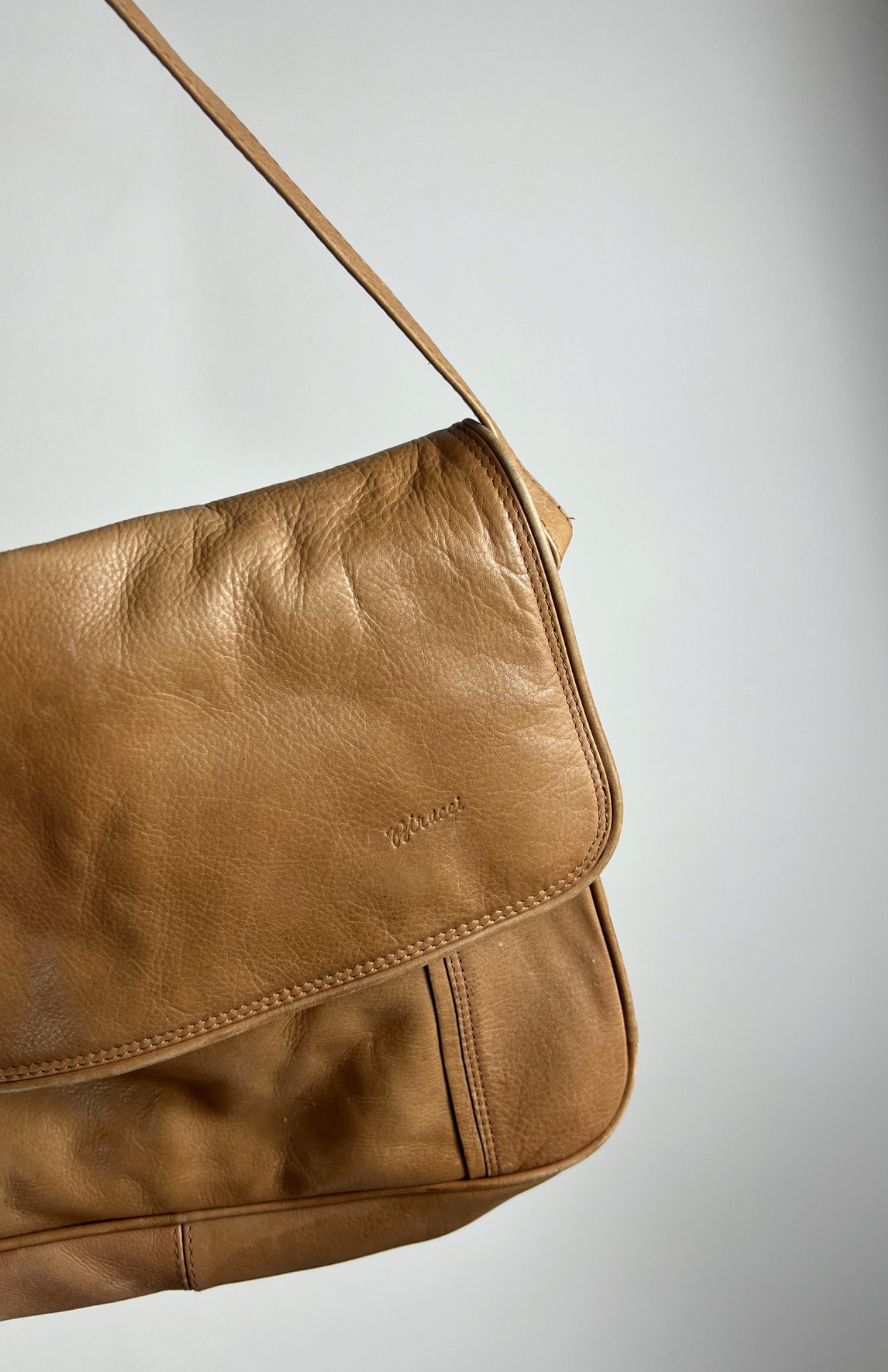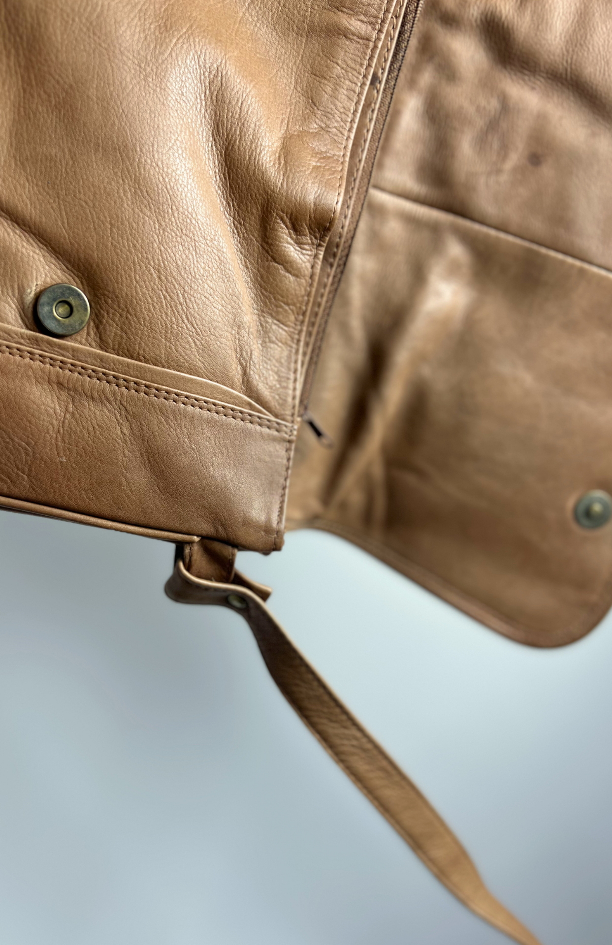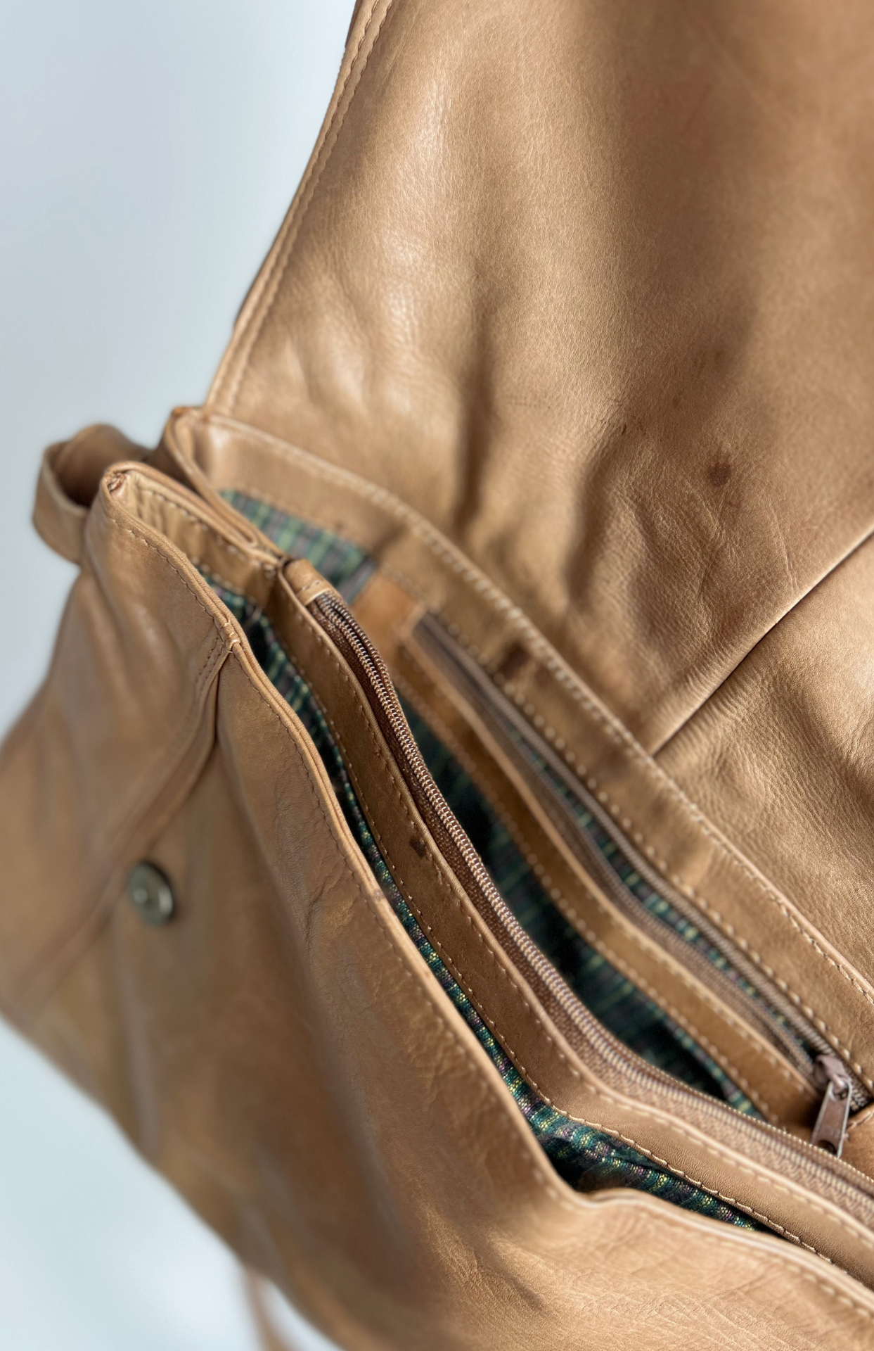Velká hnědá kožená retro brašna. Má zapínání na patenty a uvnitř bavlněnou proužkovanou podšívku. Několik přihrádek uvnitř.