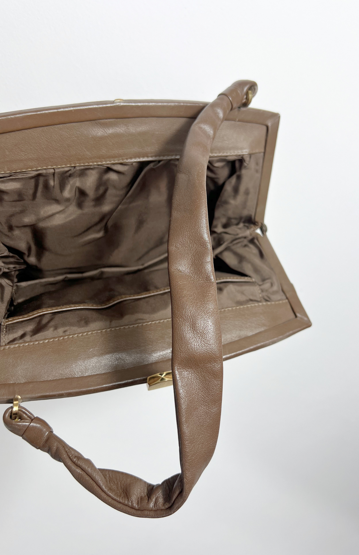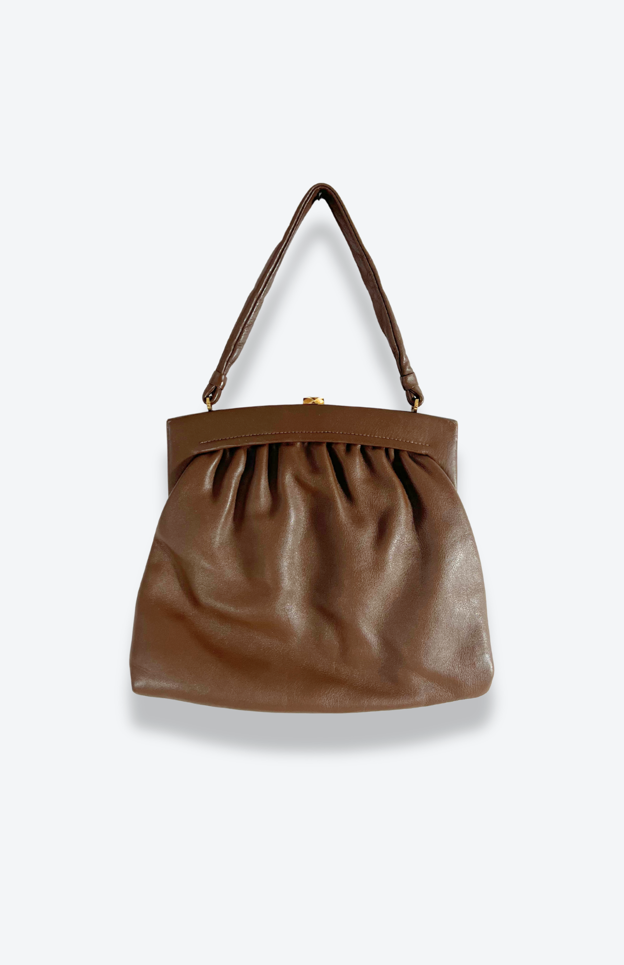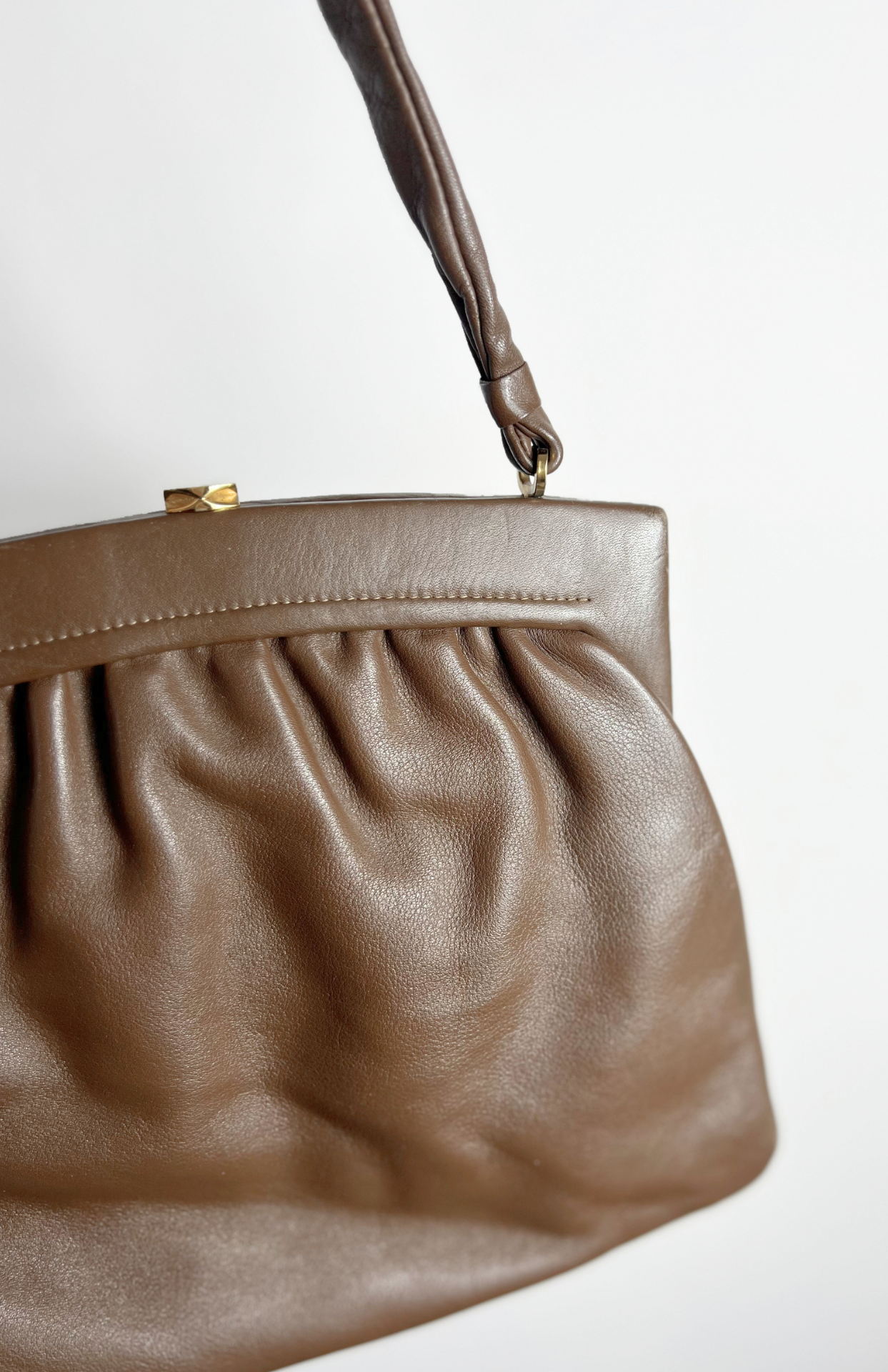 Hnědá vintage kabelka do ruky či na rameno. Zlaté kovové detaily, uvnitř jedna kapsička na drobnosti.