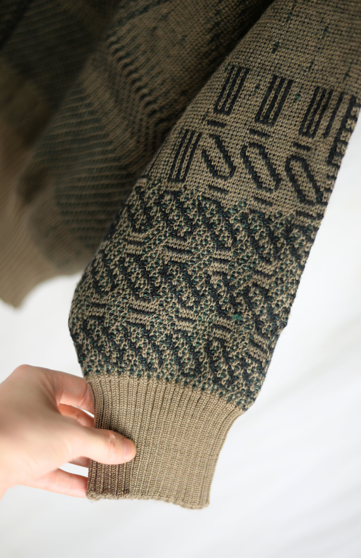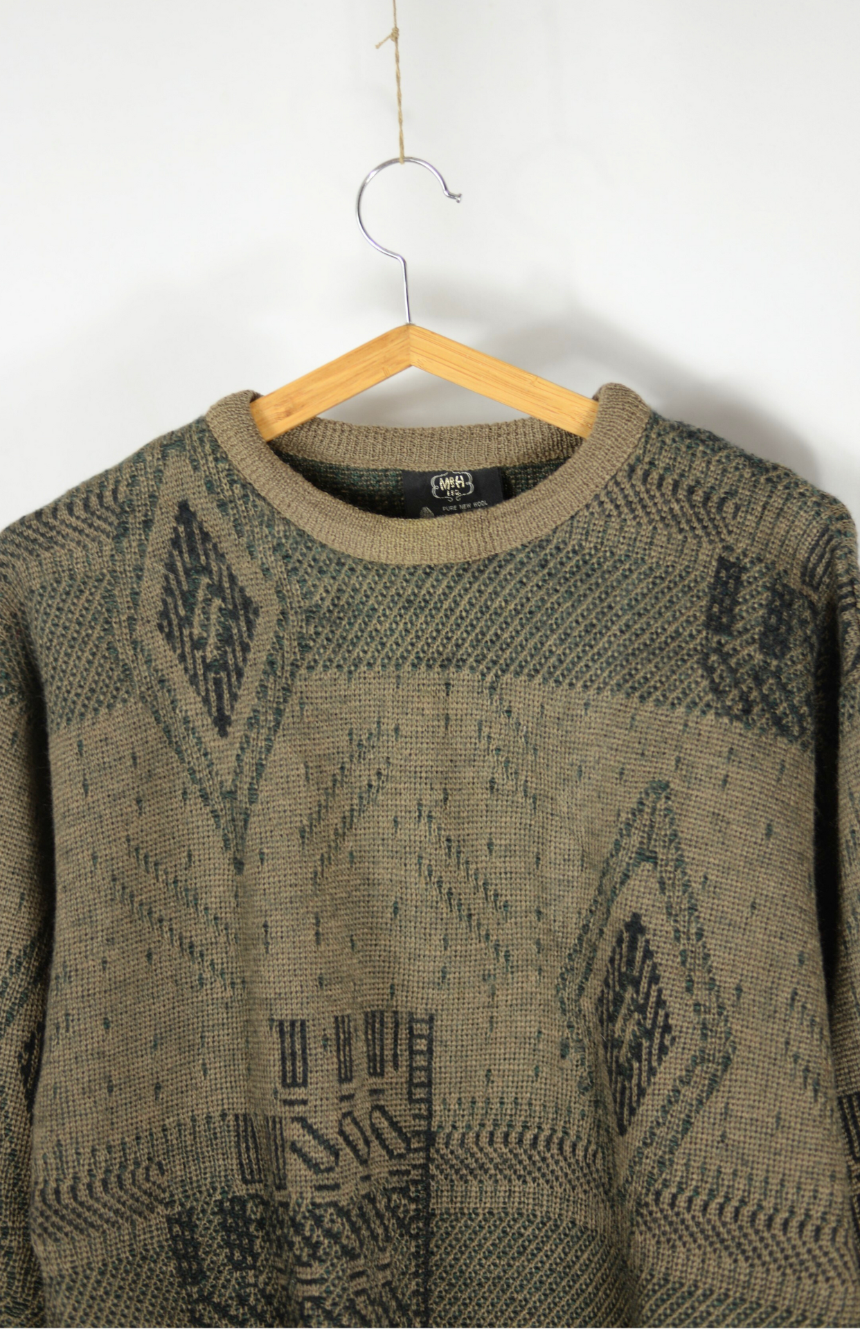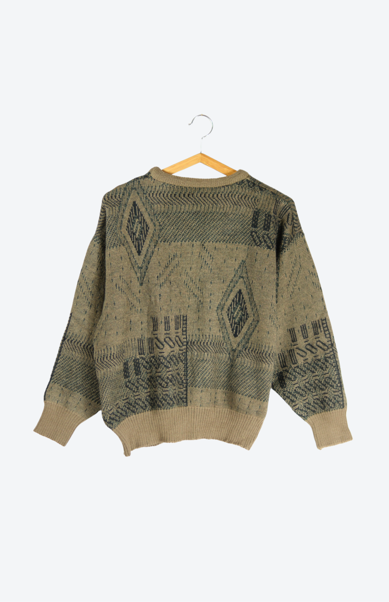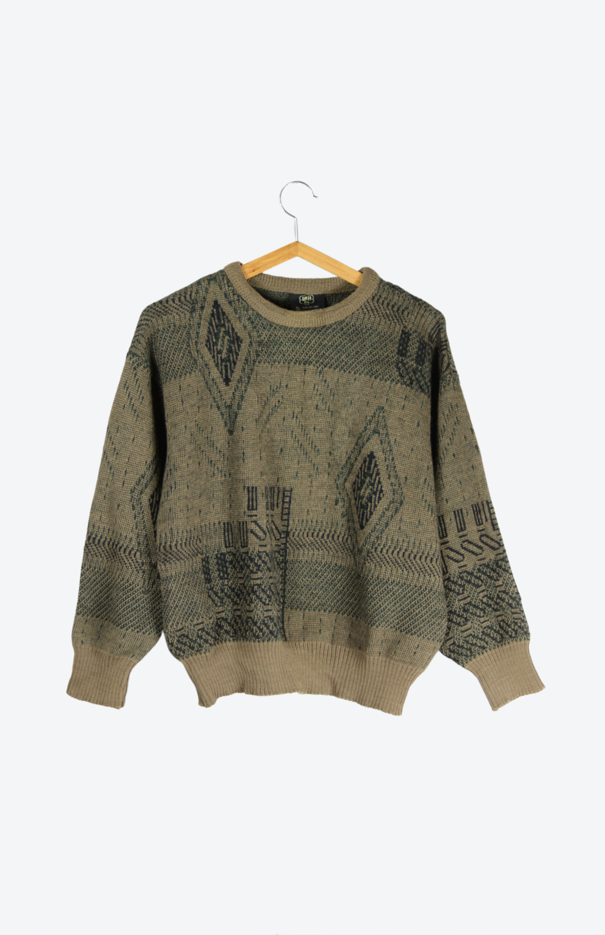 Vintage hnědý svetr s decentním vzorem. Ze silného, hladkého vlněného úpletu. Má 80´ kratší střih a lehce nabraný rukáv.
