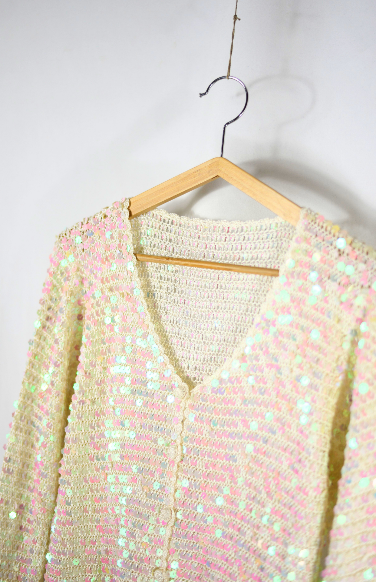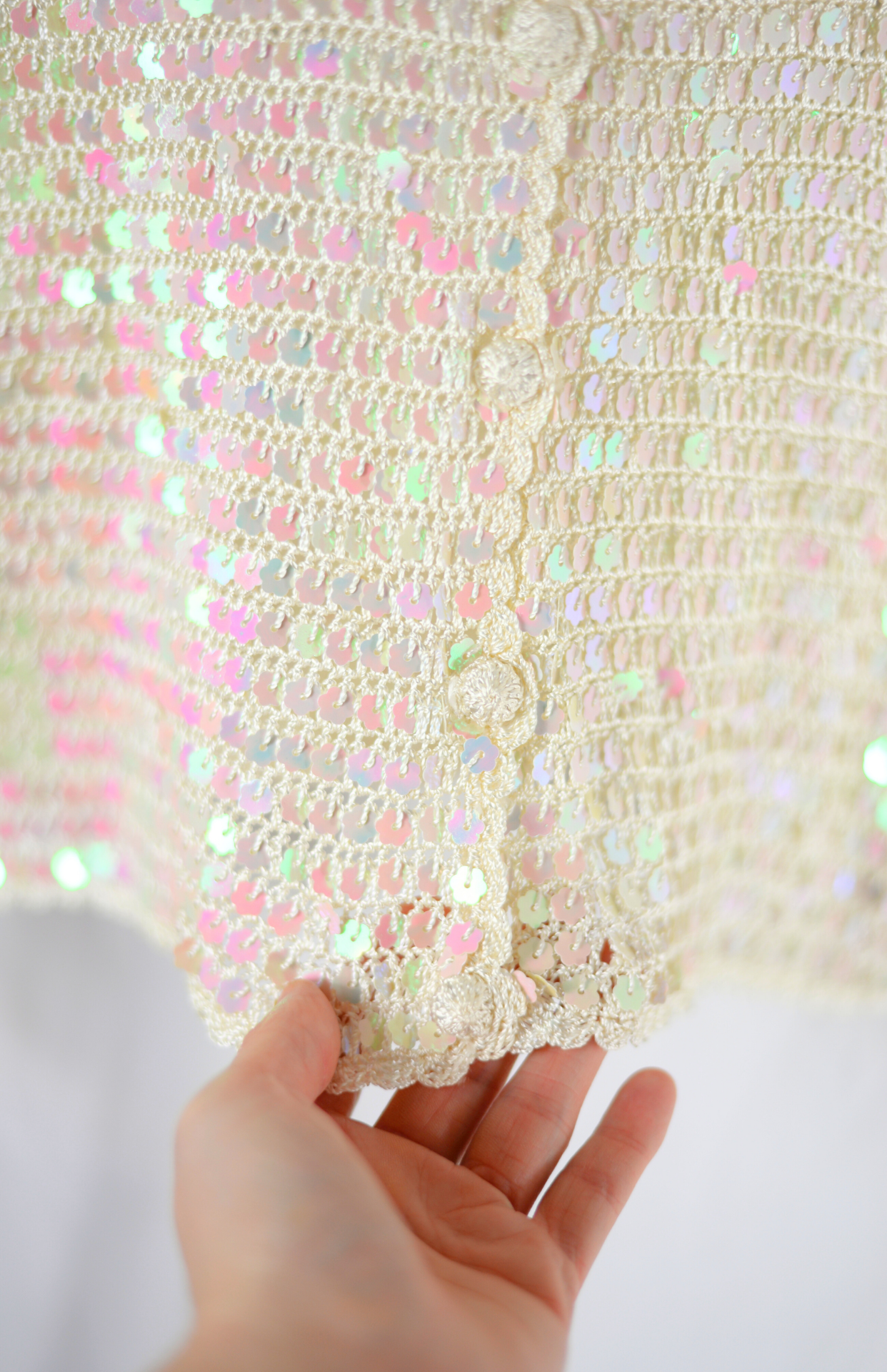 Top posetý drobnými holografickými flitry ve tvaru kytiček. Uprostřed propínací na obšívané knoflíčky. Originální festive kousek. Stav: Ve skvělém stavu, bez vad.Materiál: bez cedulky
