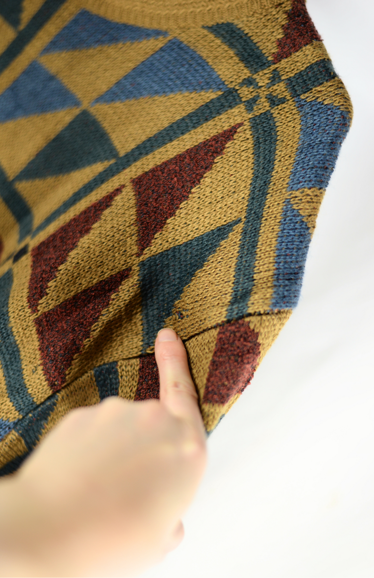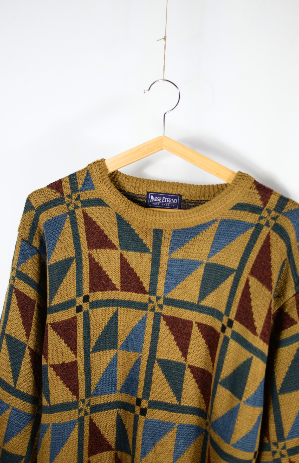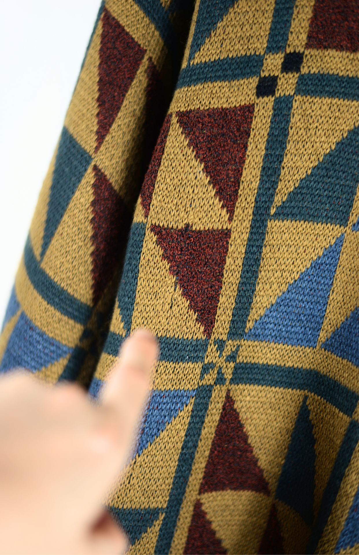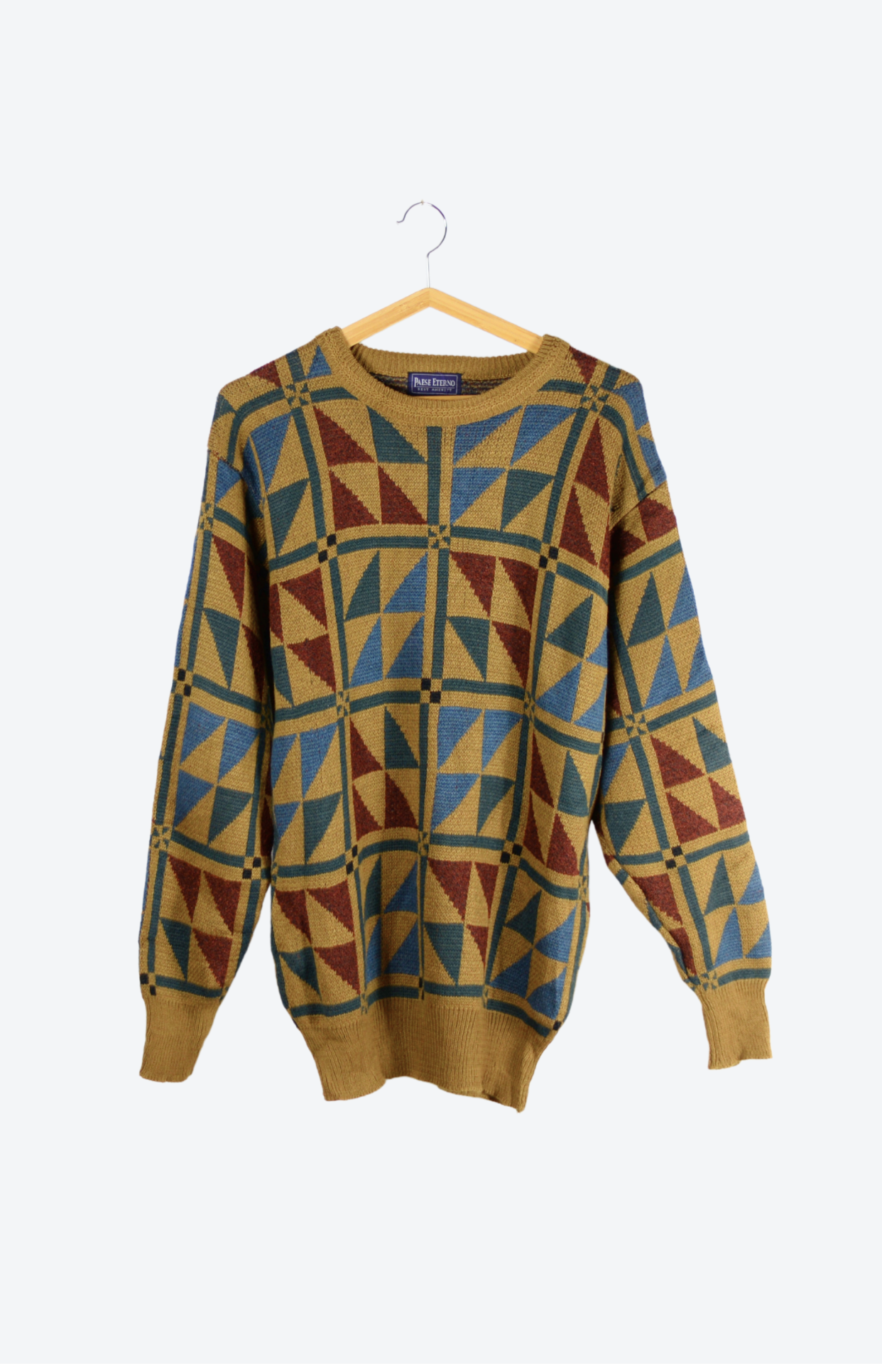 Vintage svetr s funky barevným vzorem. Má lehce nabíraný rukáv a teplejší úplet. Originální a pěkně zpracovaný. Unisex střih.