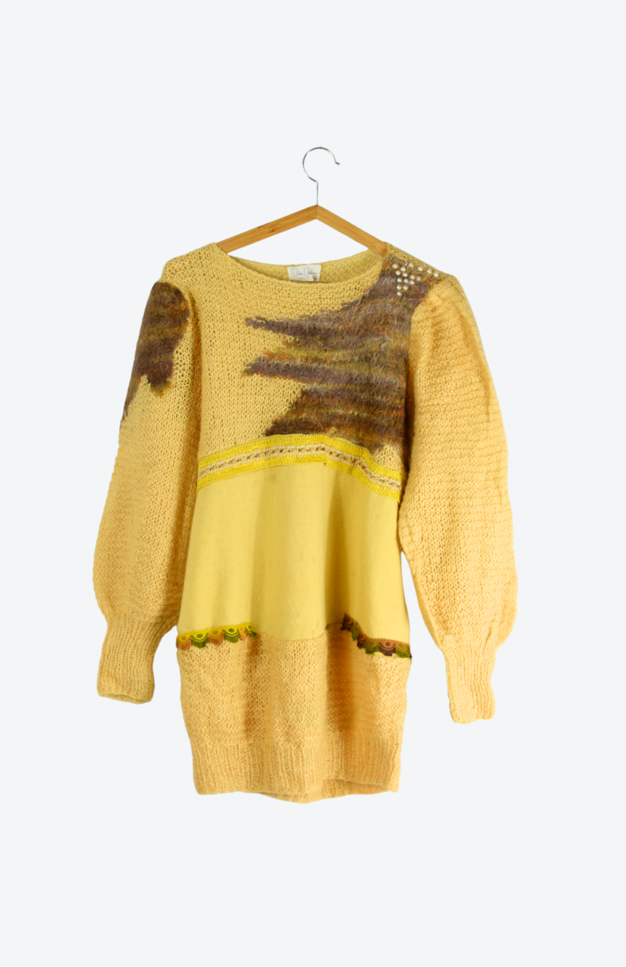 Originální vlněný svetr s abstraktním vzorem, krajkou a nabíranými rukávy. Delší střih, poslouží i jako svetrové šaty.