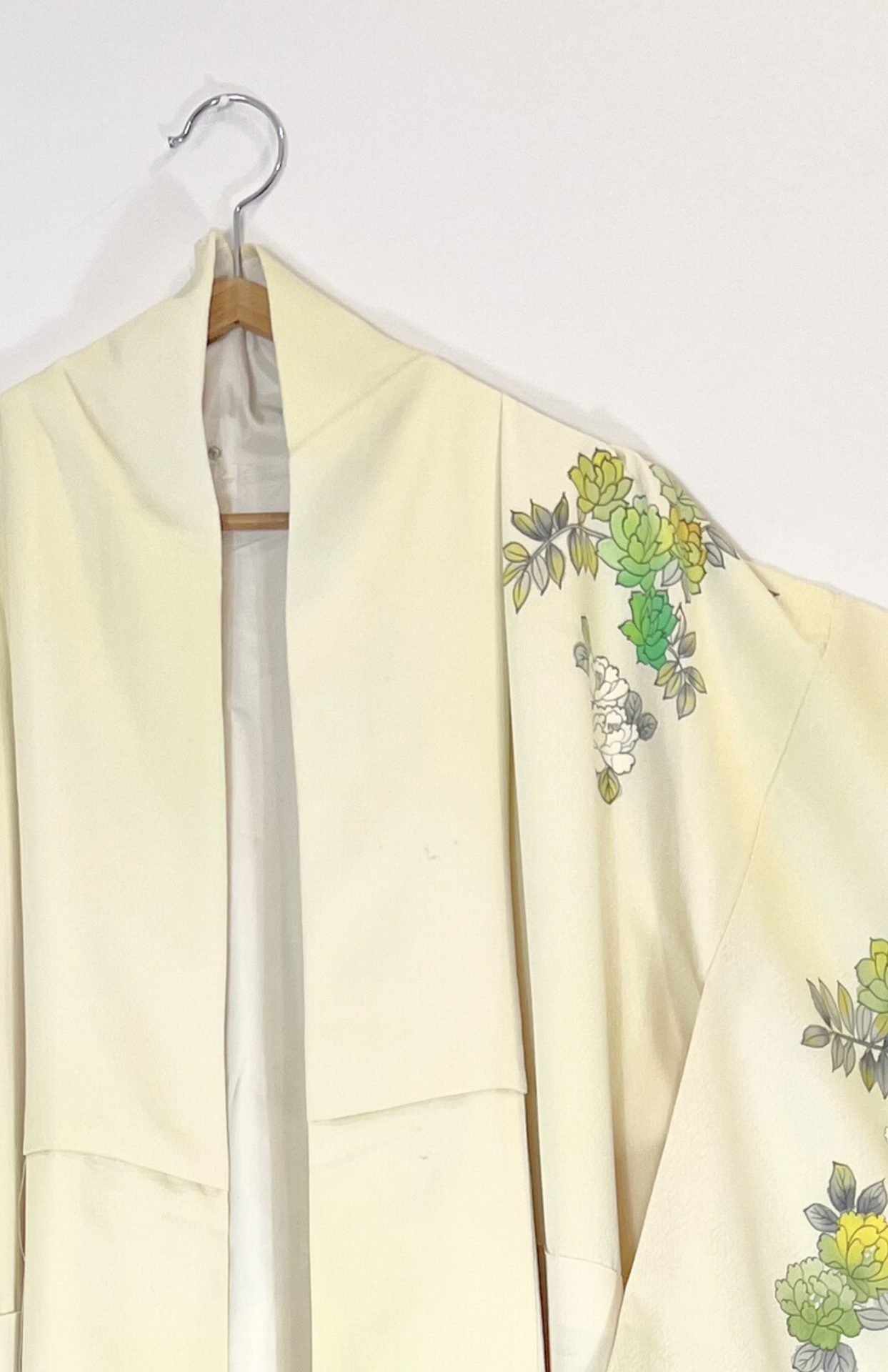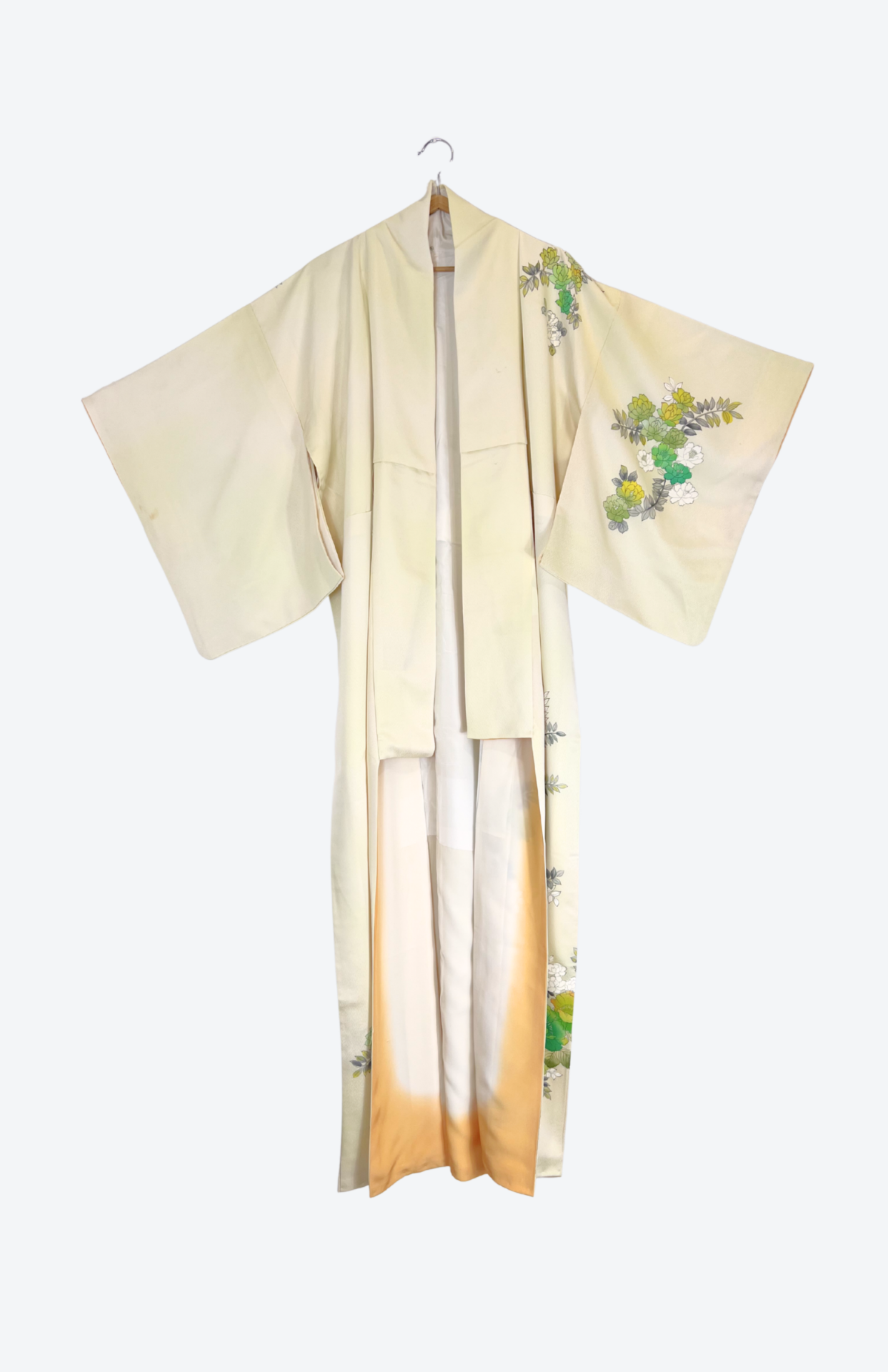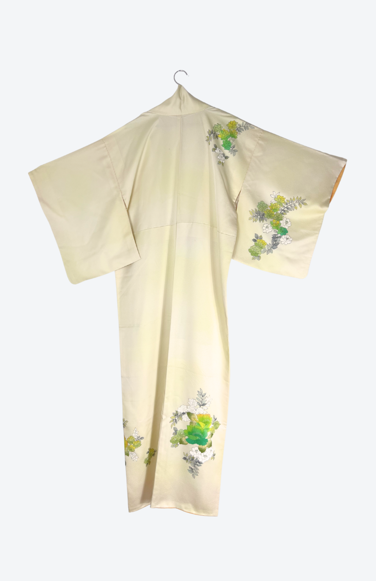 Vintage japonské kimono z příjemné splývavé látky a s květinovým vzorem. Má typický rovný střih s širokými rukávy a dlouhou elegantní siluetu. Je bez zapínání, zavinout jej můžete pomocí jakéhokoliv pásku.