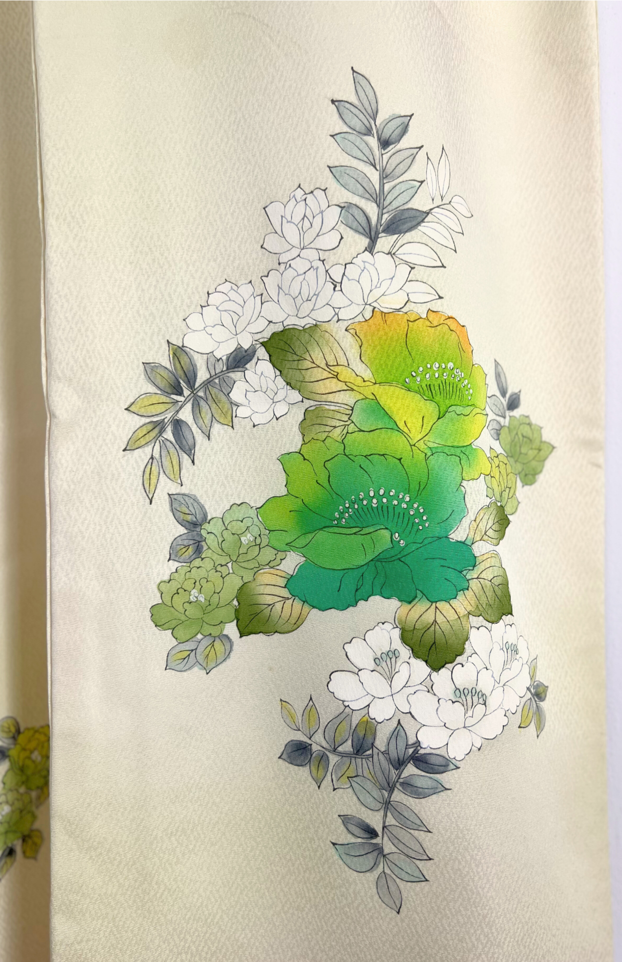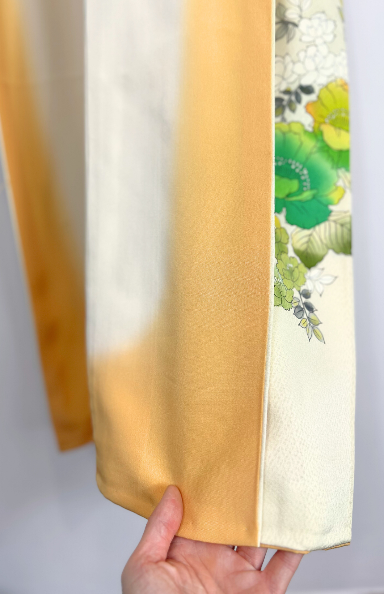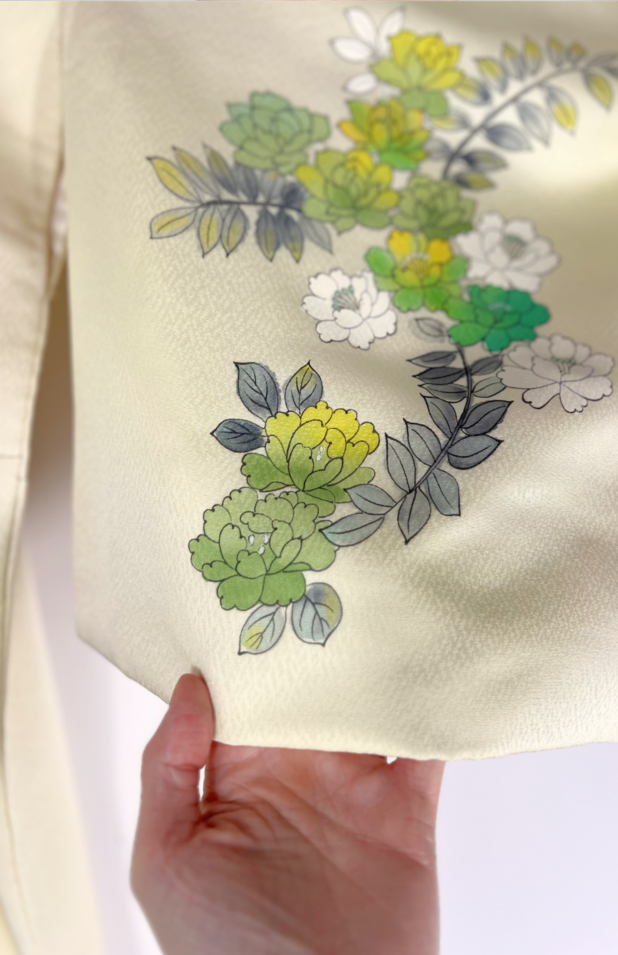 Vintage japonské kimono z příjemné splývavé látky a s květinovým vzorem. Má typický rovný střih s širokými rukávy a dlouhou elegantní siluetu. Je bez zapínání, zavinout jej můžete pomocí jakéhokoliv pásku.