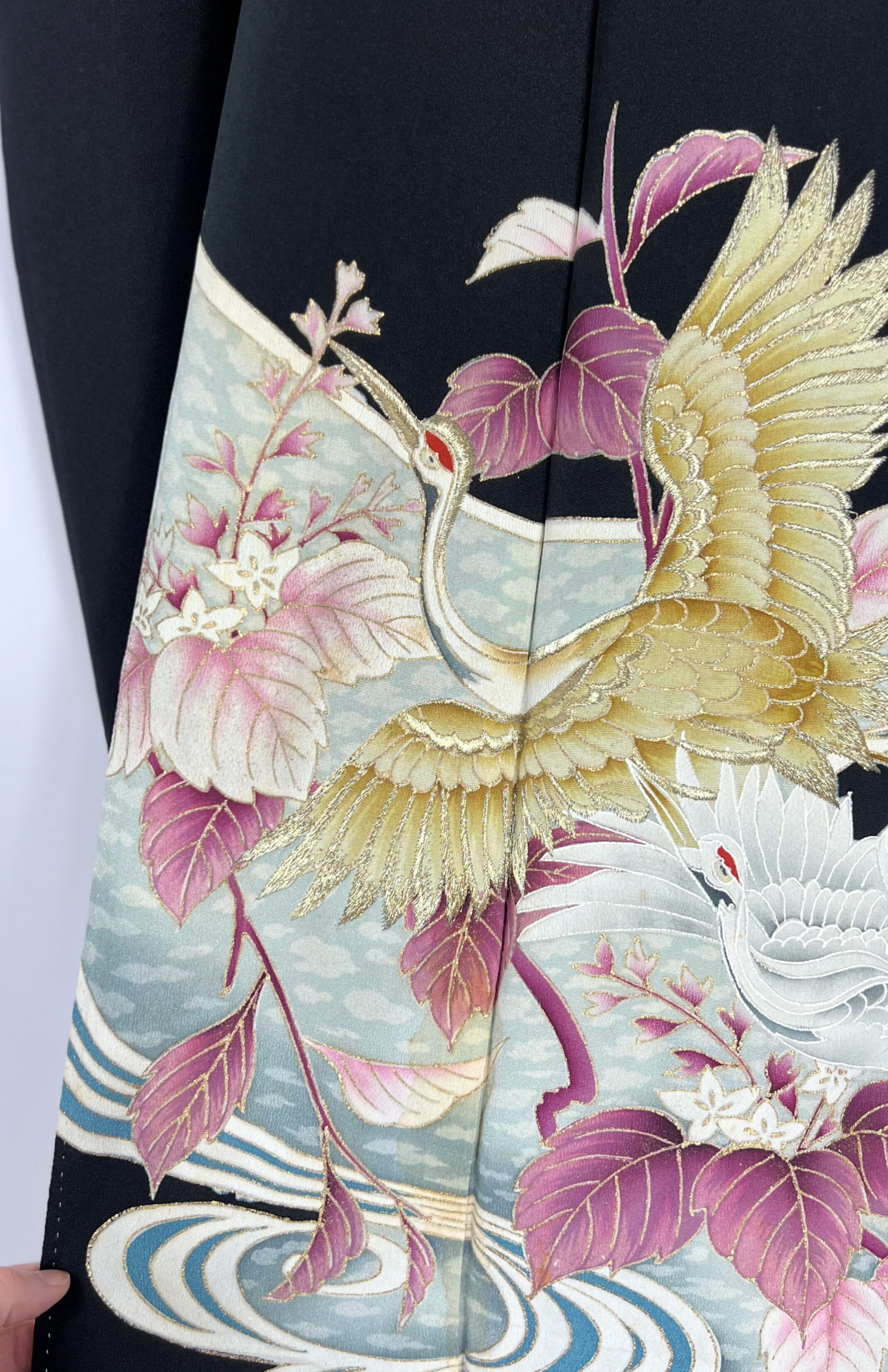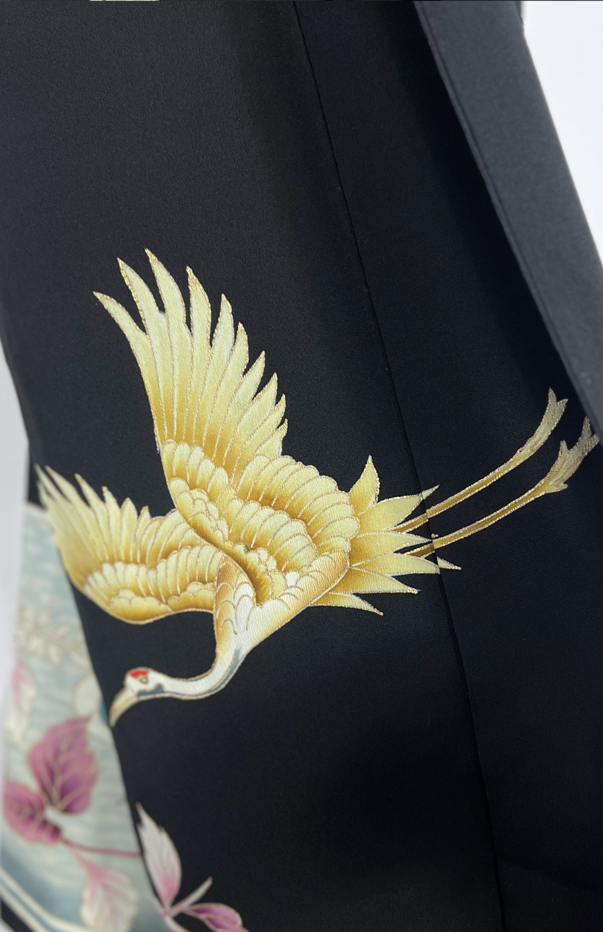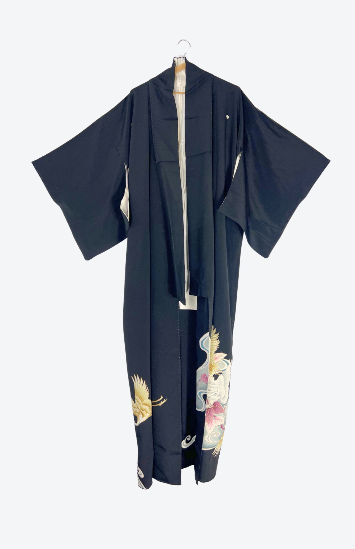 Vintage japonské kimono z příjemné splývavé látky a s vyšívanými volavkami na spodním lemu. Má typický rovný střih s širokými rukávy a dlouhou elegantní siluetu. Je bez zapínání, zavinout jej můžete pomocí jakéhokoliv pásku.