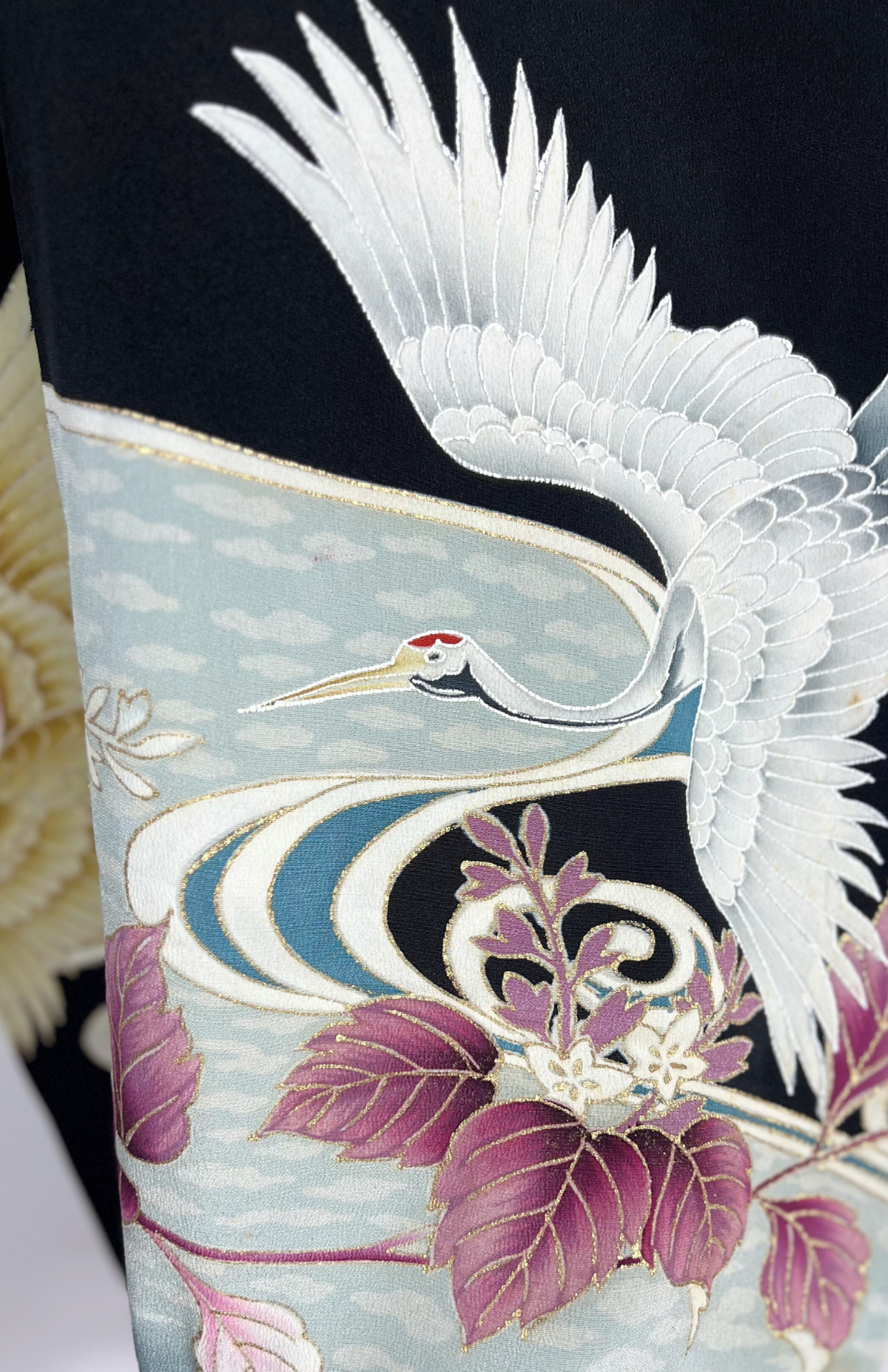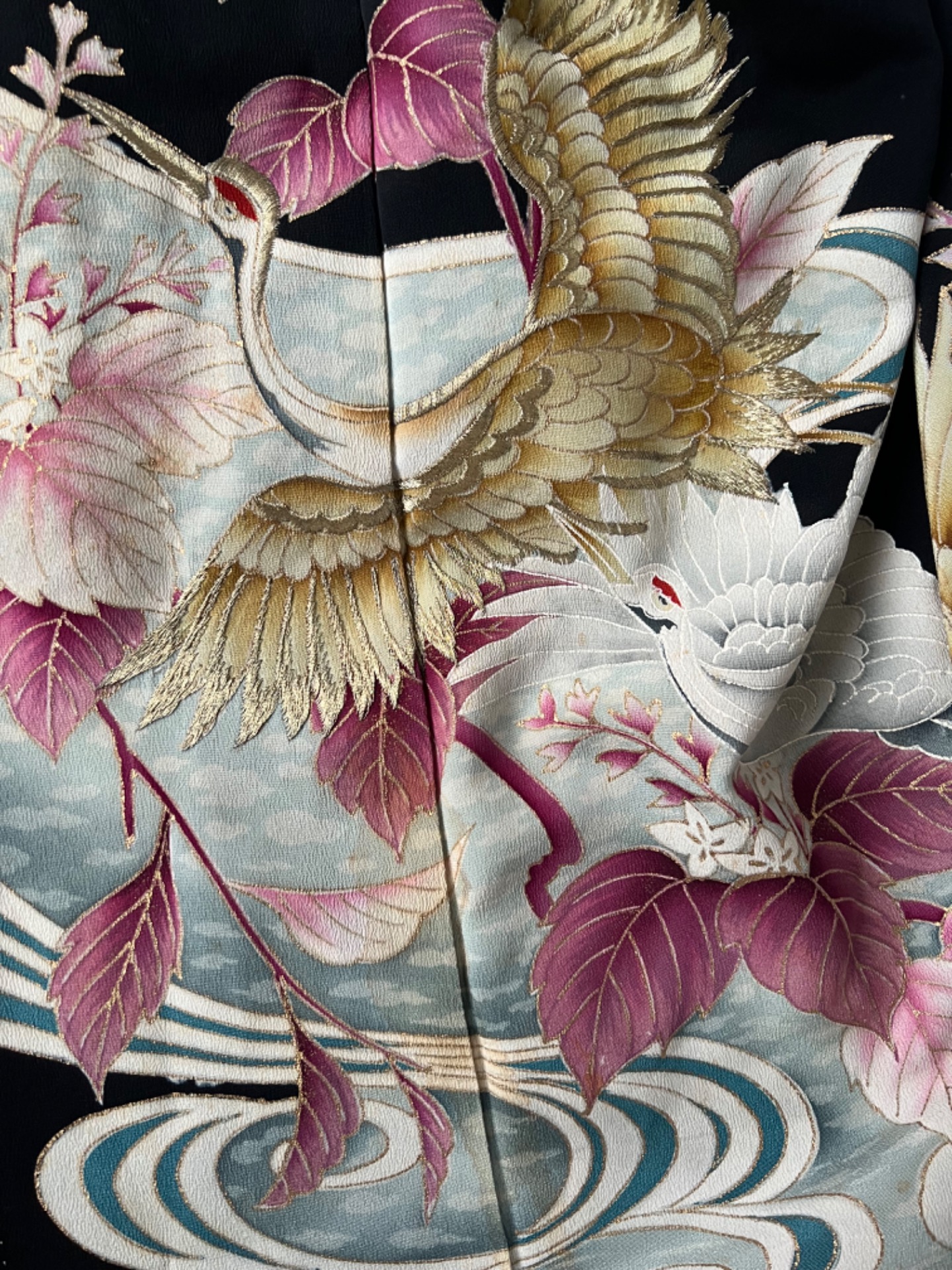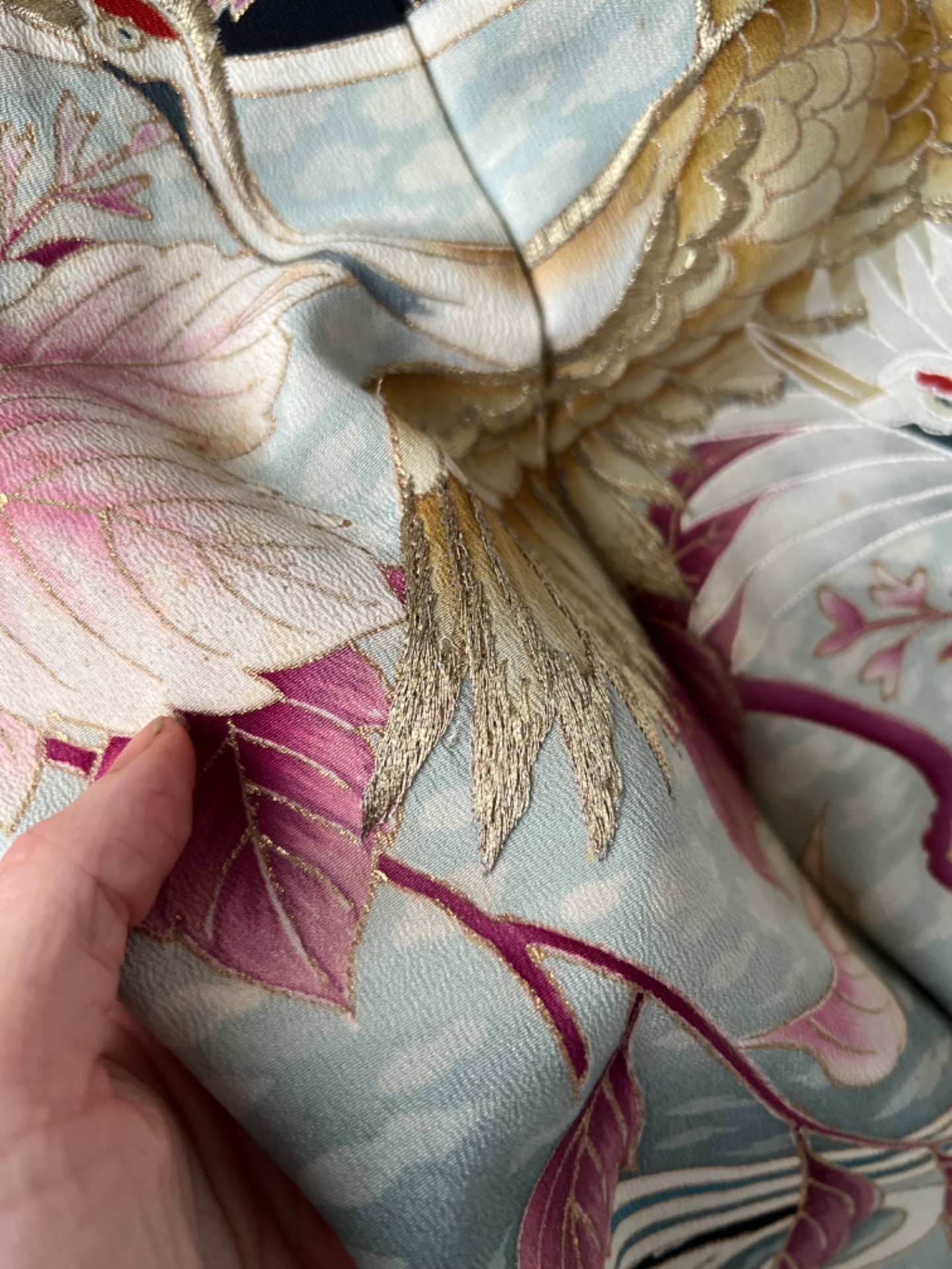 Vintage japonské kimono z příjemné splývavé látky a s vyšívanými volavkami na spodním lemu. Má typický rovný střih s širokými rukávy a dlouhou elegantní siluetu. Je bez zapínání, zavinout jej můžete pomocí jakéhokoliv pásku.