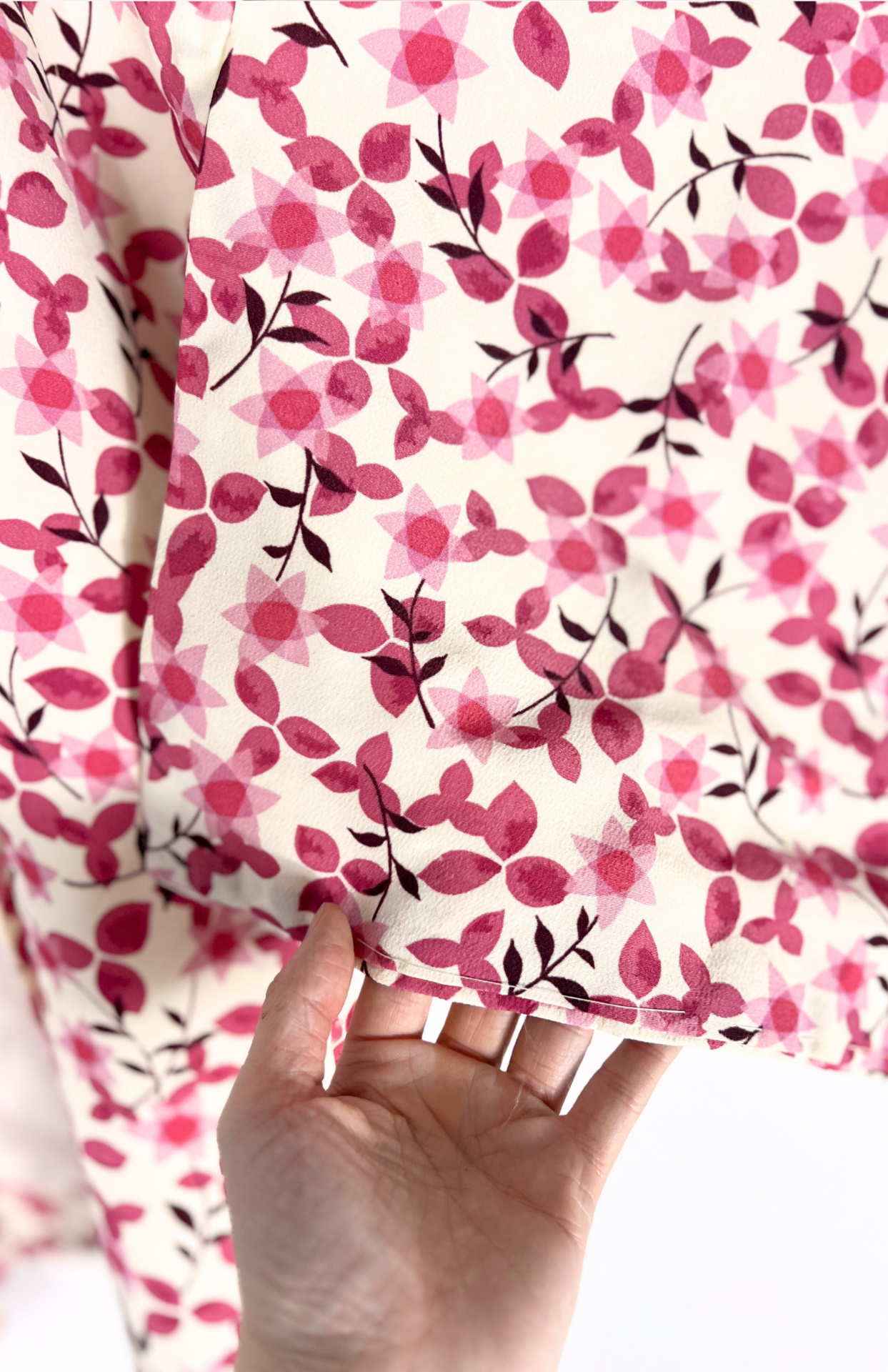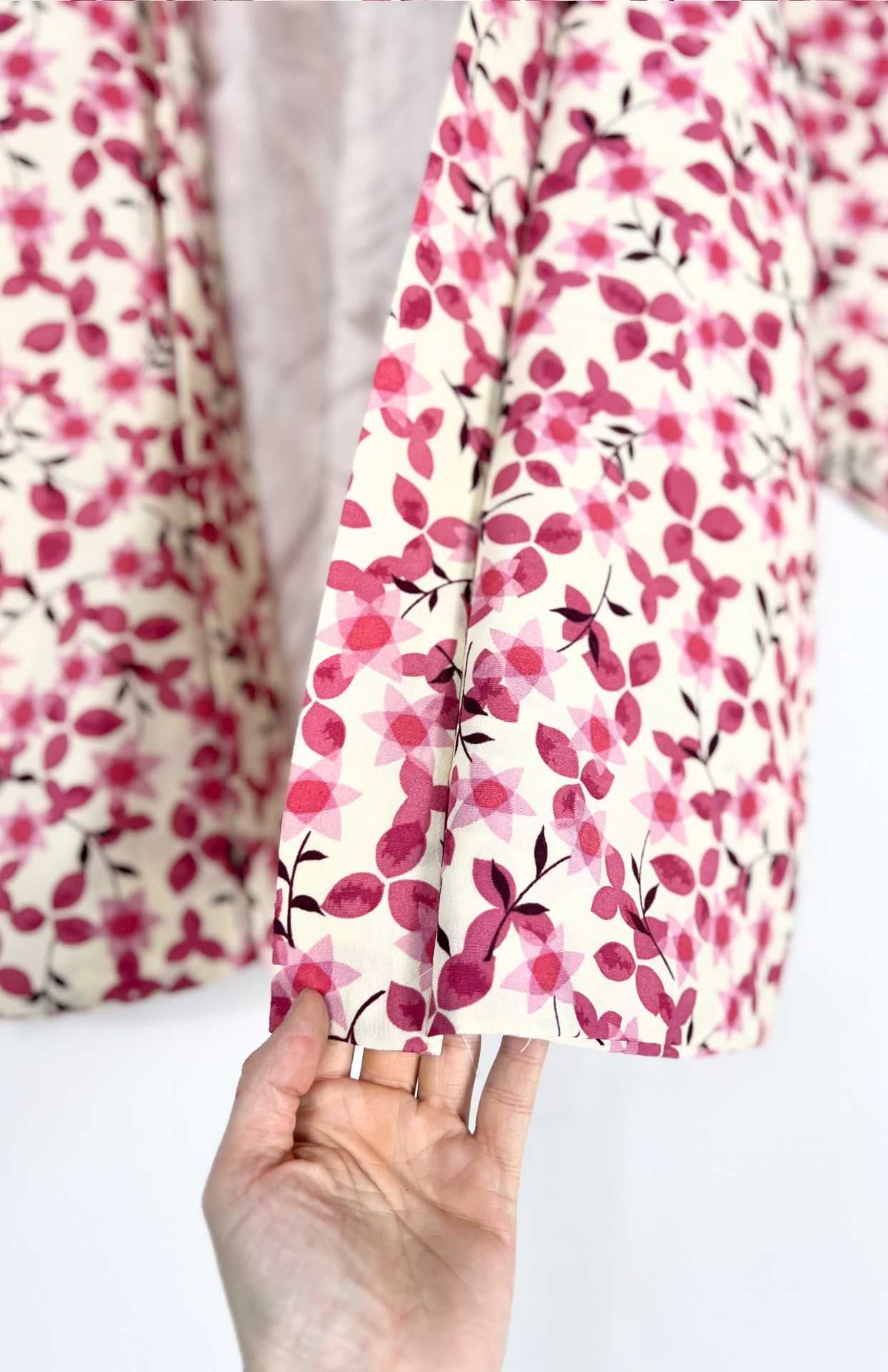 Vintage japonský haori kabátek z příjemné splývavé látky a s jemným vzorem. Má typický rovný střih se širokými rukávy. Zapíná se pomocí tradiční šňůrky v přední části.