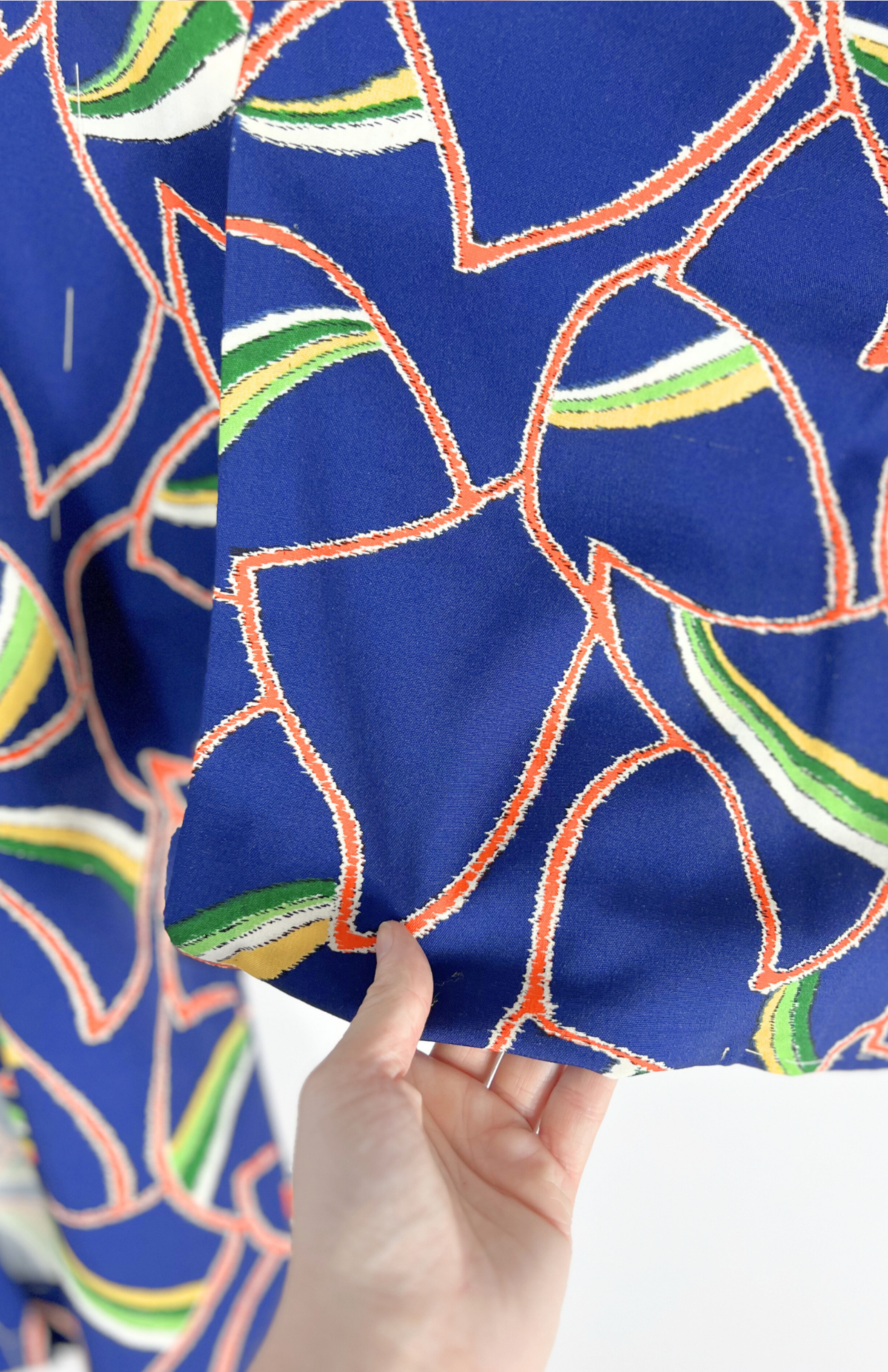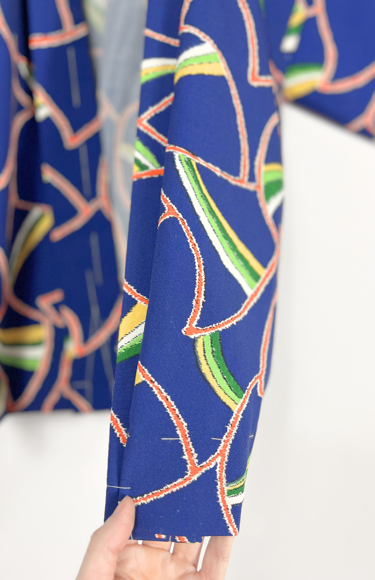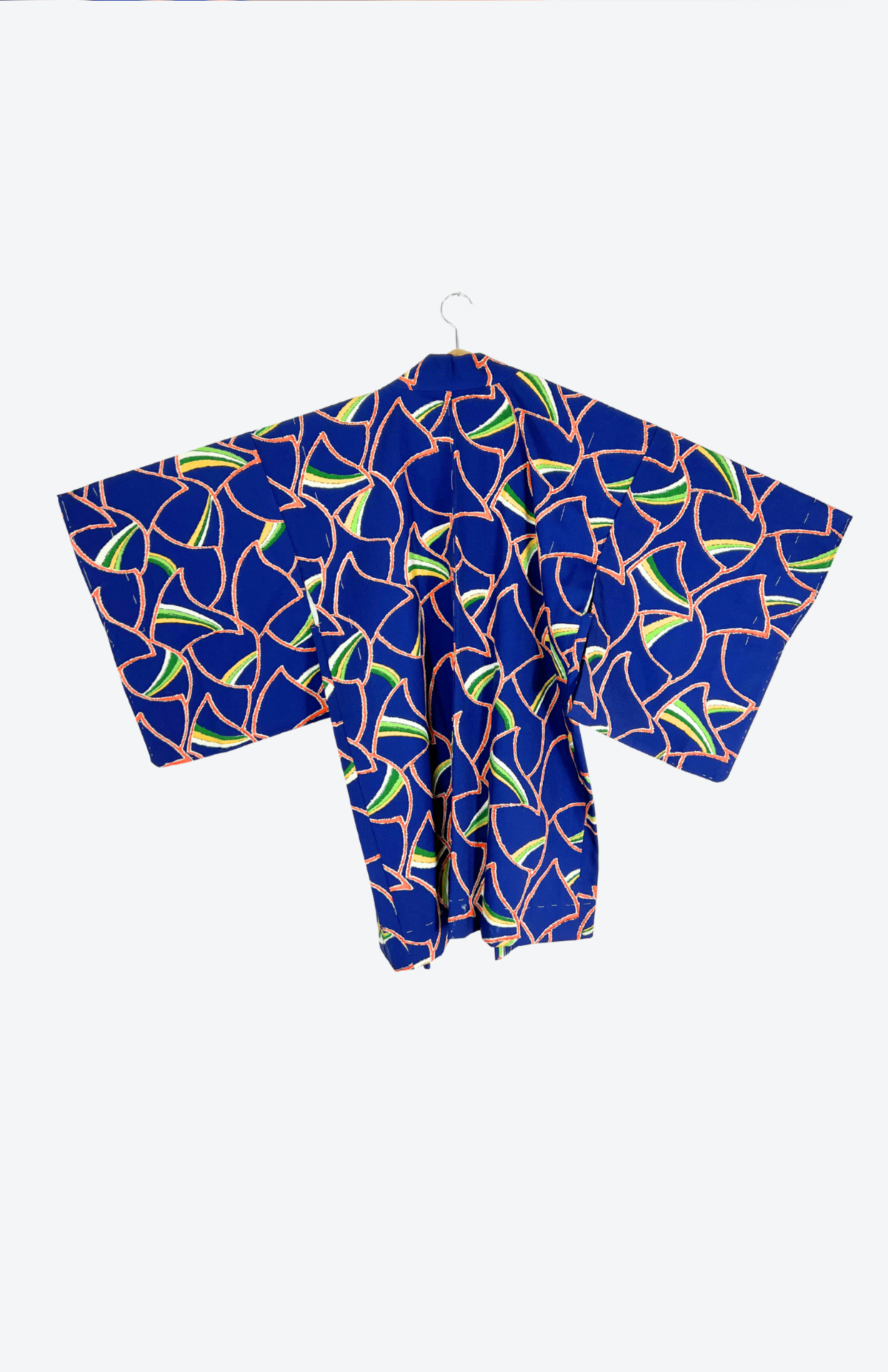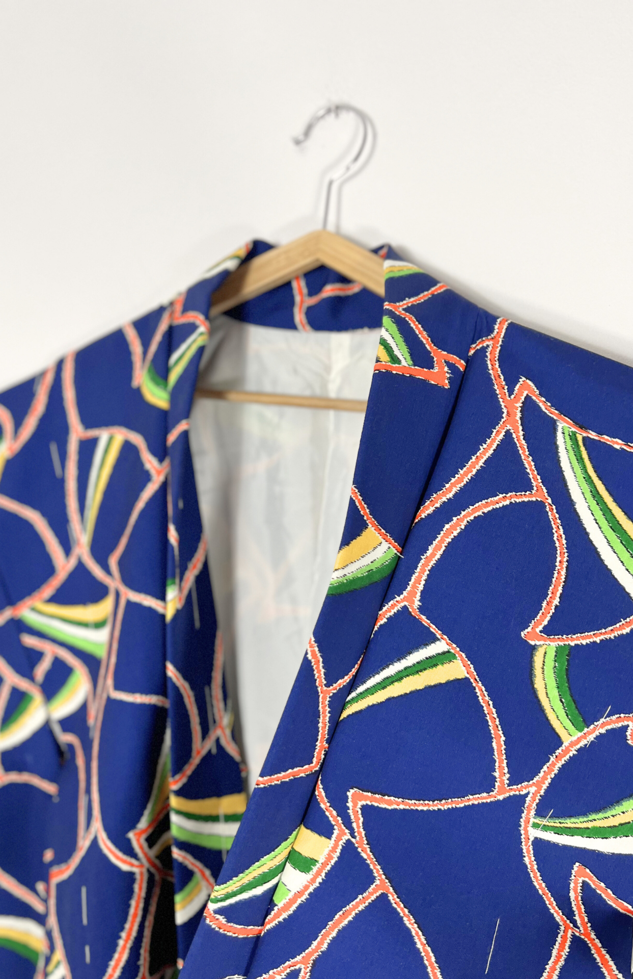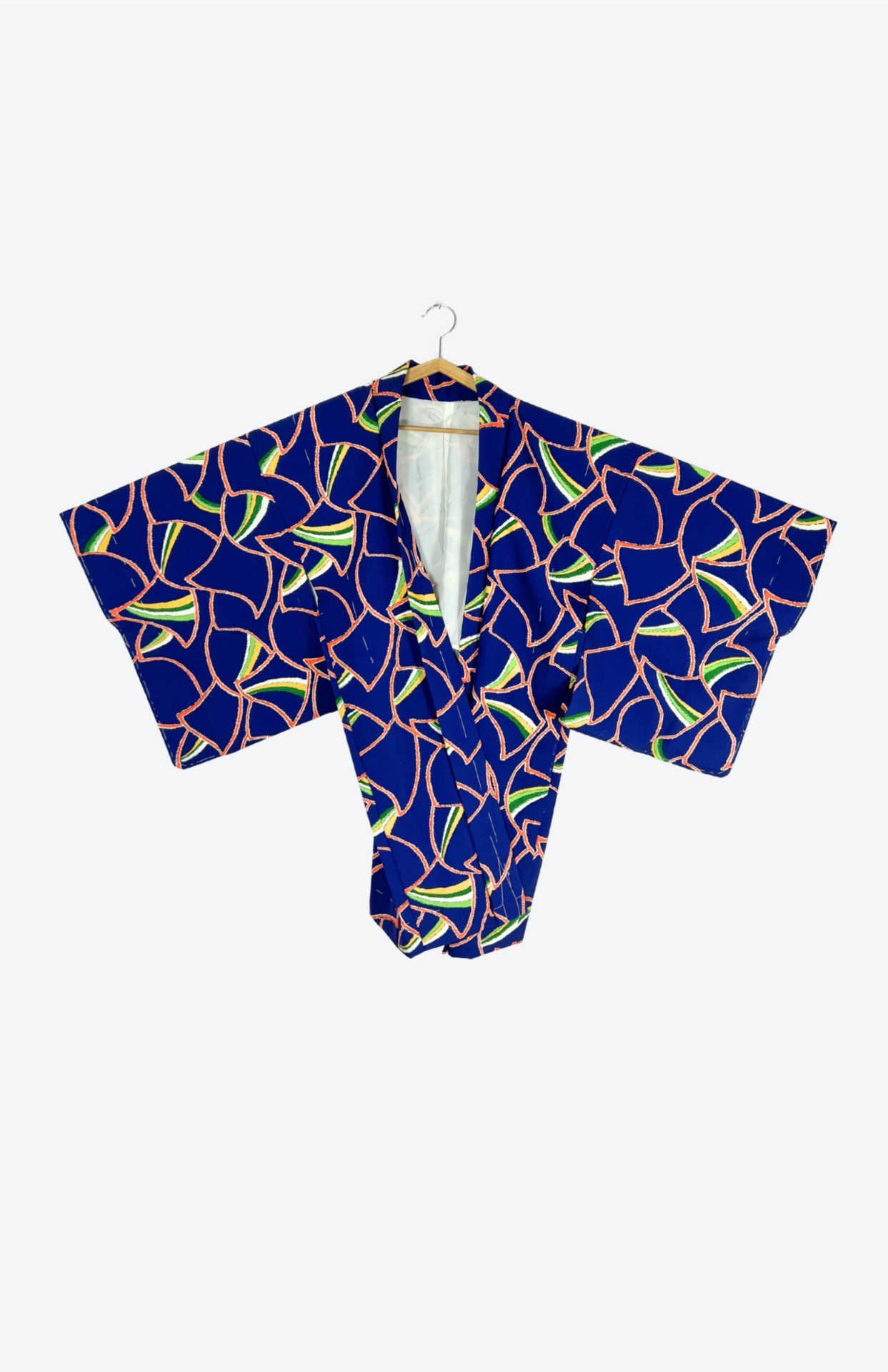 Vintage japonský haori kabátek z příjemné splývavé látky a s funky barevným vzorem. Má typický rovný střih se širokými rukávy. Zapíná se pomocí tradiční šňůrky v přední části.