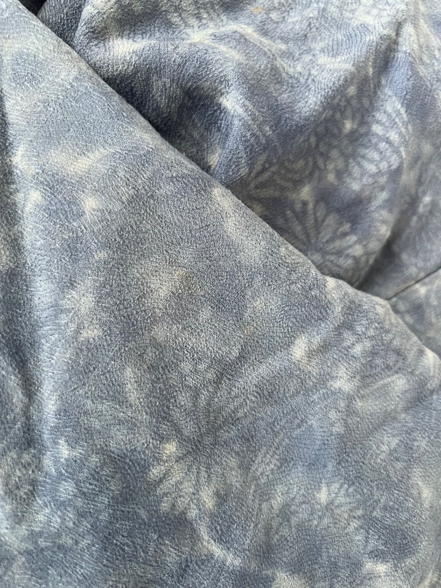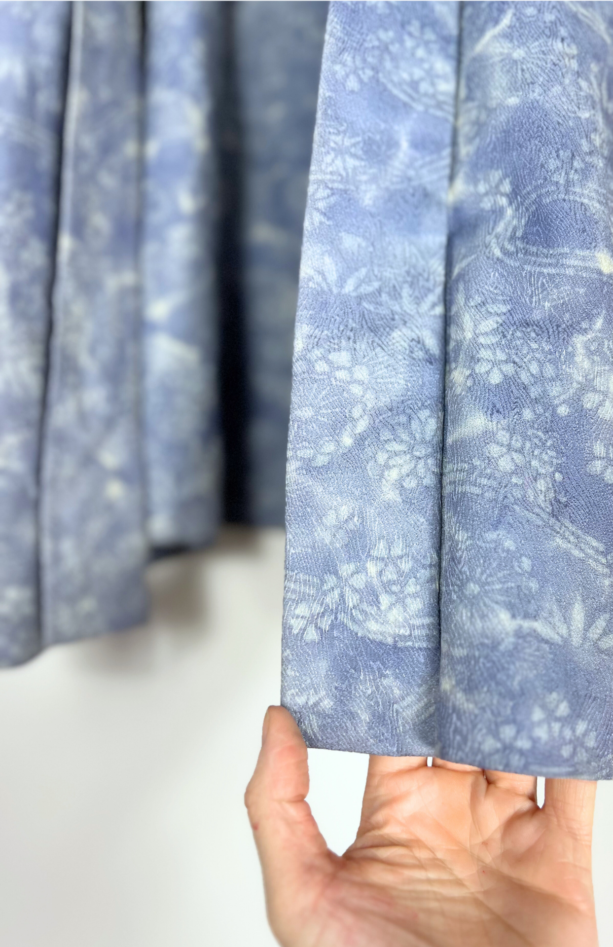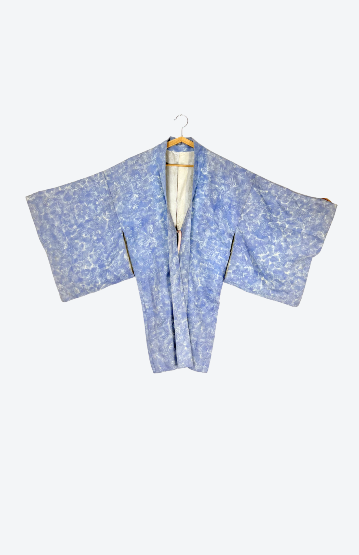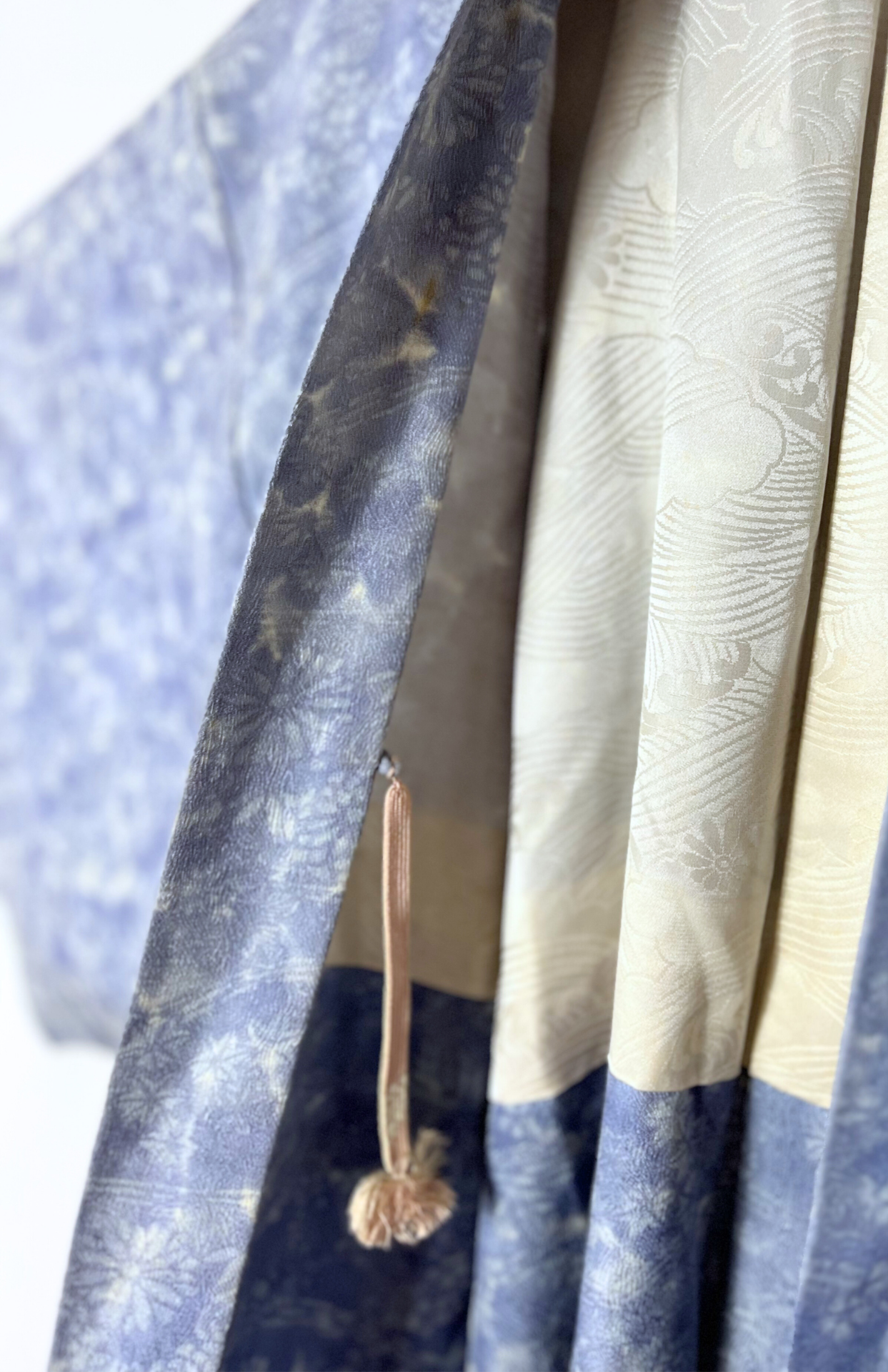 Vintage japonský haori kabátek z příjemné splývavé látky a s jemným vzorem. Má typický rovný střih se širokými rukávy. Zapíná se pomocí tradiční šňůrky v přední části.