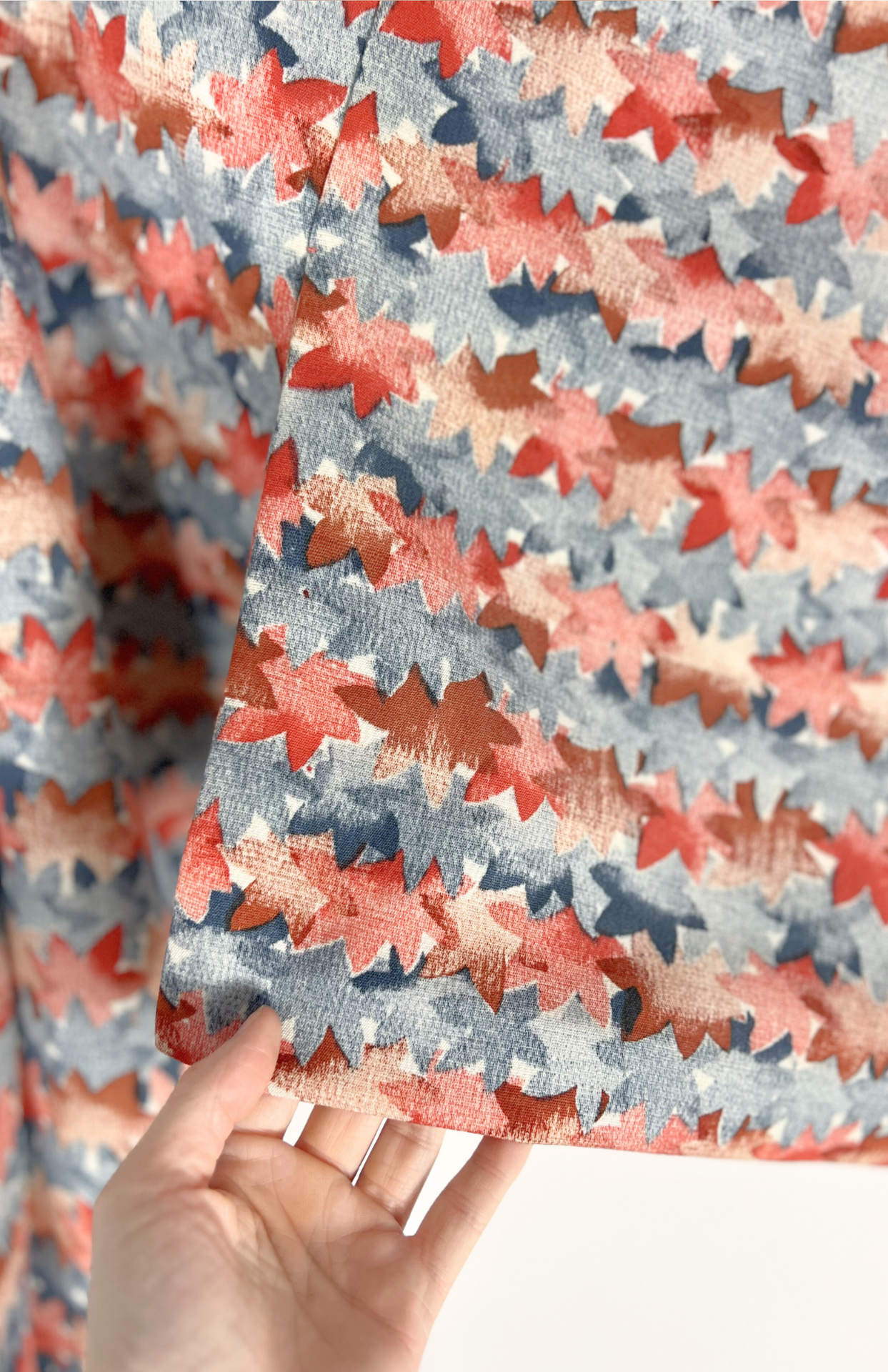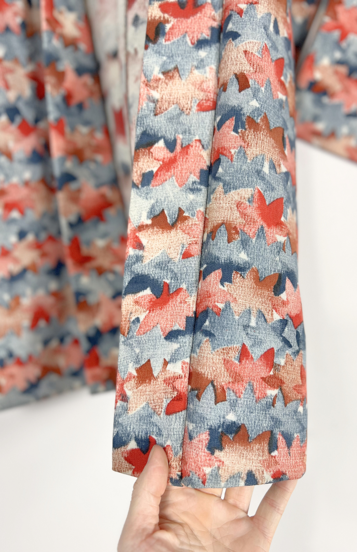 Vintage japonský haori kabátek z příjemné splývavé látky a s barevným vzorem. Má typický rovný střih se širokými rukávy. Zapíná se pomocí tradiční šňůrky v přední části.