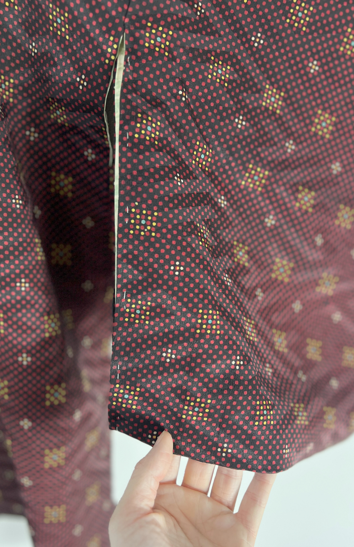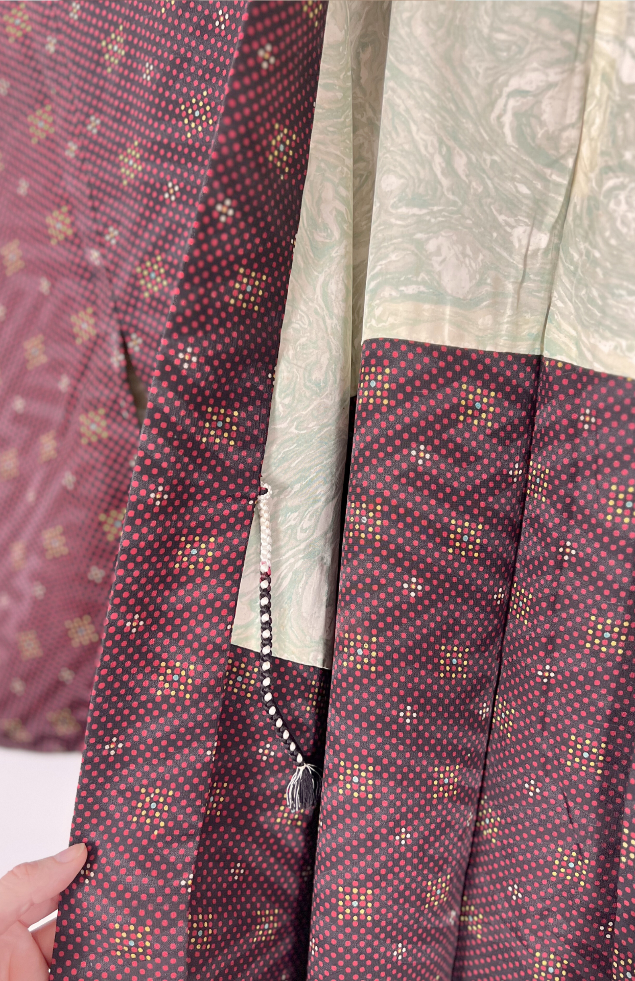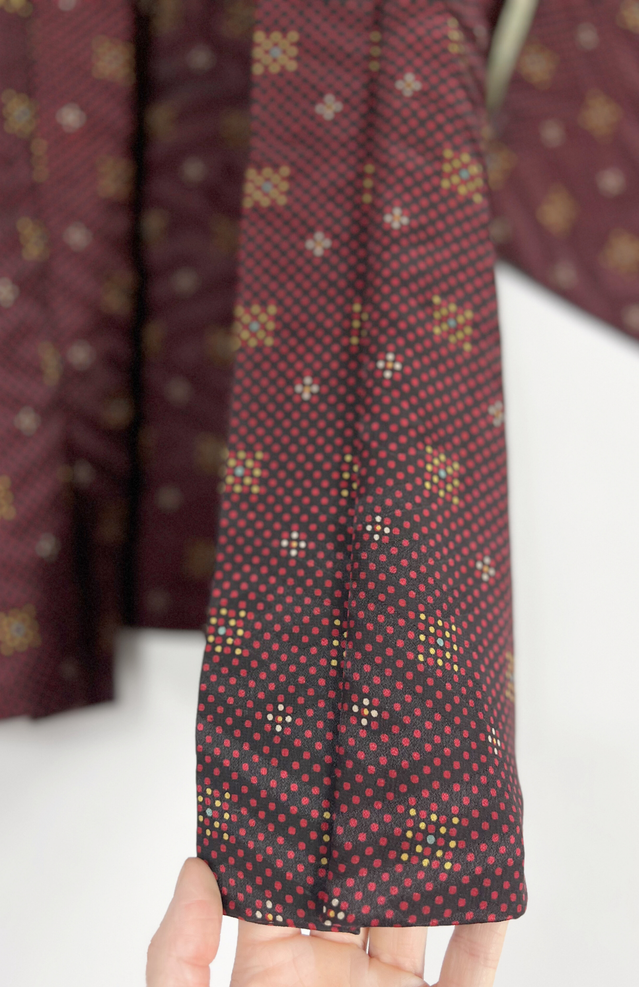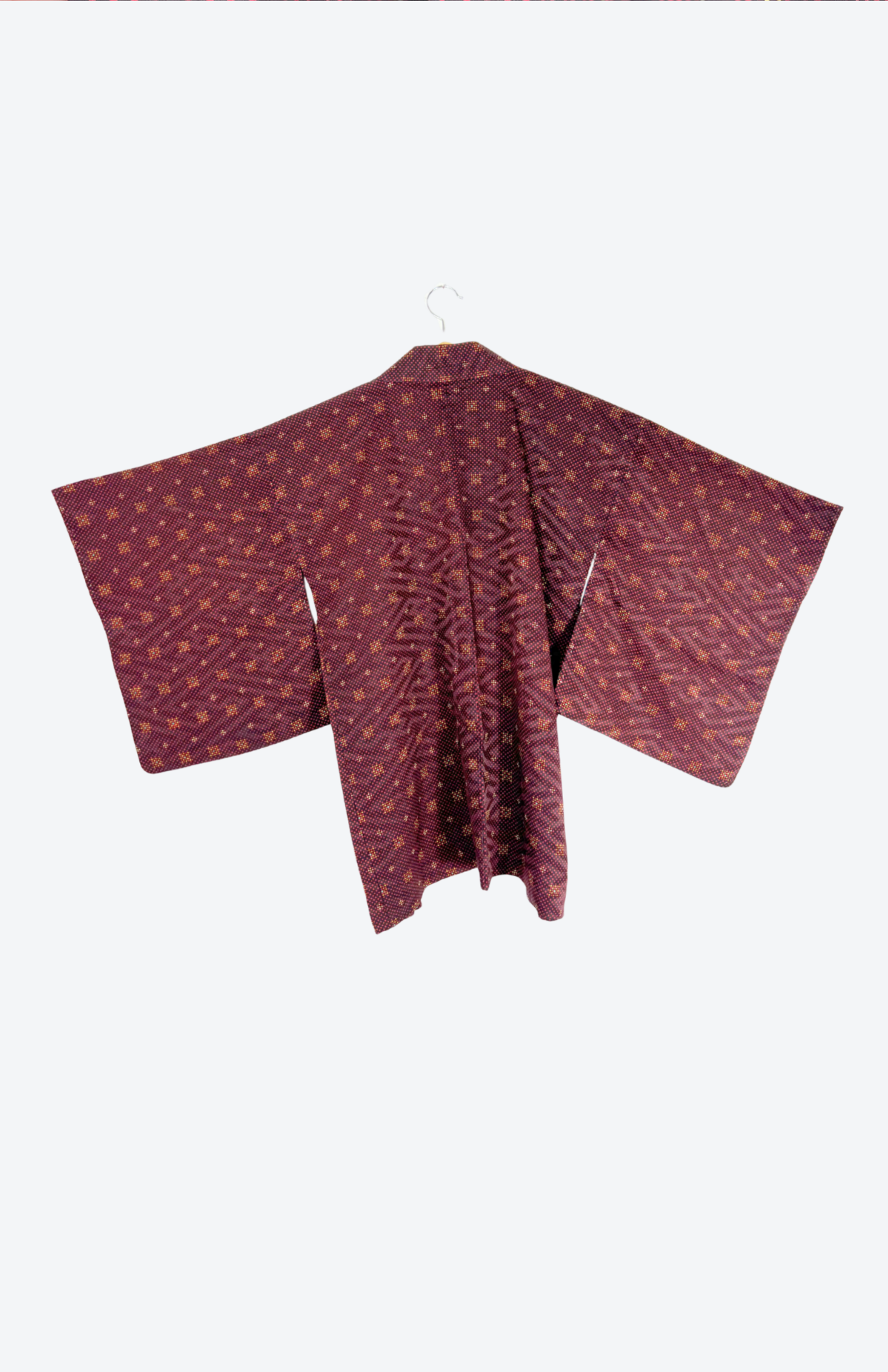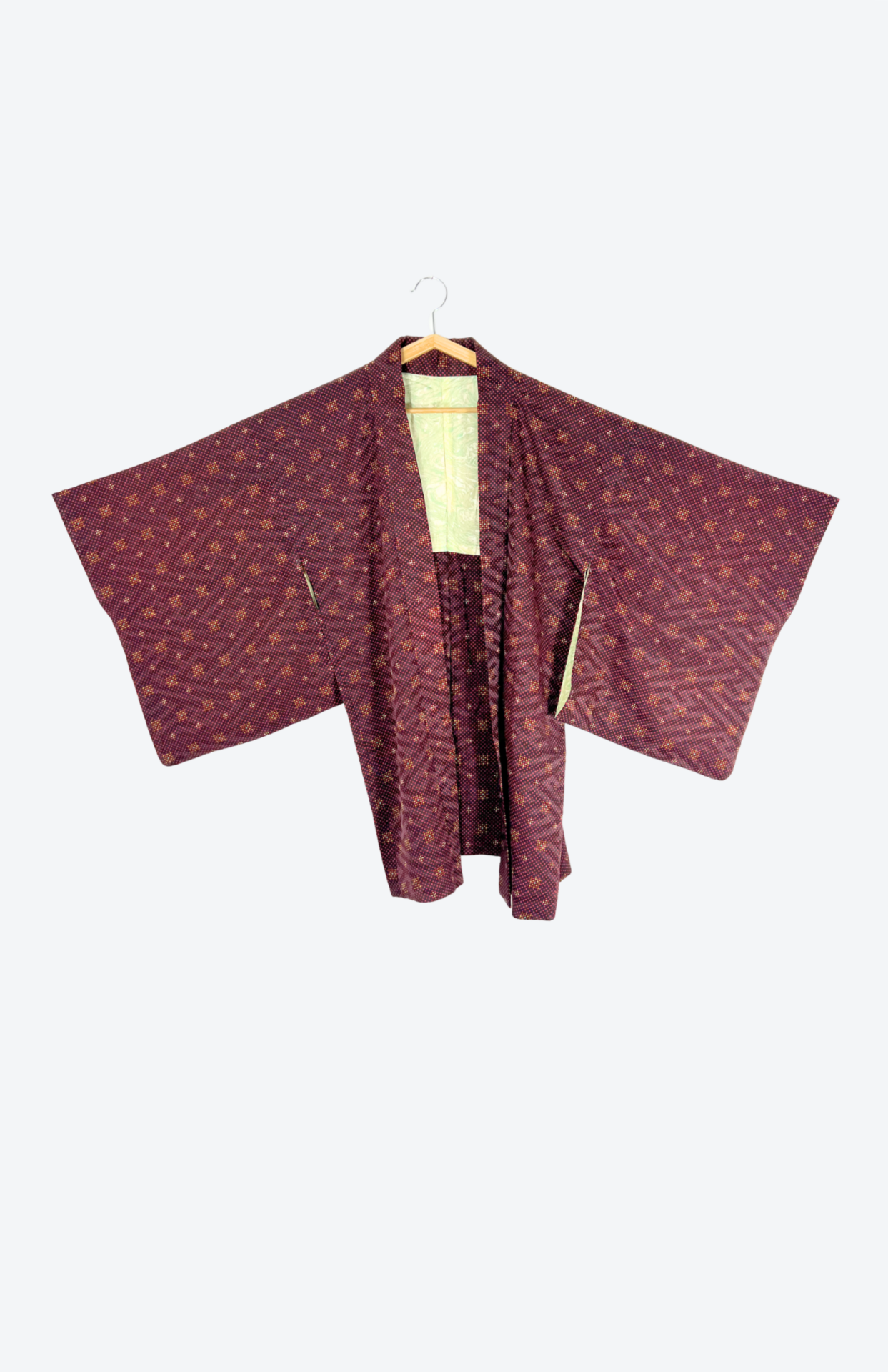 Vintage japonský haori kabátek z příjemné splývavé látky a s jemným vzorem. Má typický rovný střih se širokými rukávy. Zapíná se pomocí tradiční šňůrky v přední části.