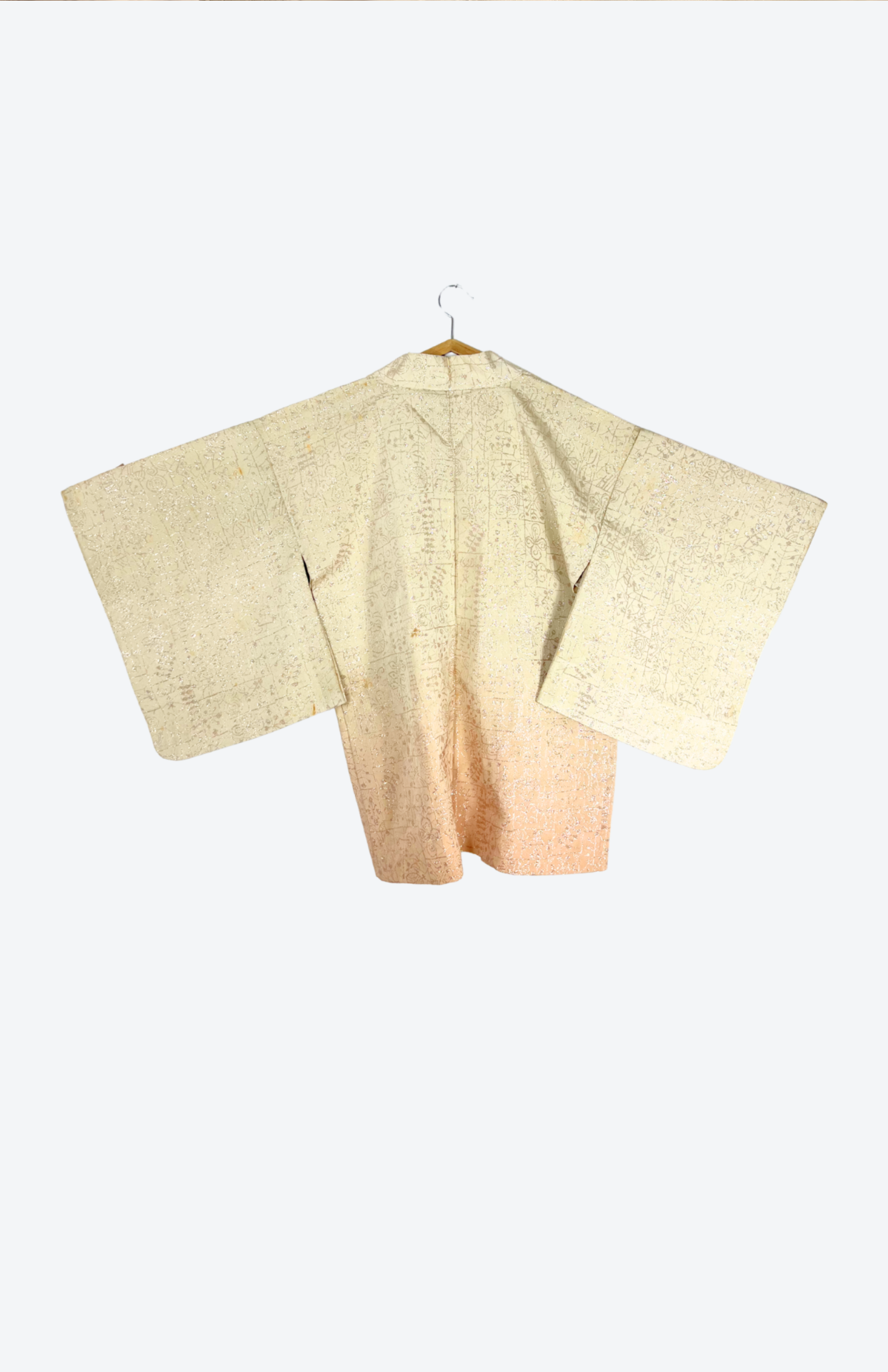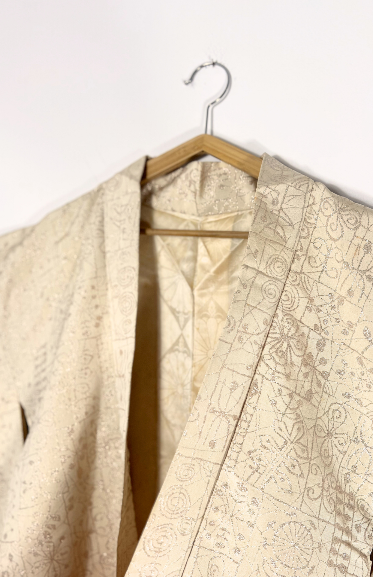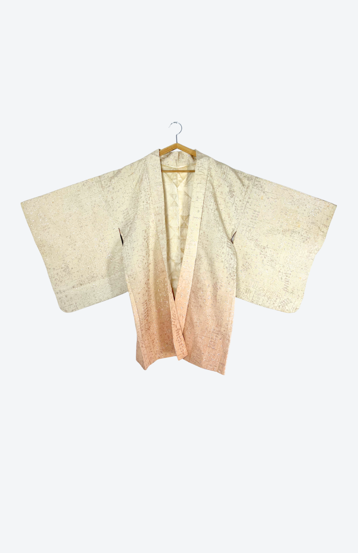 Vintage japonský haori kabátek z příjemné splývavé látky a s jemným vzorem. Má typický rovný střih se širokými rukávy. Zapíná se pomocí tradiční šňůrky v přední části.