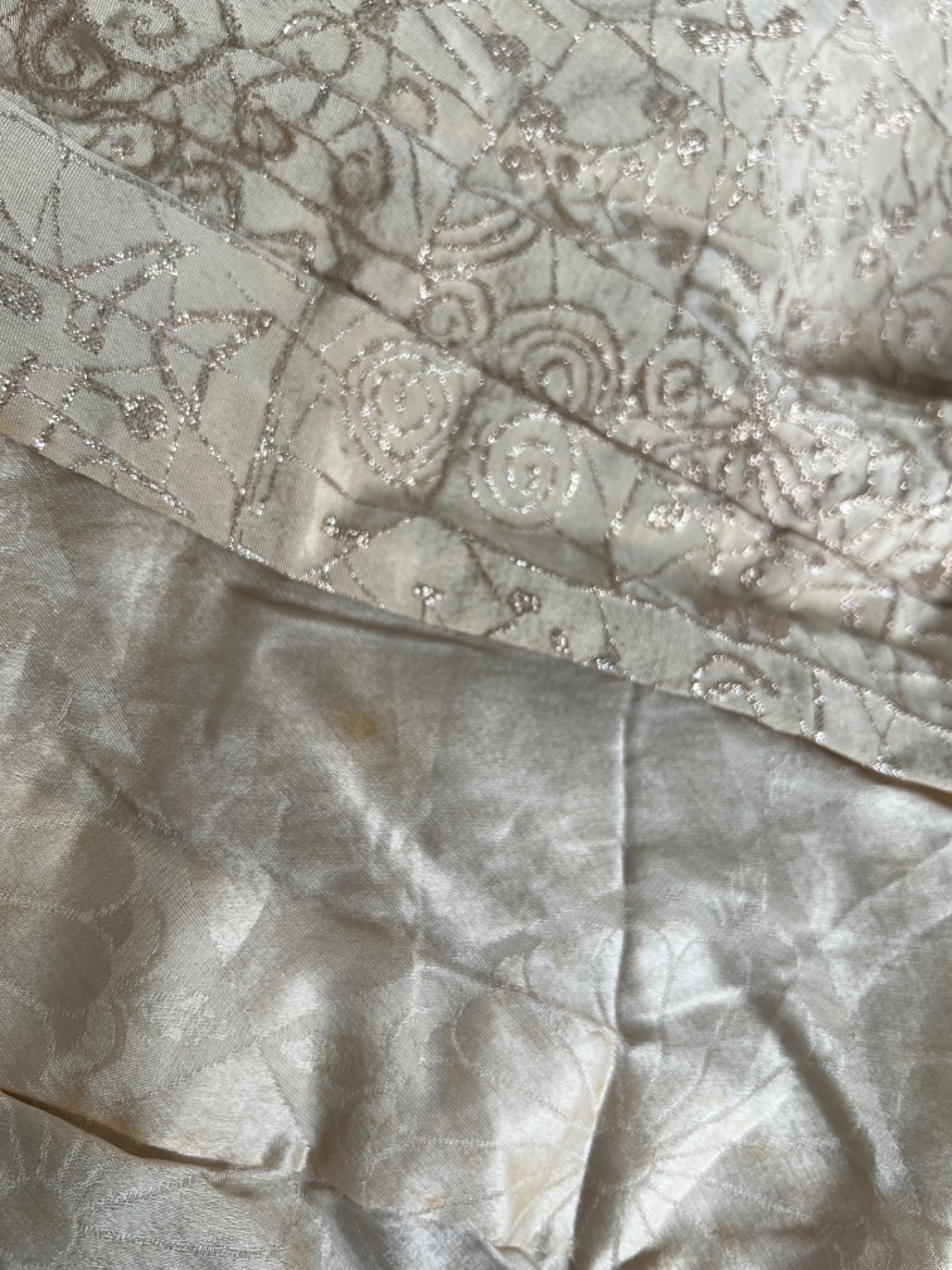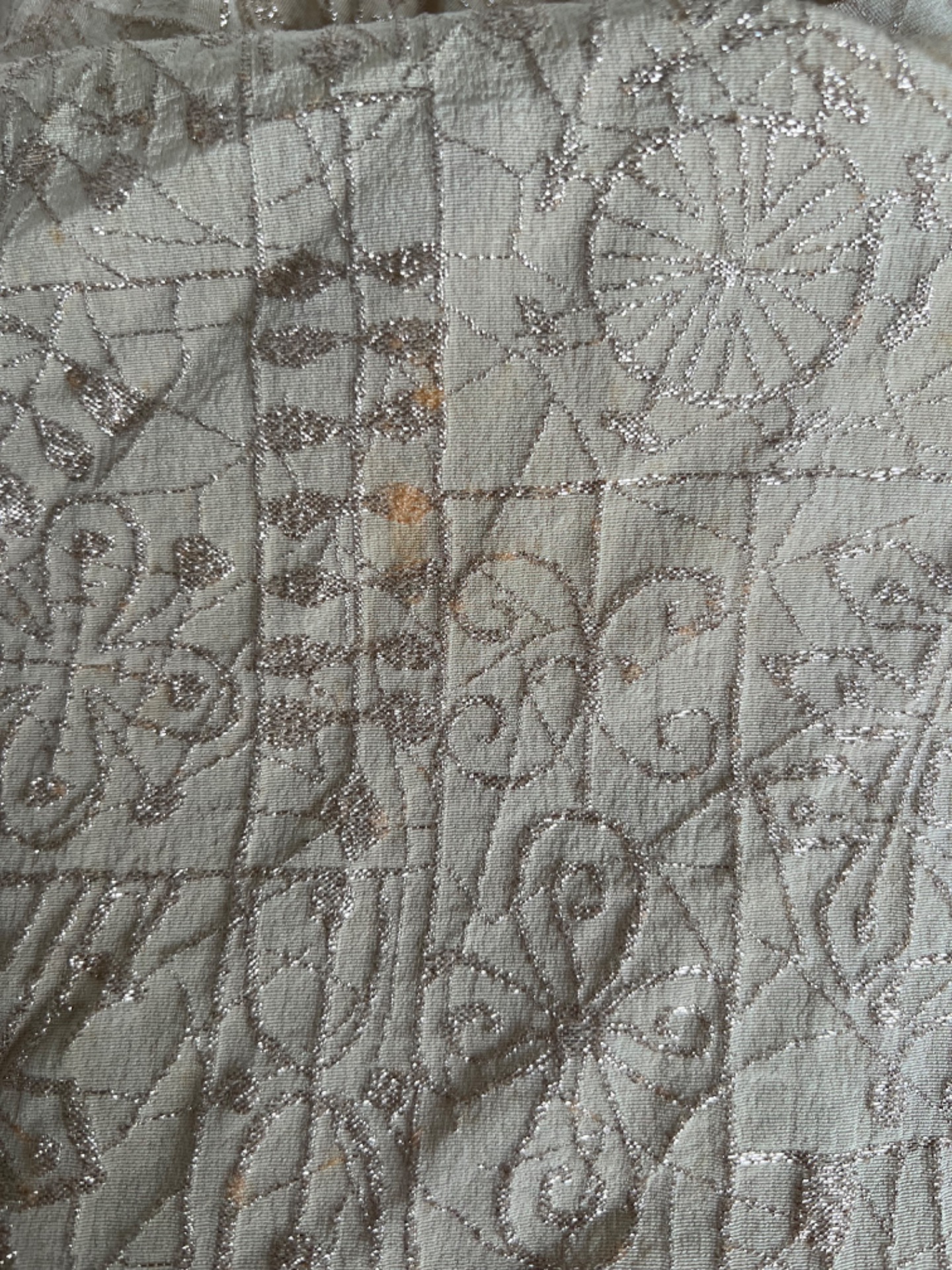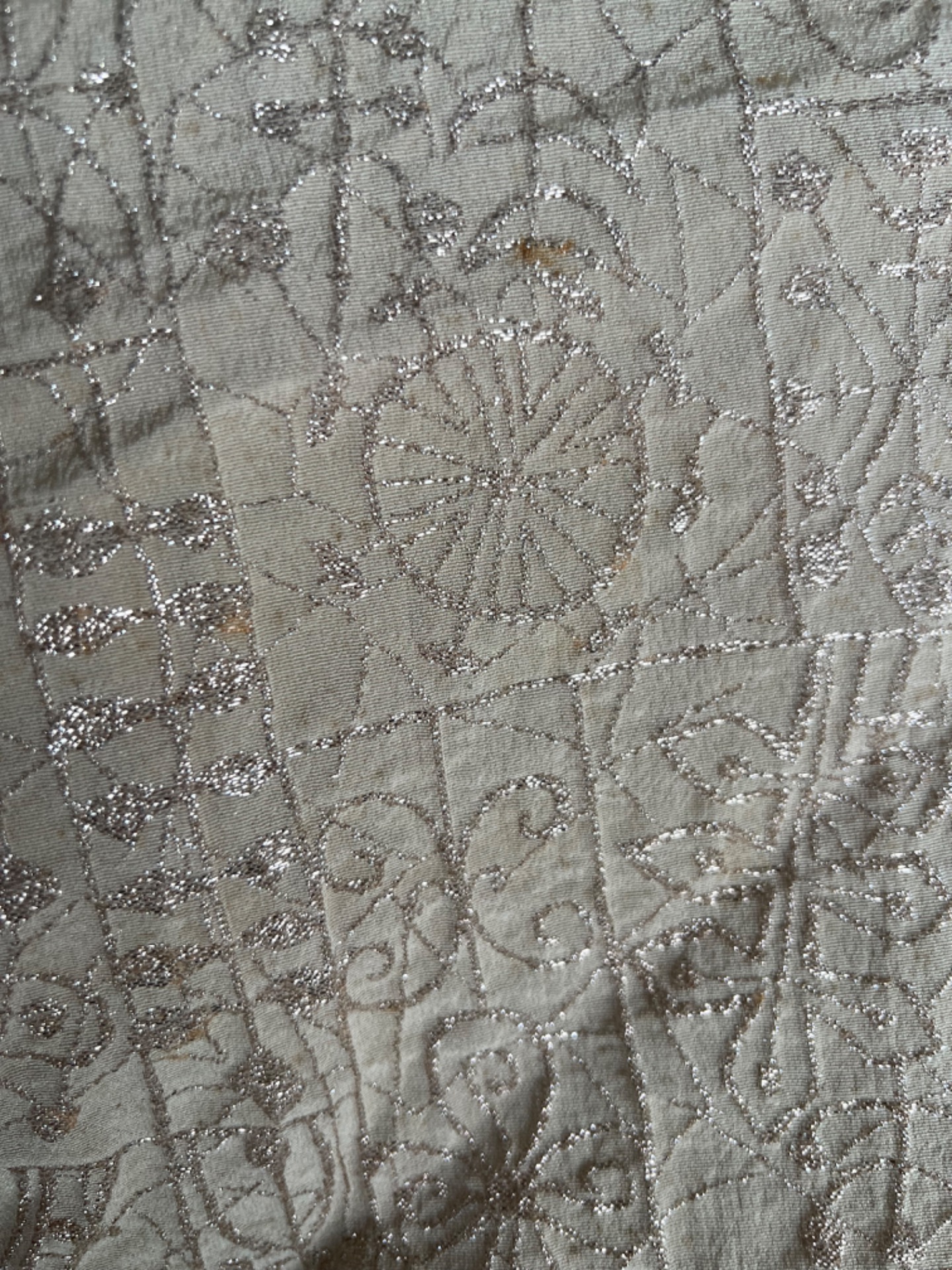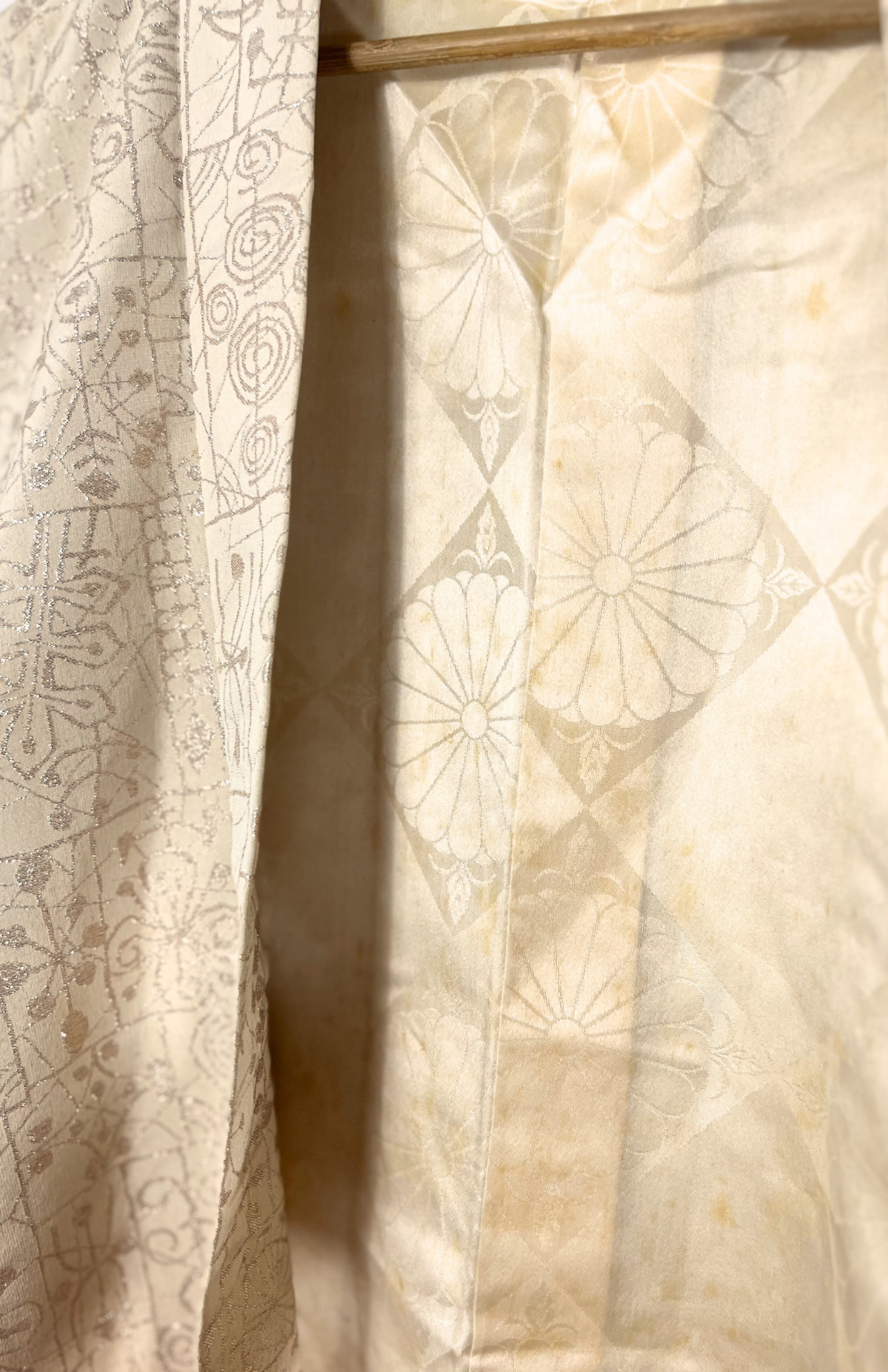 Vintage japonský haori kabátek z příjemné splývavé látky a s jemným vzorem. Má typický rovný střih se širokými rukávy. Zapíná se pomocí tradiční šňůrky v přední části.