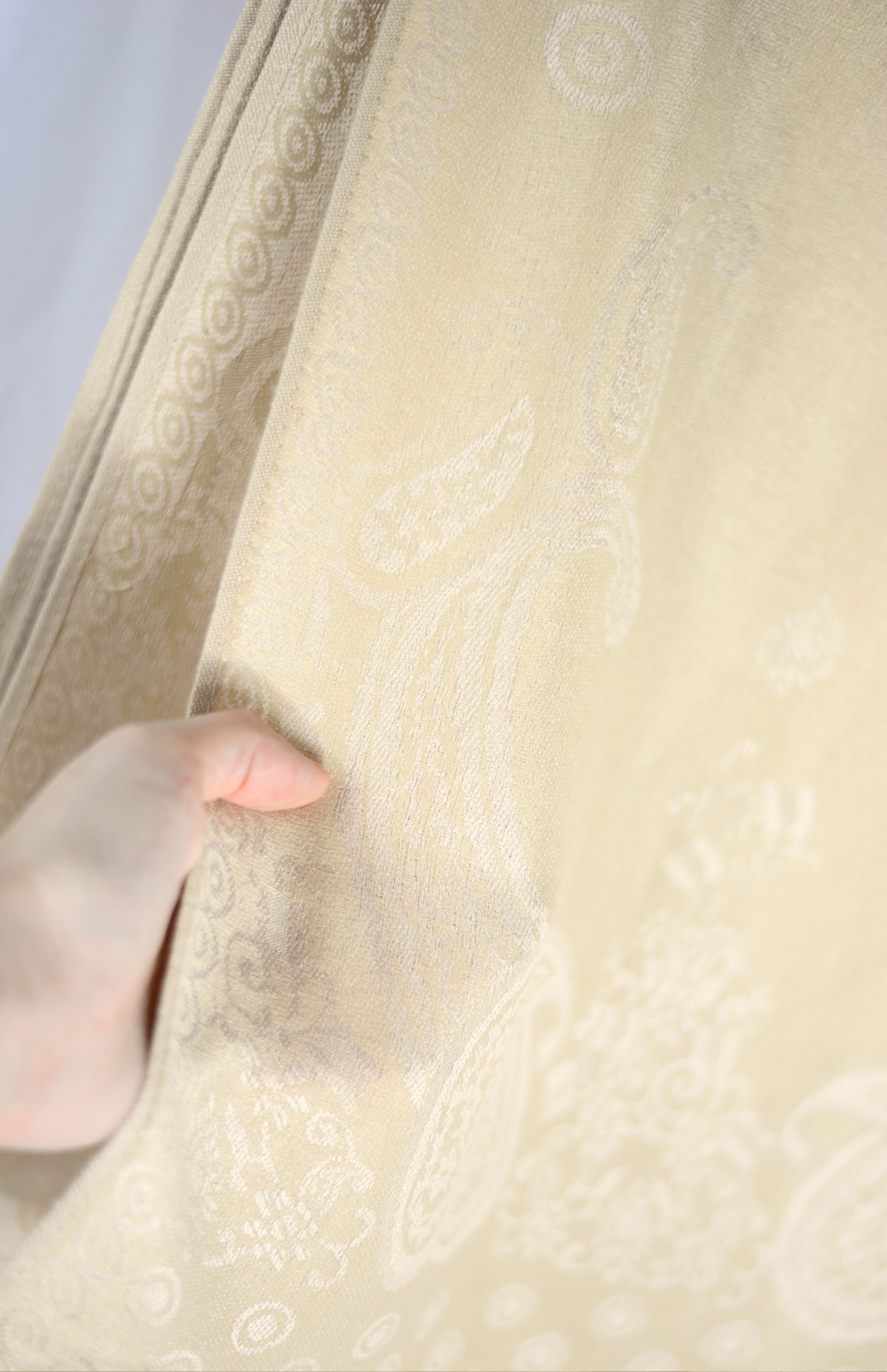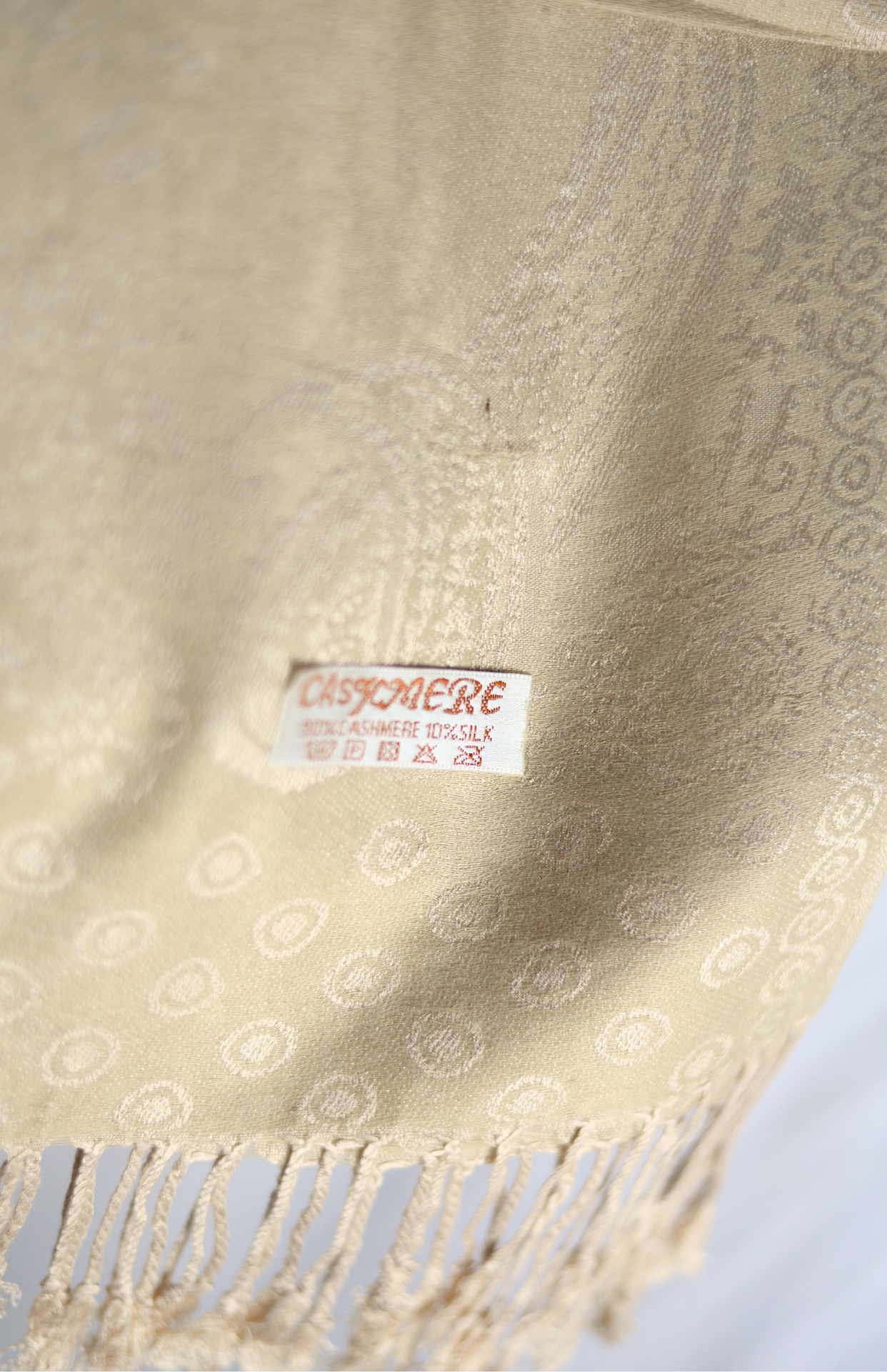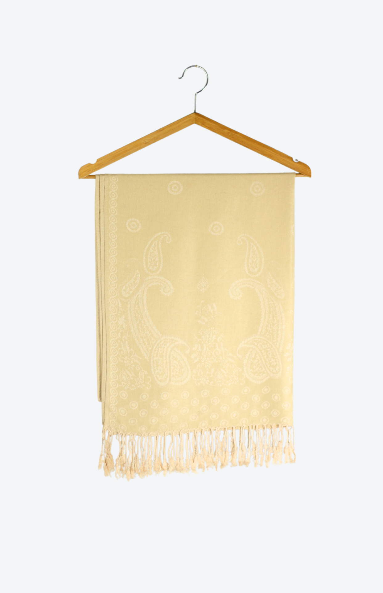Minimalistická pašmínová šála v celistvé barvě, protkané vzorem s krémovou nitkou. Má jemný saténový odlesk a krémové střapečky na koncích. Velmi kvalitně zpracovaná. Tip: pašmína se hodí kolem krku, jako přehoz přes ramena, nebo šikovná deka na cesty.
