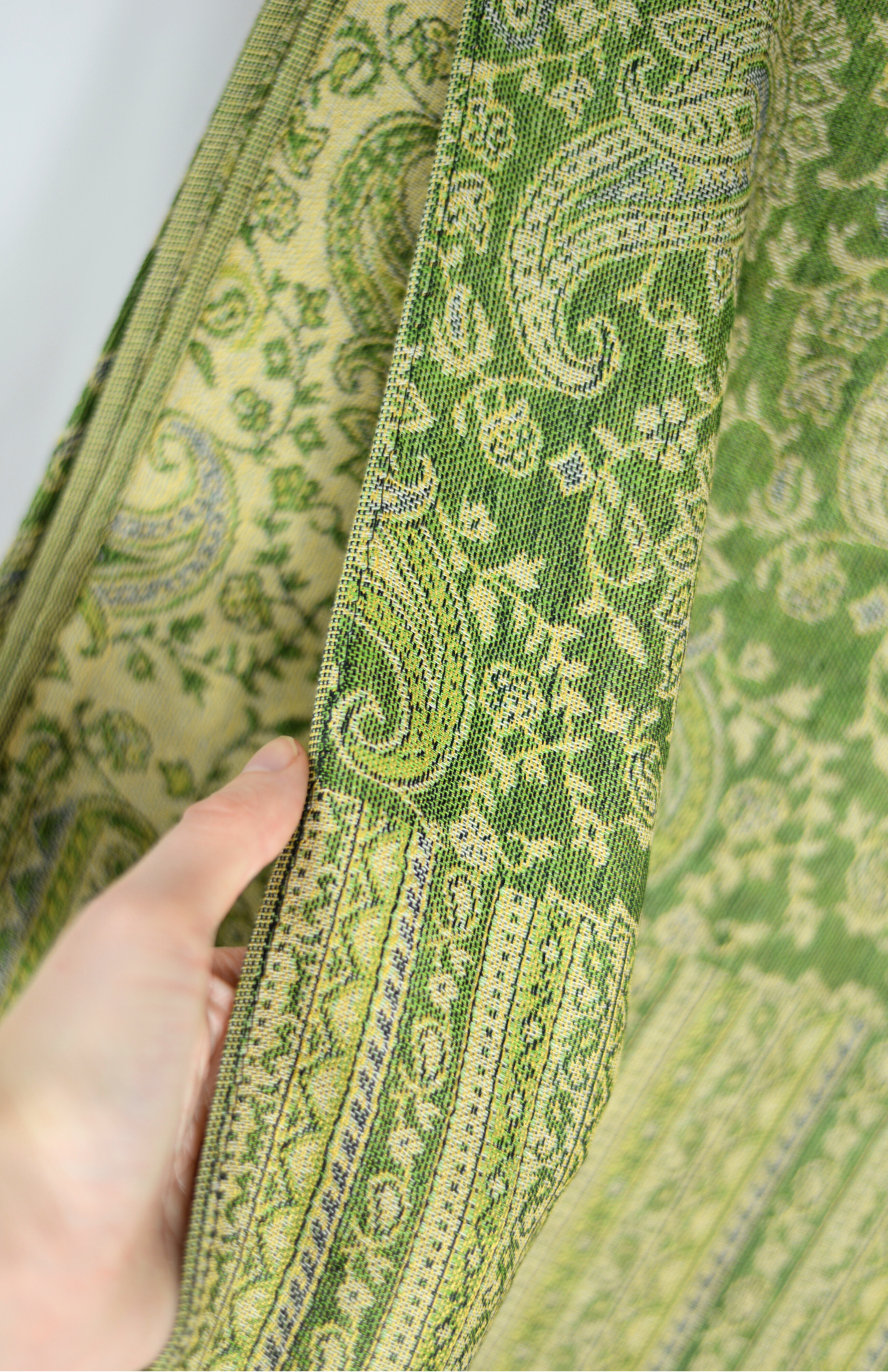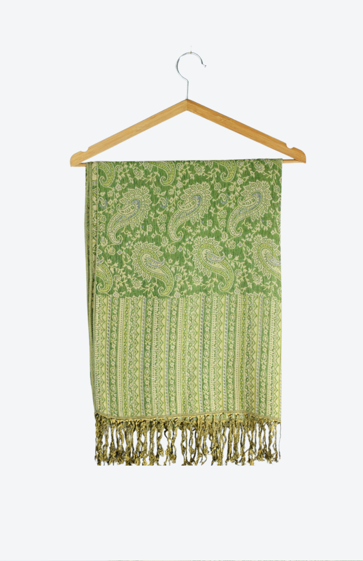Hladce vytkávaná pašmínová šála s kombinací tenkých proužkovaných vzorů a výraznější střední části. Má jemný saténový odlesk a kontrastní střapečky na koncích. Velmi kvalitně zpracovaná. Tip: pašmína se hodí kolem krku, jako přehoz přes ramena, nebo šikovná deka na cesty.