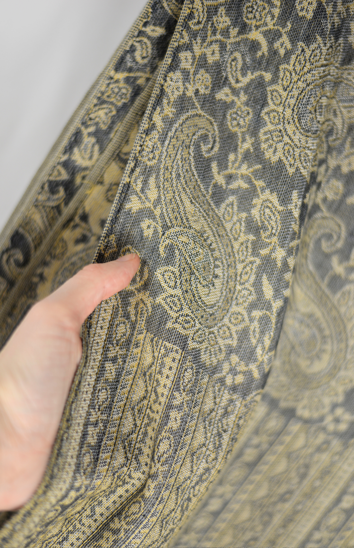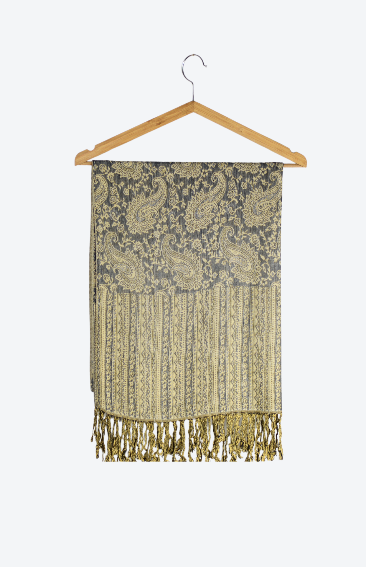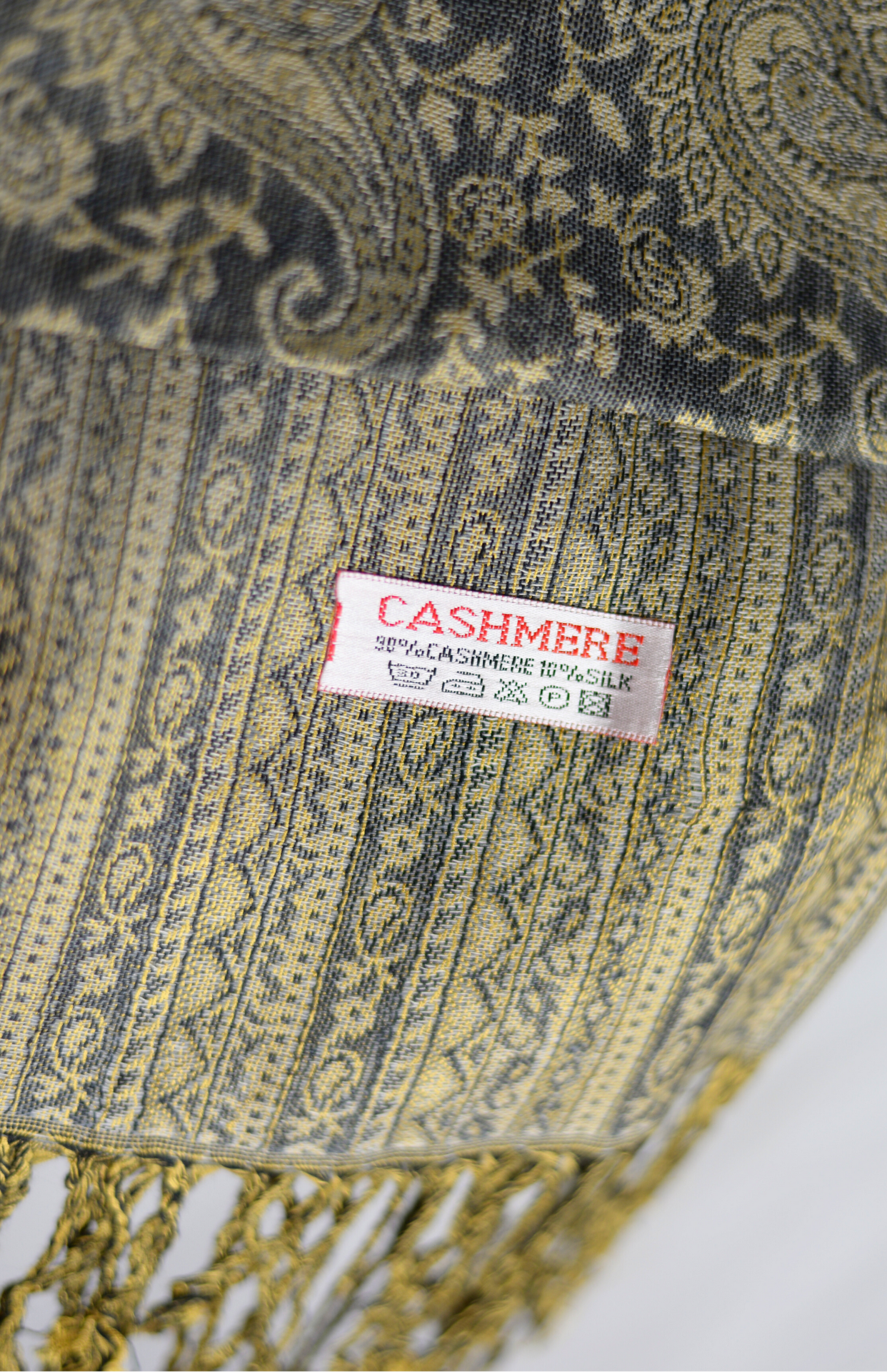 Hladce vytkávaná pašmínová šála s kombinací tenkých proužkovaných vzorů a výraznější střední části. Má jemný saténový odlesk a kontrastní střapečky na koncích. Velmi kvalitně zpracovaná. Tip: pašmína se hodí kolem krku, jako přehoz přes ramena, nebo šikovná deka na cesty.