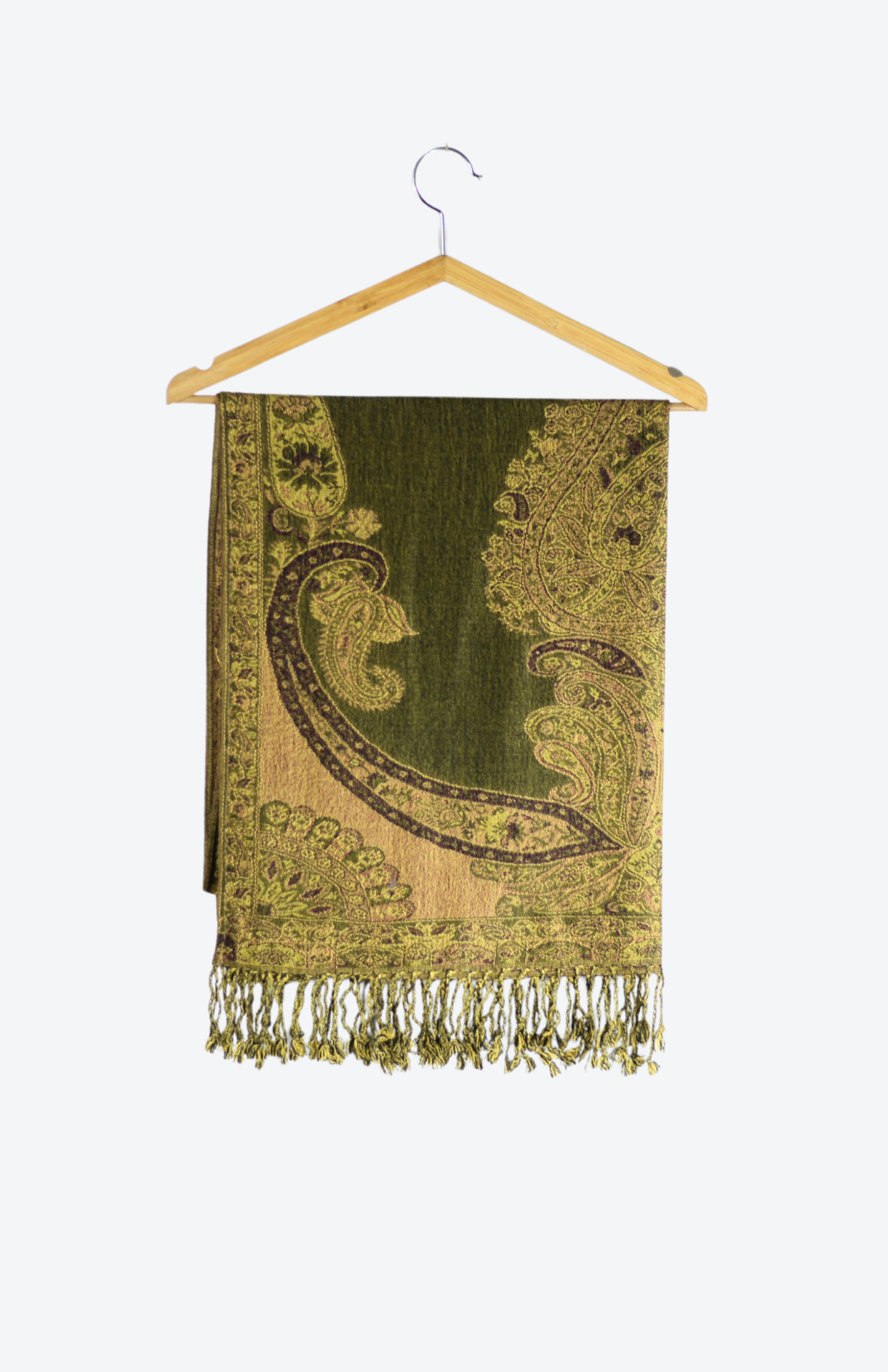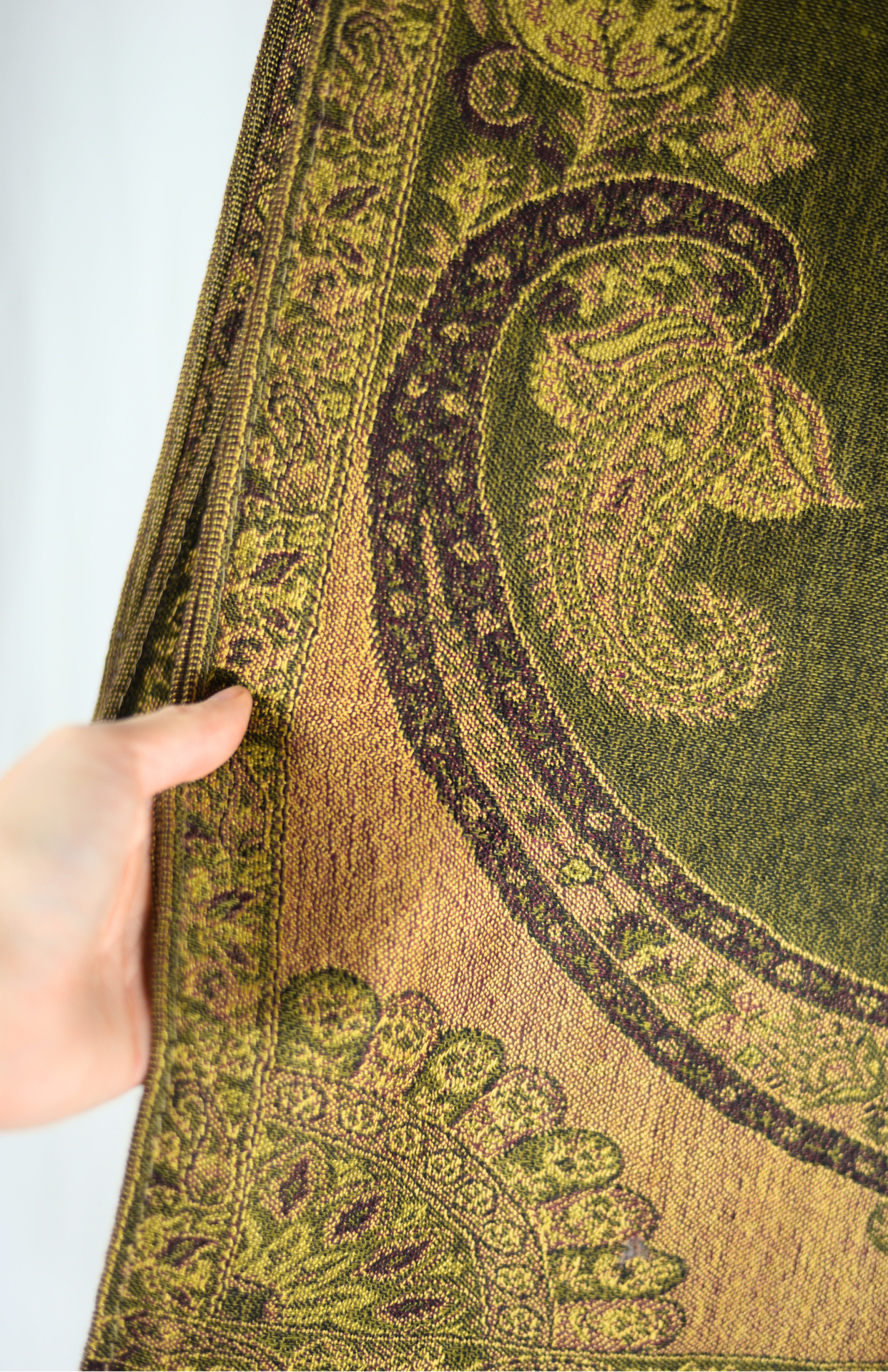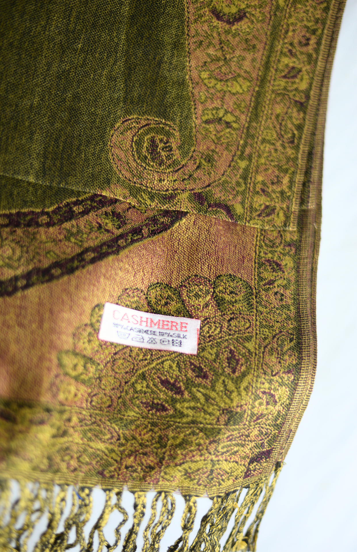 Hladce vytkávaná pašmínová šála s krásnými vzory a barevnými bloky, připomínající dekory secese. Má jemný saténový odlesk a kontrastní střapečky na koncích. Velmi kvalitně zpracovaná. Tip: pašmína se hodí kolem krku, jako přehoz přes ramena, nebo šikovná deka na cesty.