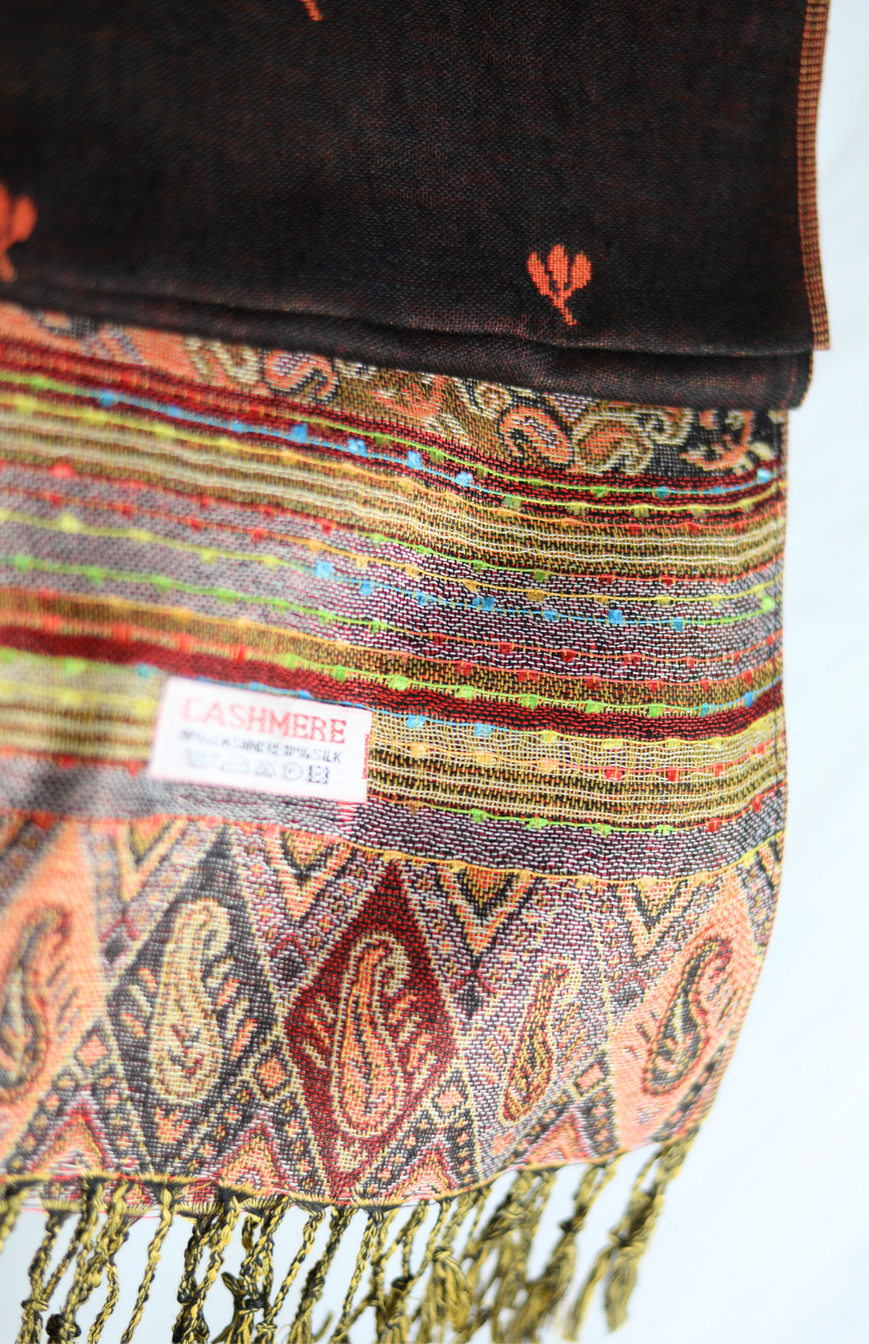 Pašmína s propracovanými ornamenty, protkaná barevnou nitkou na koncích a barevným středem s lístky. Má silnější gramáž, příjemnou a hladkou na omak. Střapečky na koncích a kvalitní zpracování. Tip: pašmína se hodí kolem krku, jako přehoz přes ramena, nebo šikovná deka na cesty.