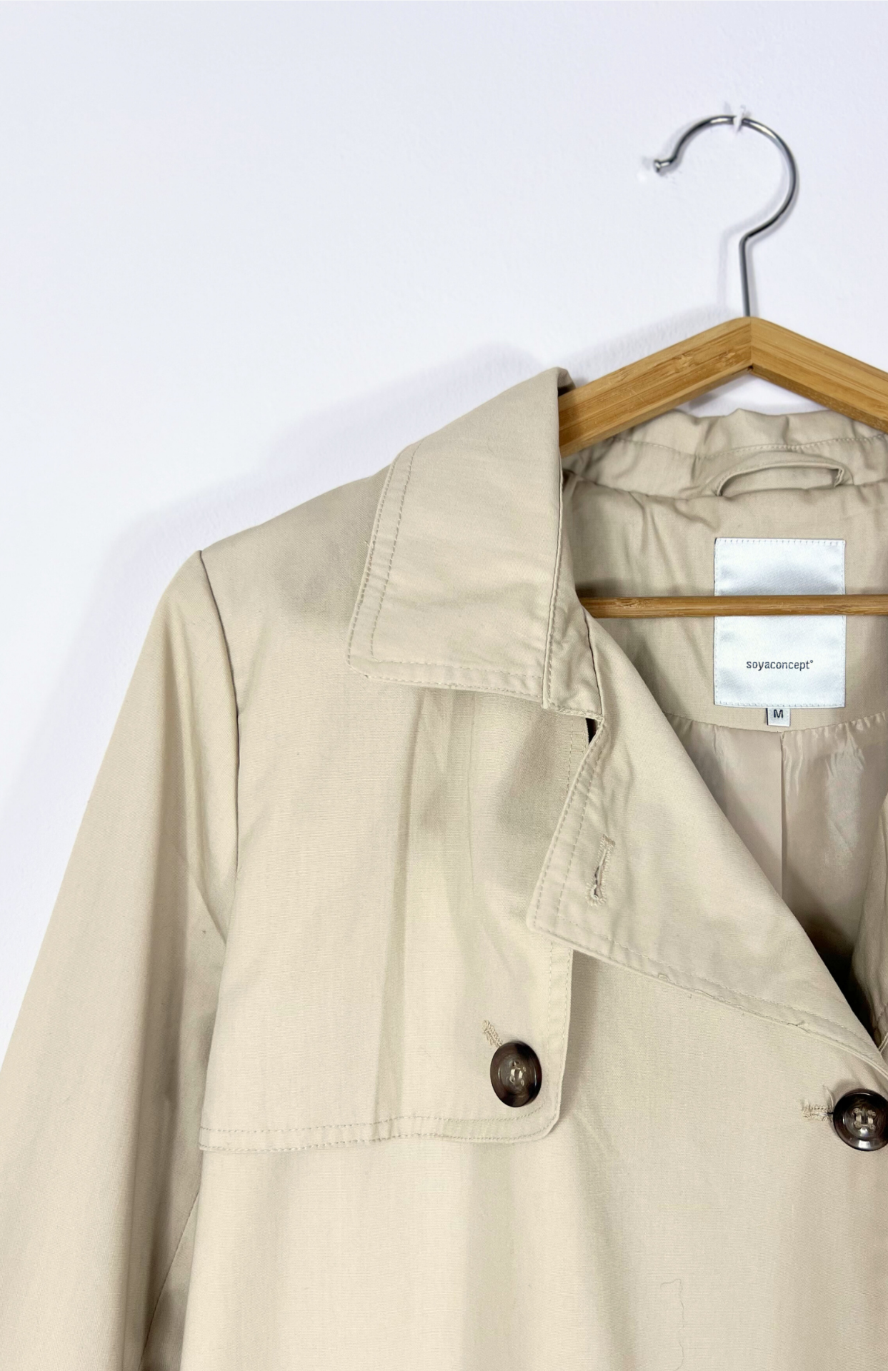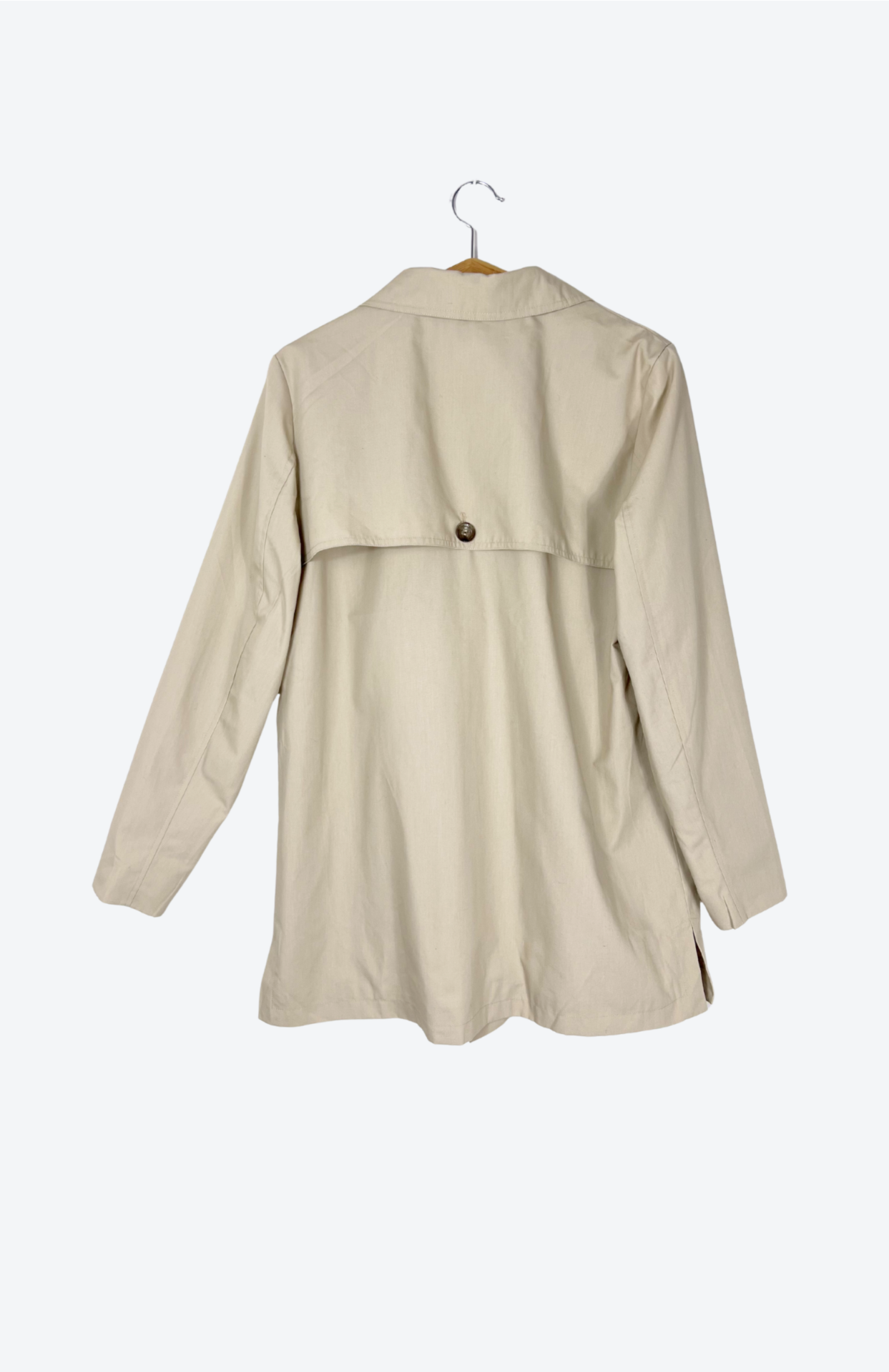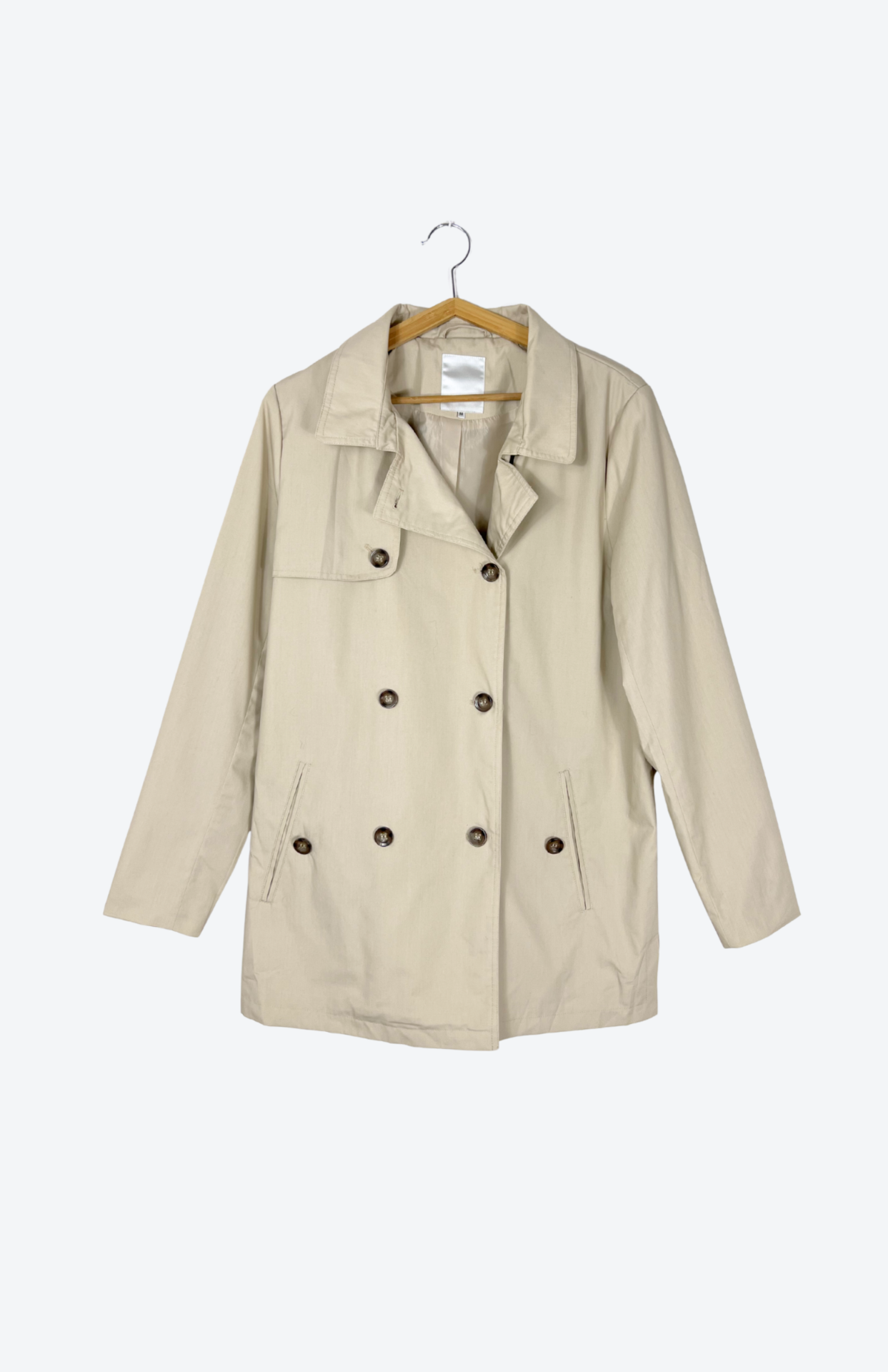 Klasický krémový trench coat. Má kratší volný střih a zapínání na hnědé žíhané knoflíky. Kapsy po stranách.Stav: Ve skvělém stavu, bez vad.