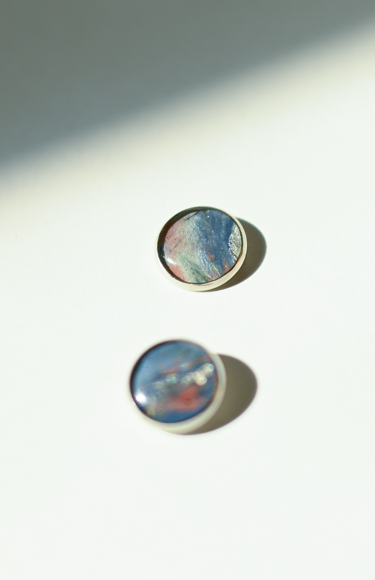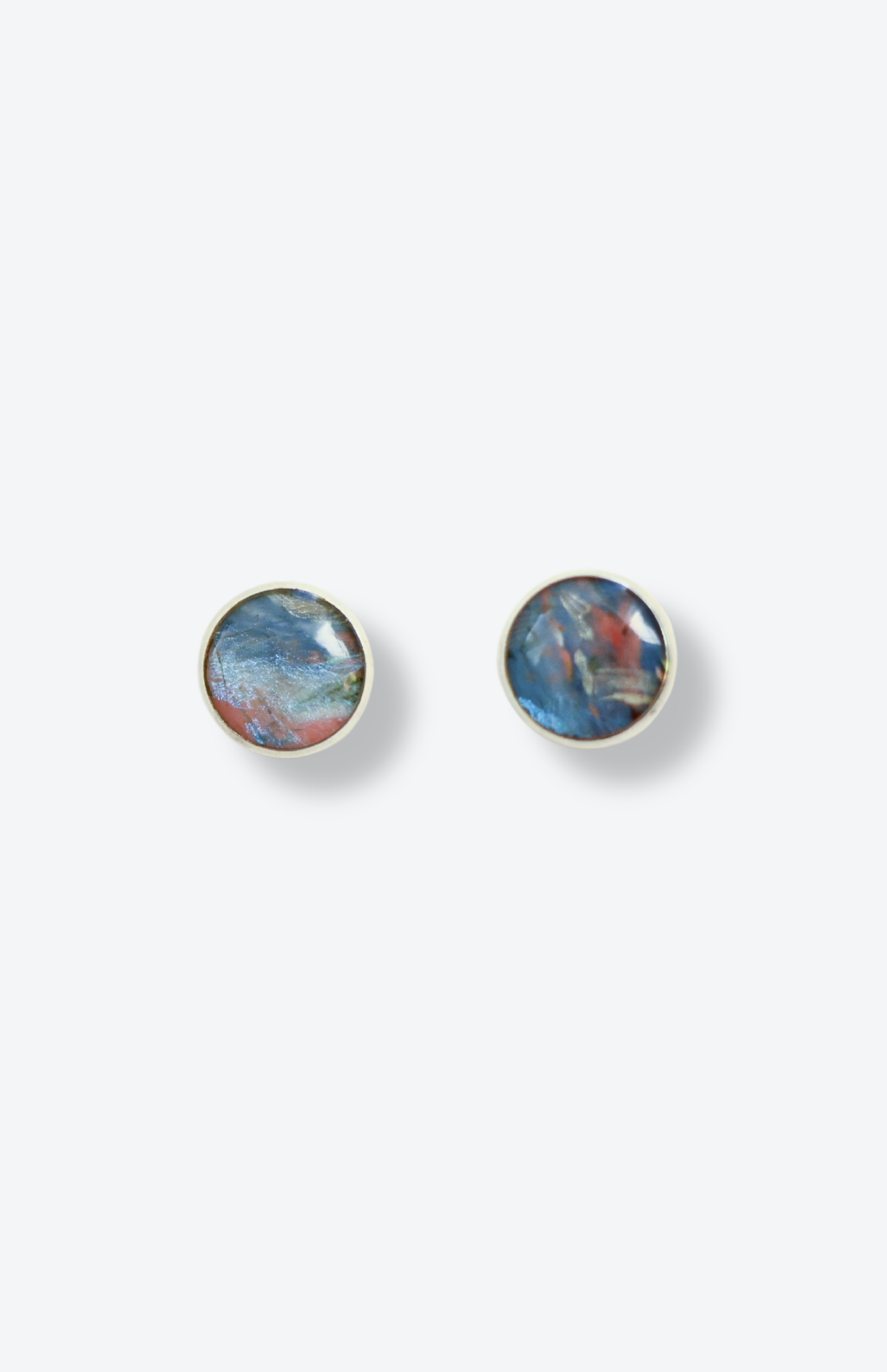 Náušnice s ručně malovanou abstrakcí zatavenou navěky v pryskyřici. Každá z páru je individuál, ale navzájem se doplňují.