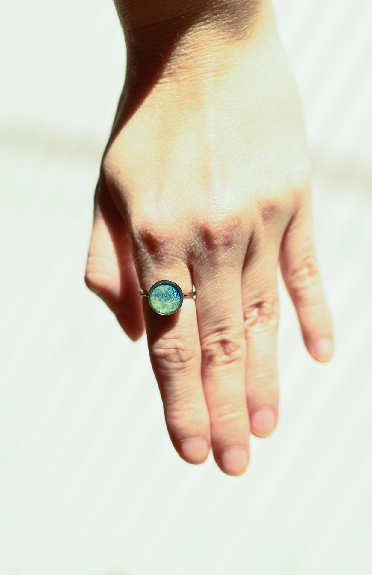 Prsten s ručně malovanou abstrakcí zatavenou navěky v pryskyřici. Velikost je nastavitelná.