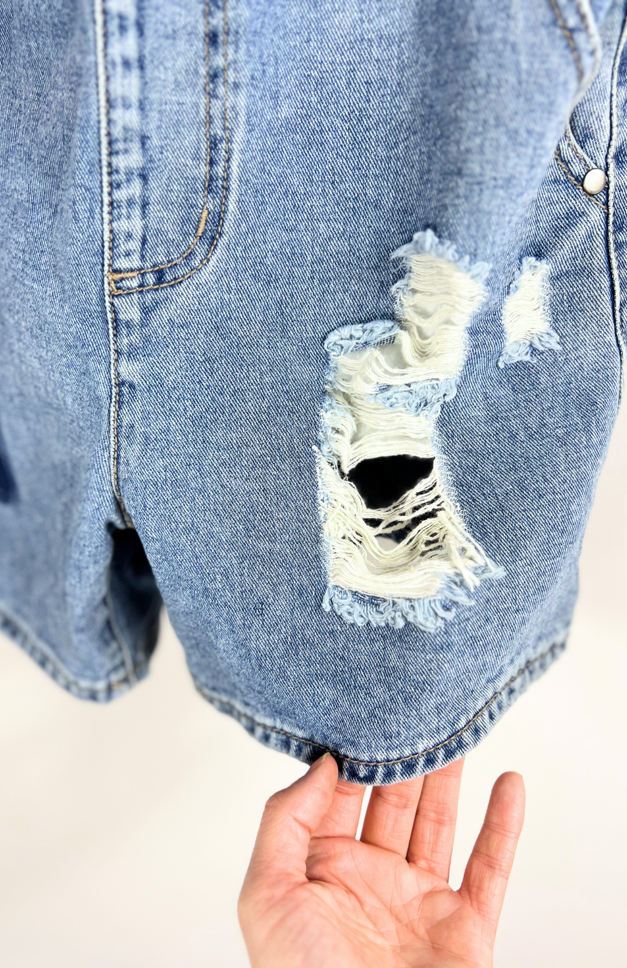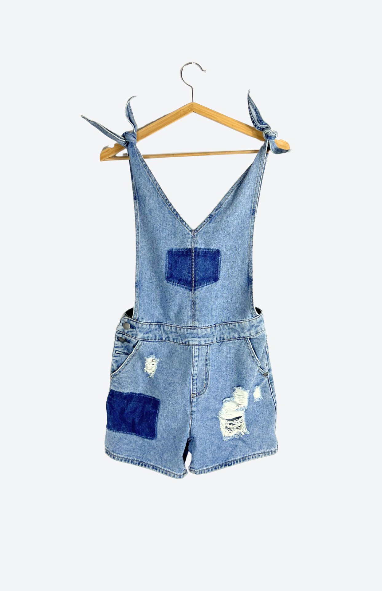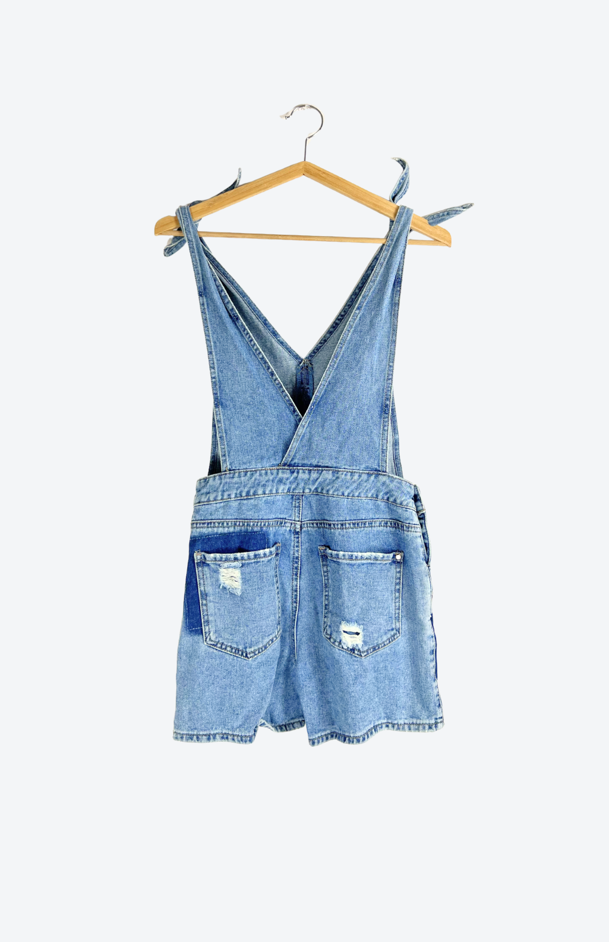 Denim funky laclové šortky s trháním. Mají nastavitelná ramena na uzlíky. Na bocích kapsy a druky.
