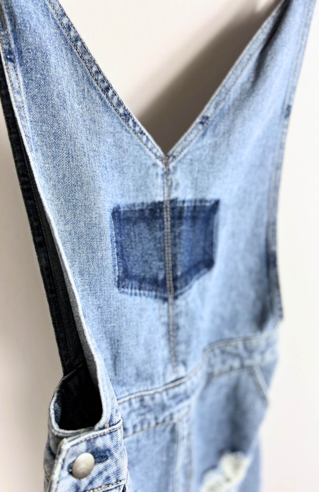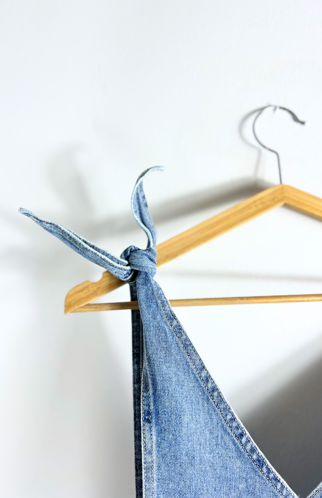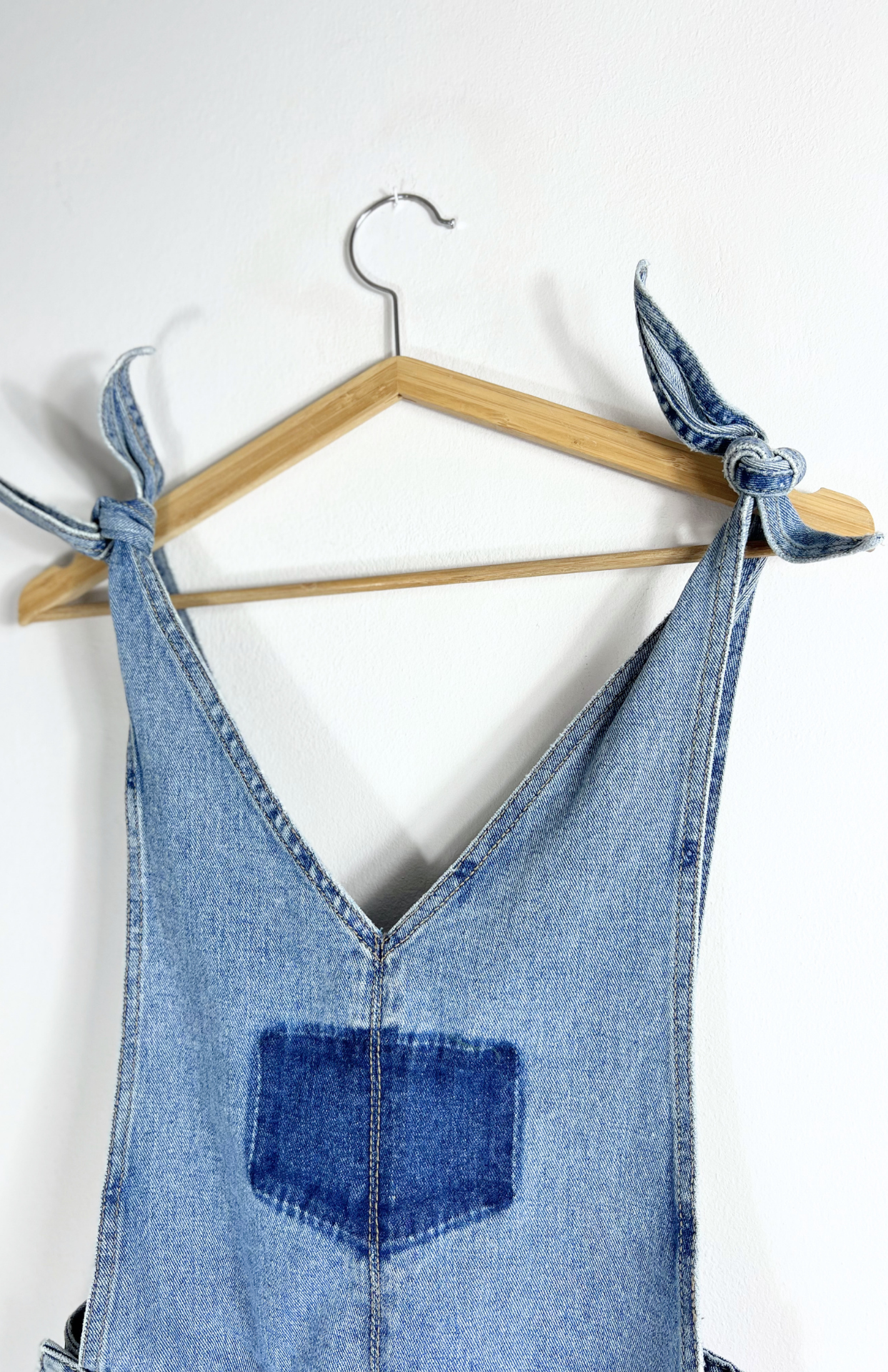Denim funky laclové šortky s trháním. Mají nastavitelná ramena na uzlíky. Na bocích kapsy a druky.