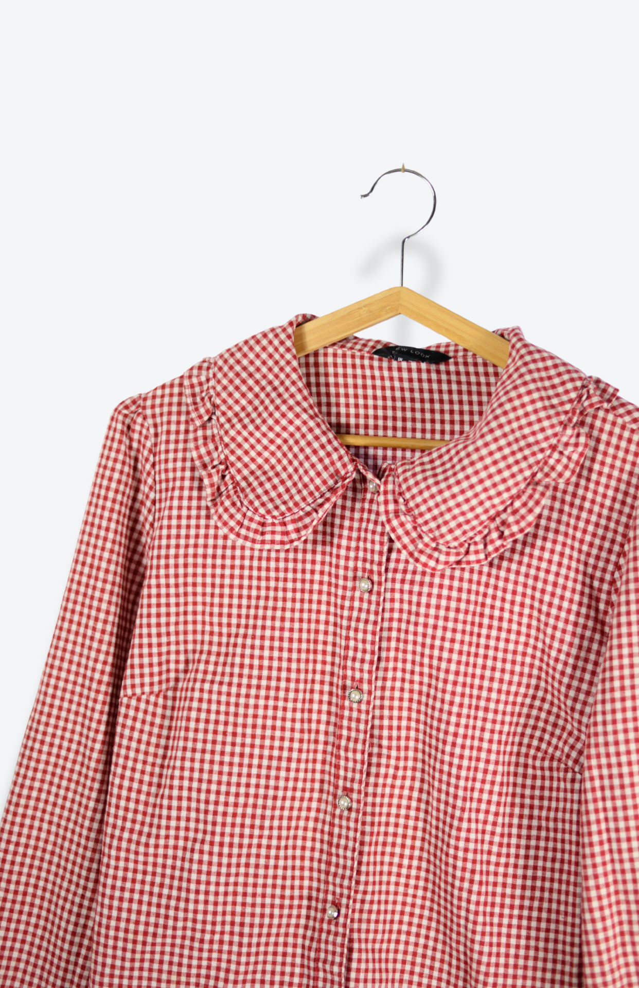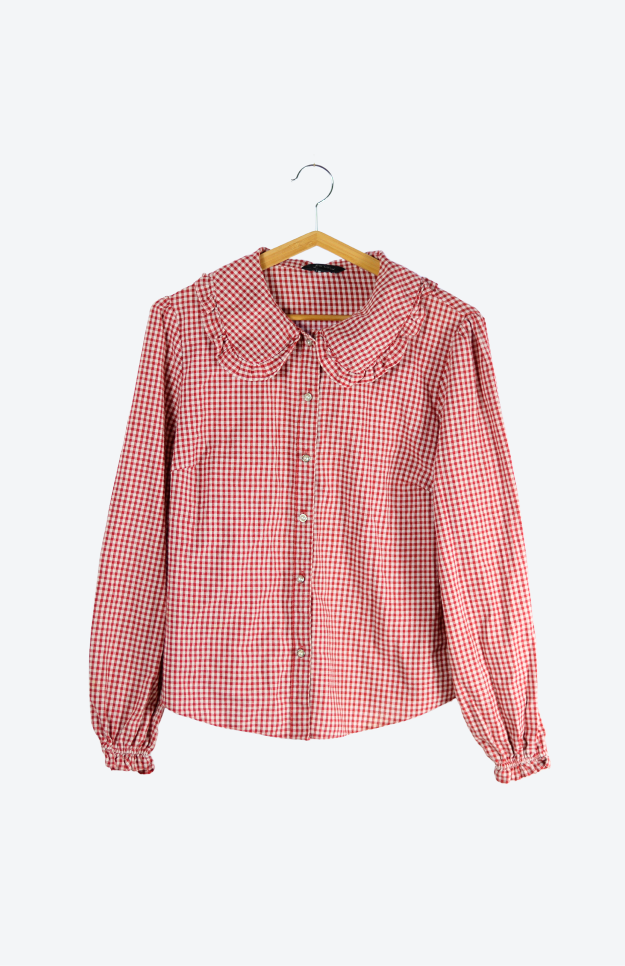 Košile s drobnou kostkou a výrazným, vlnkou lemovaným límečkem. Má zdobené knoflíčky a zabrání na koncích rukávů. Příjemný nemačkavý kousek.