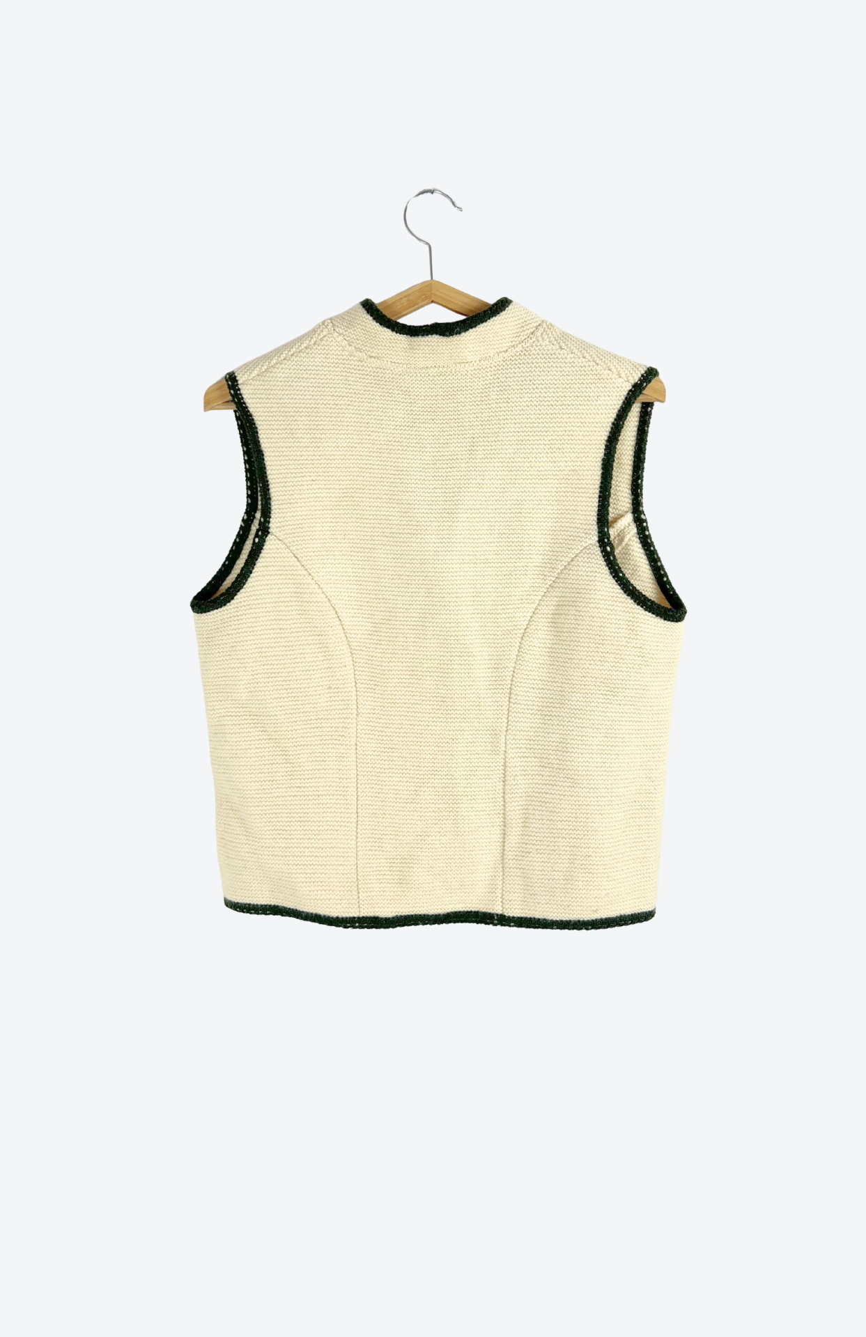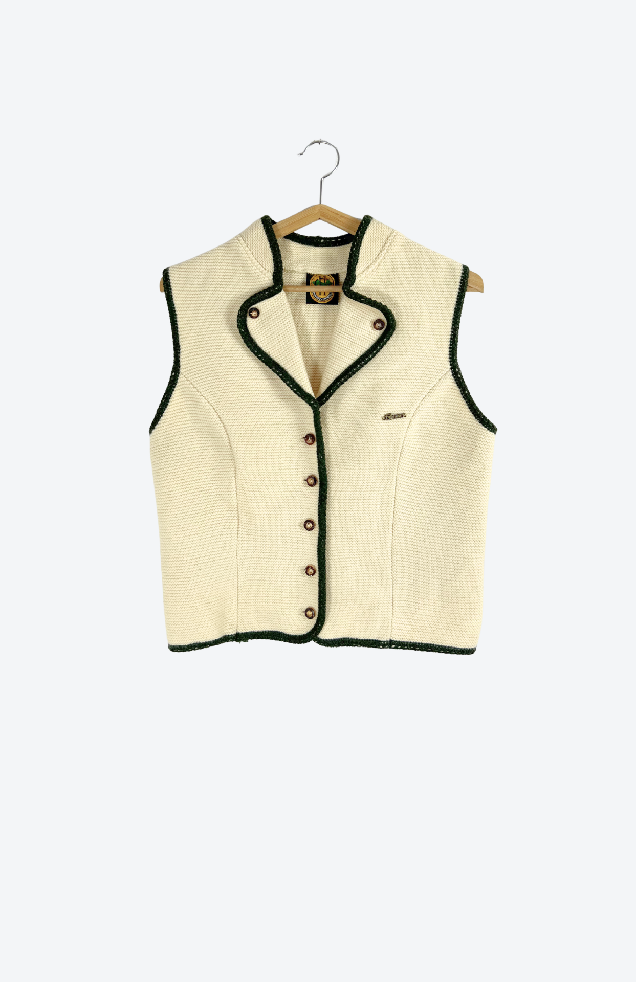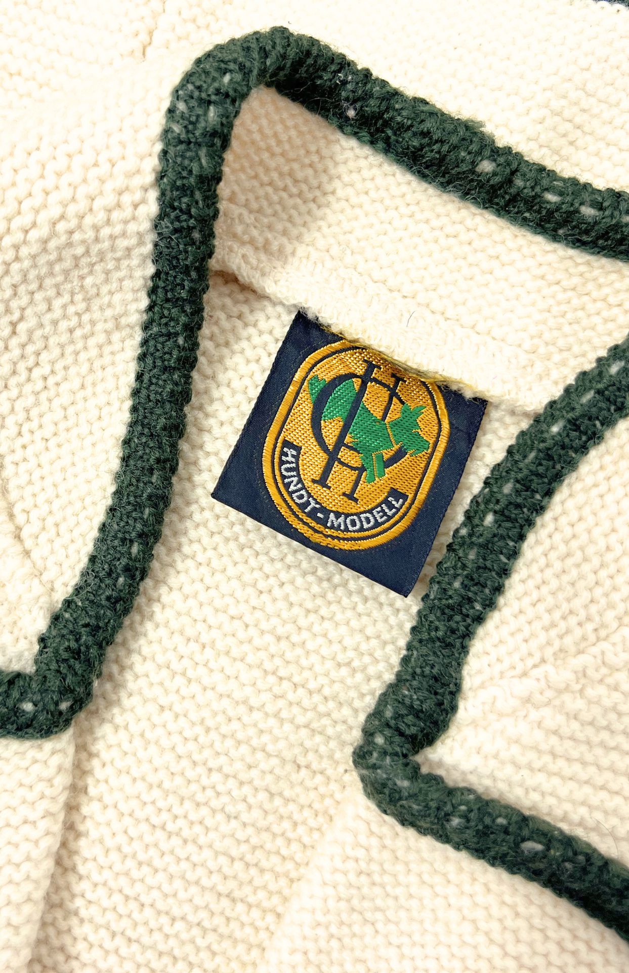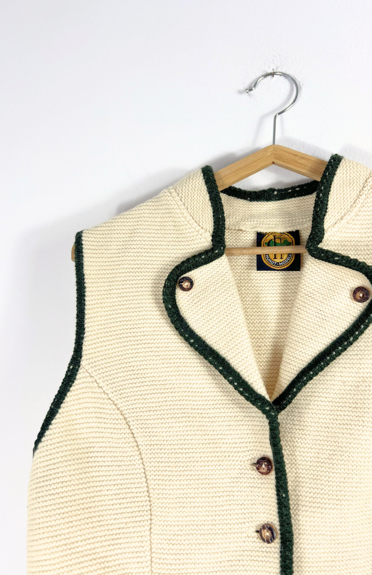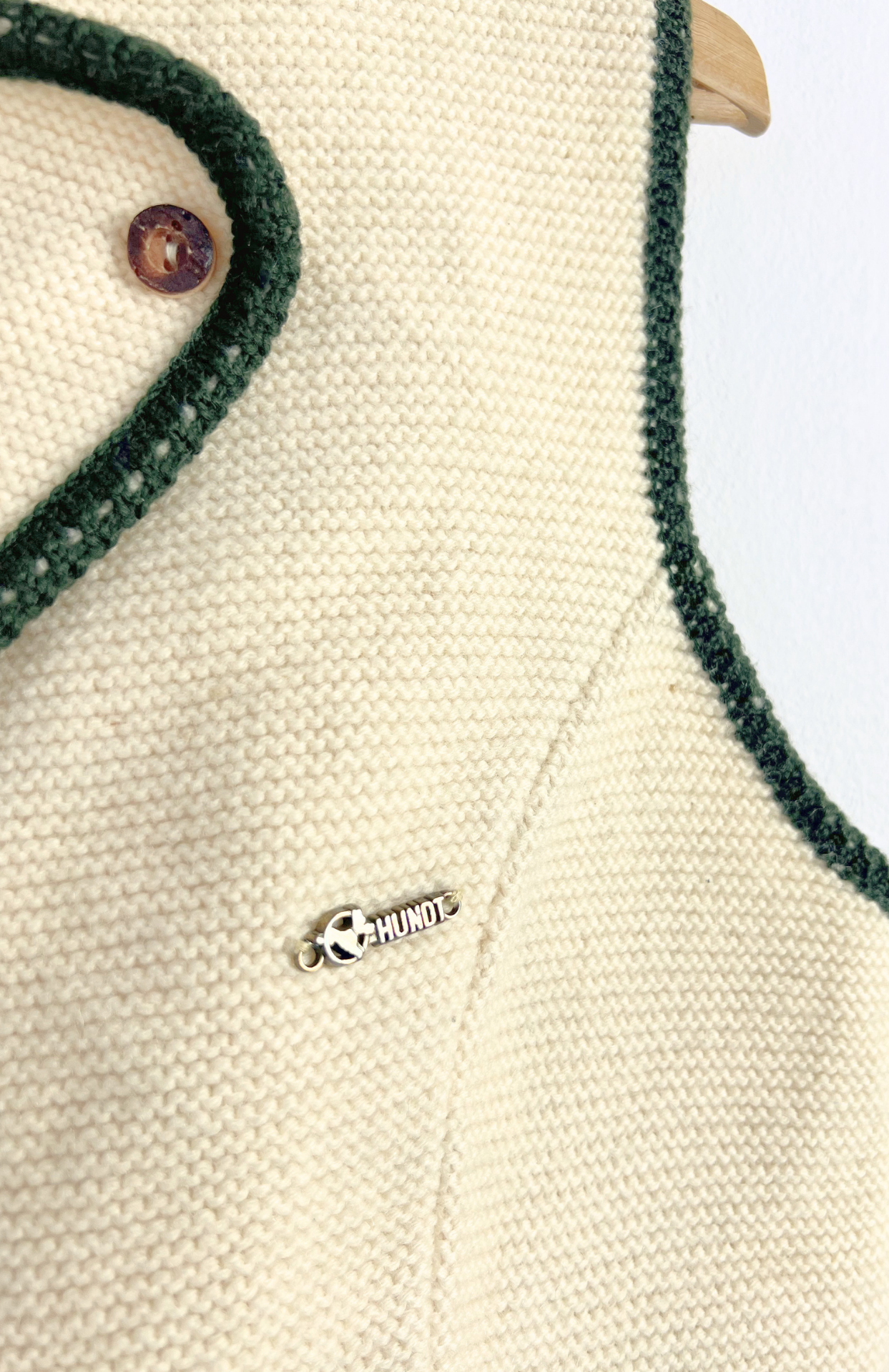 Čistě vlněná vintage trachtová vesta. Krémová, lemovaná tmavě zelenou. Silný teplý úplet a pěknými detaily.Stav: Ve skvělém stavu, bez vad.Materiál: 100% vlnaZnačka: Hundy Modell