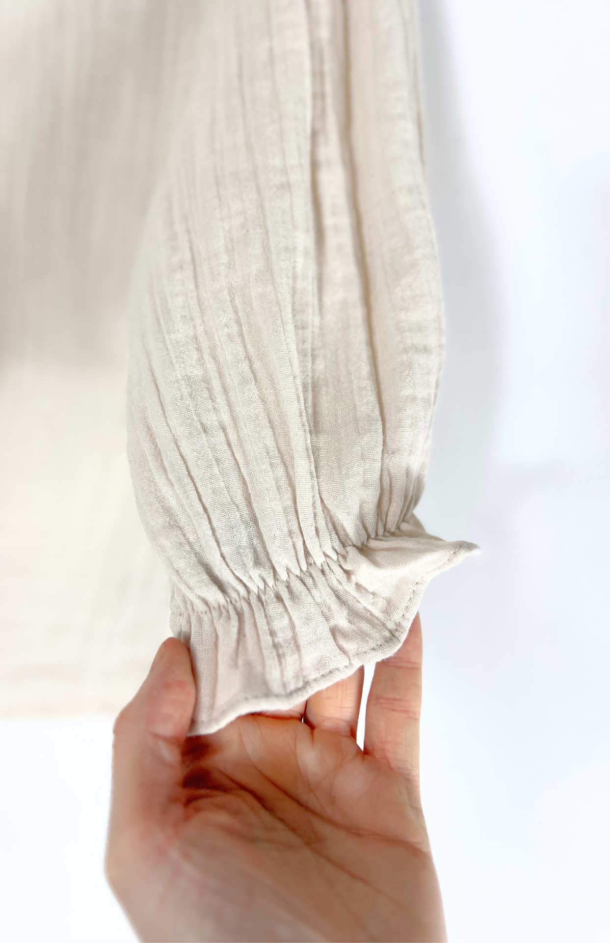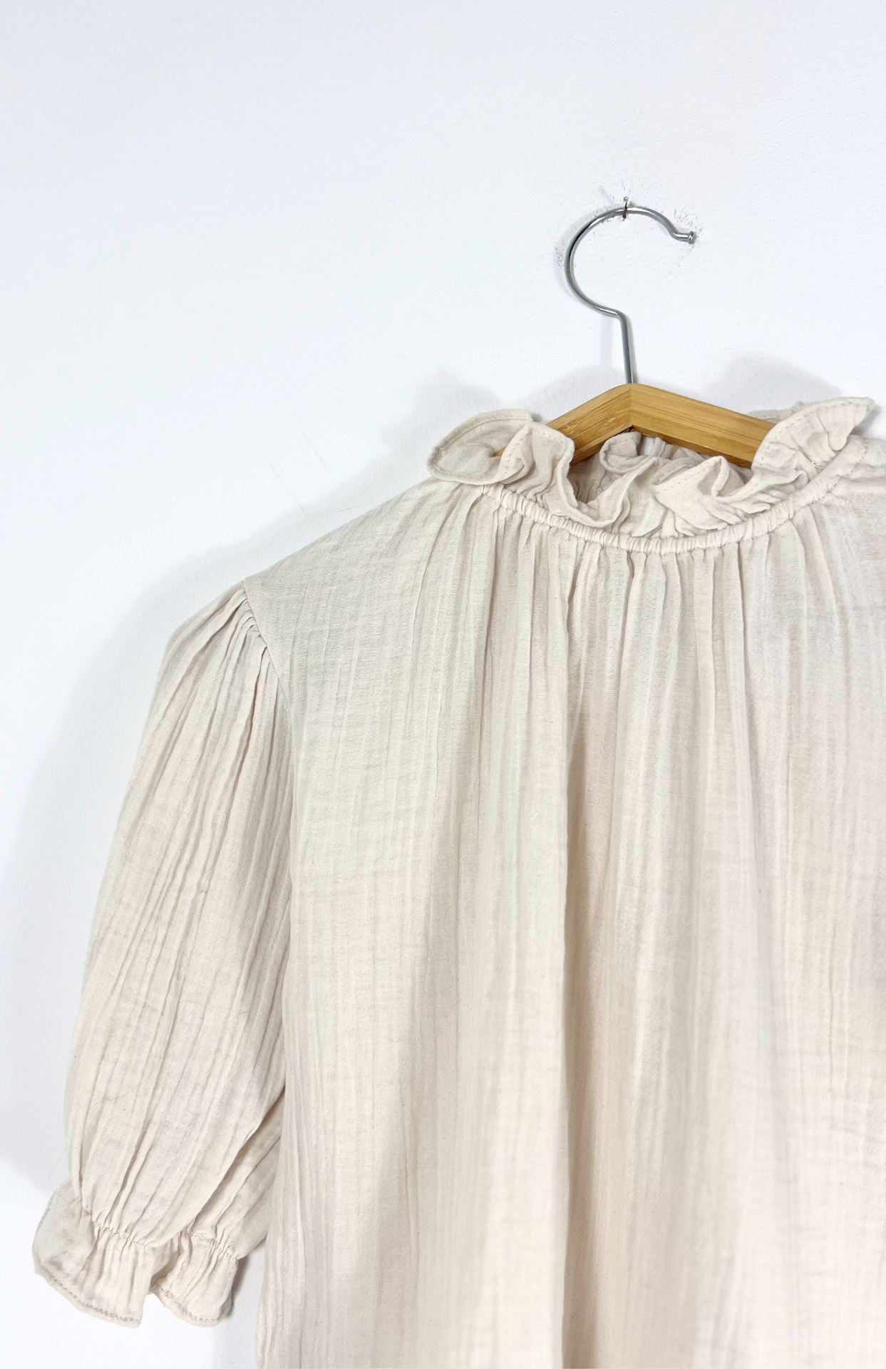 Krémový mušelinový crop s volánkem. Má poloviční, nabírané rukávy a volánek u krku.