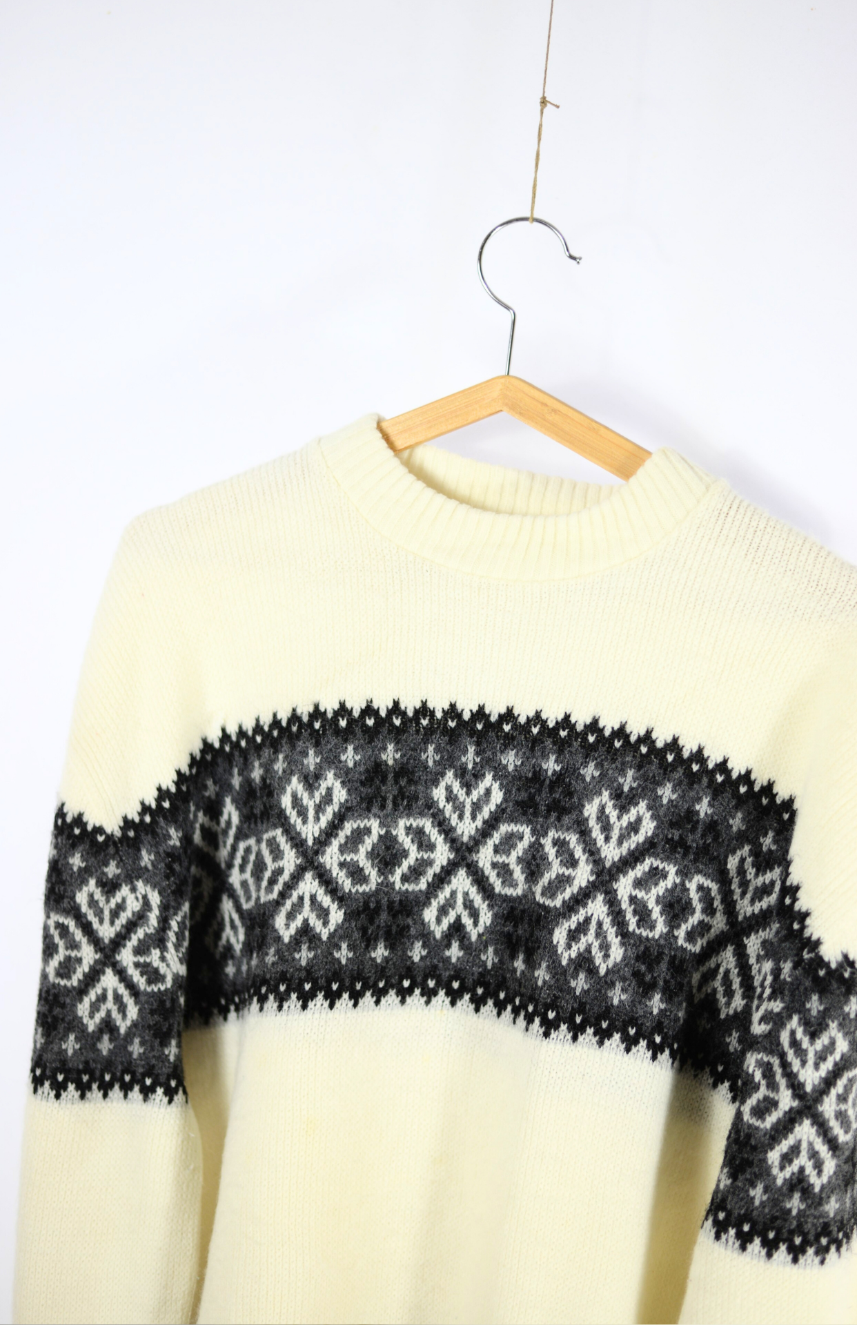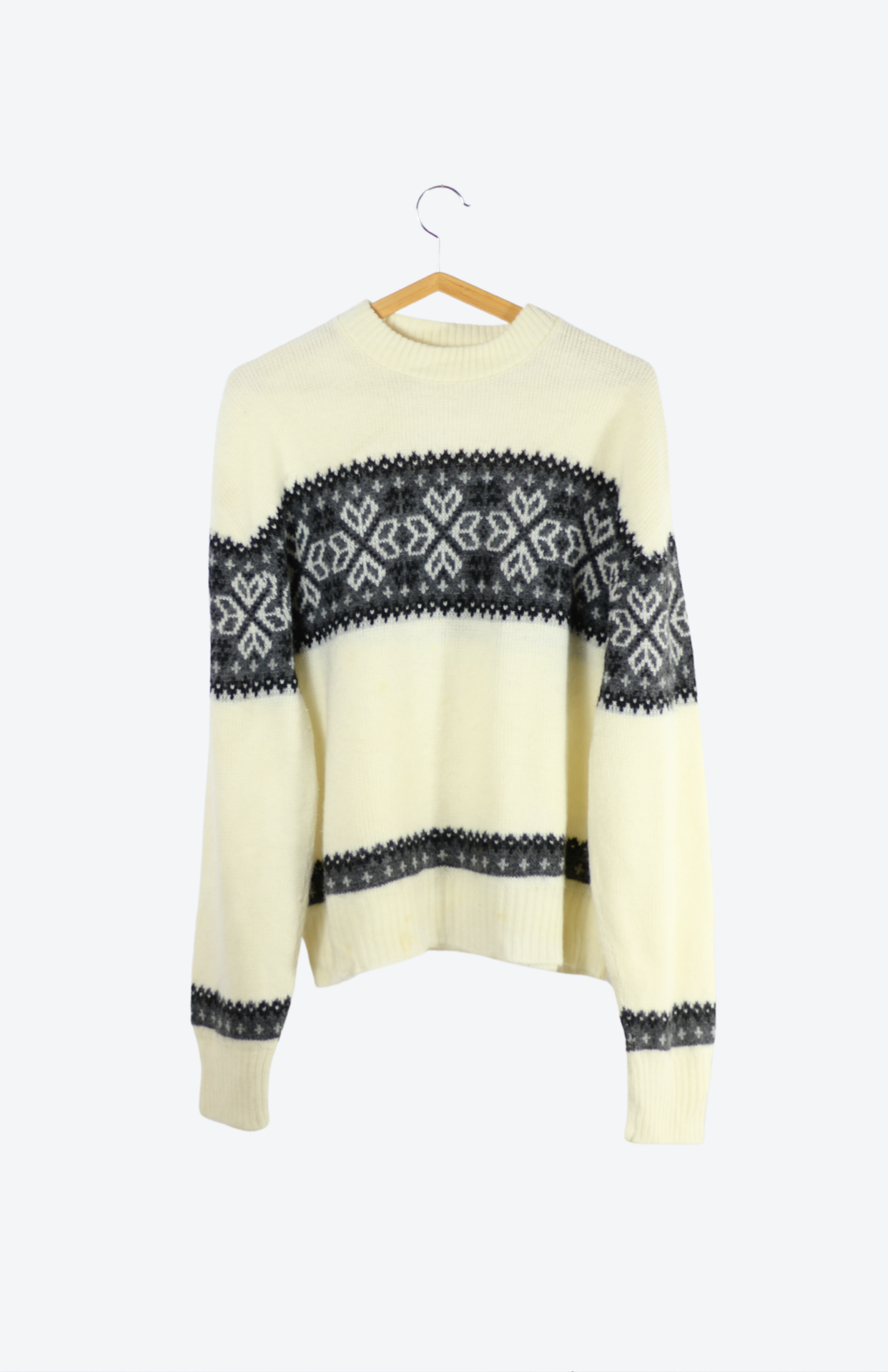 Vinatge svetr s černobílým vzorem. Má lehce nabíraný rukáv a střední hebký úplet. Pěkně zpracovaný. Stav: Vintage kousek ve skvělém stavu, bez vad.Materiál: 100% orlon akryl