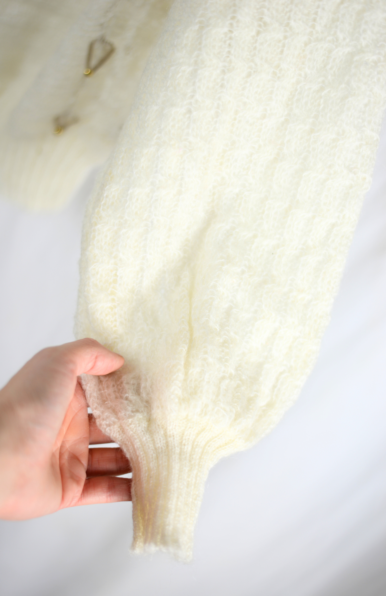 Hebký krémový svetr s jemným stojáčkem u krku. Zdobený stužkami a zlatým korálkem. Moc příjemný na omak. Nabíraný rukáv a lehce netopýří střih.