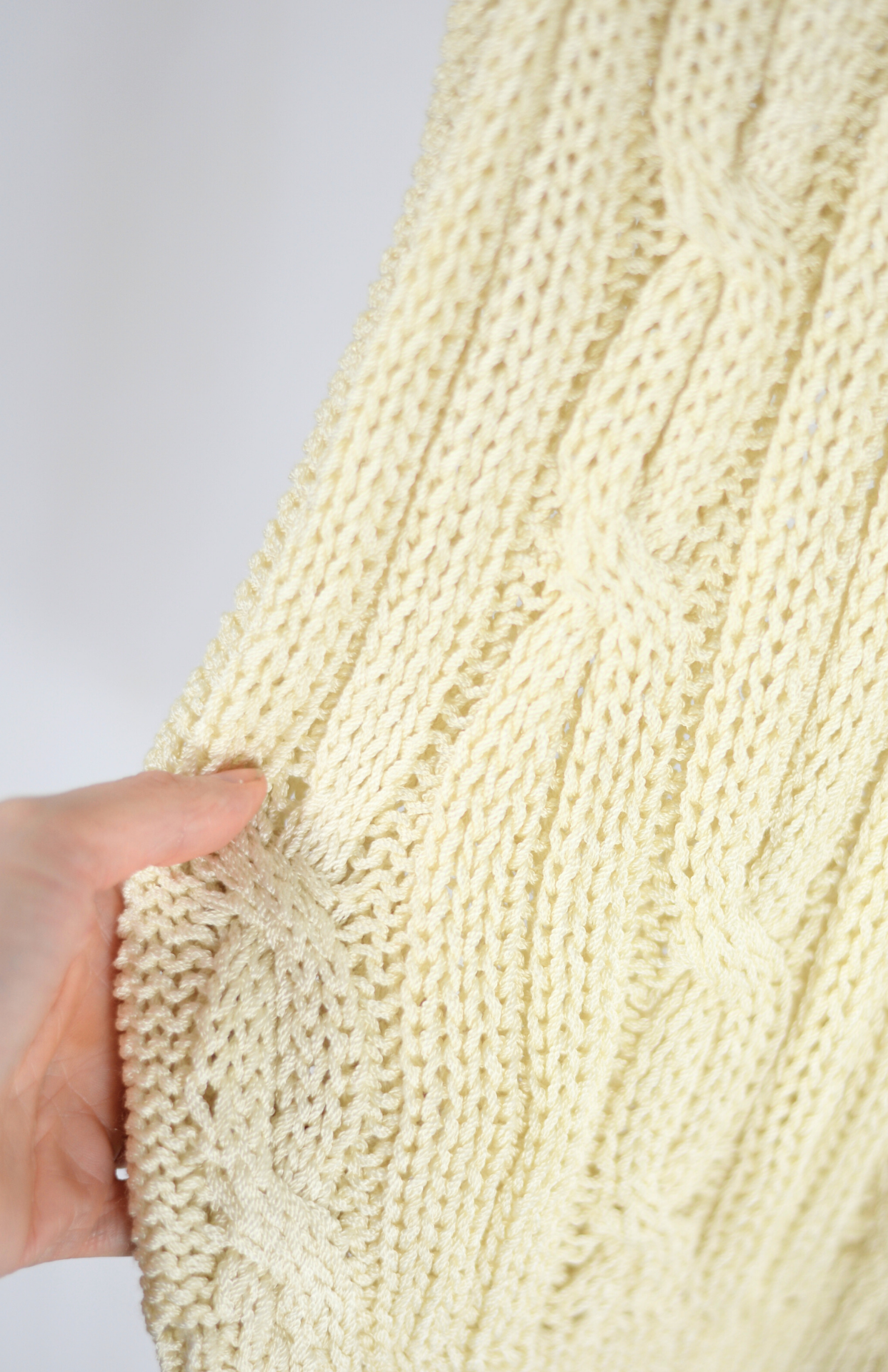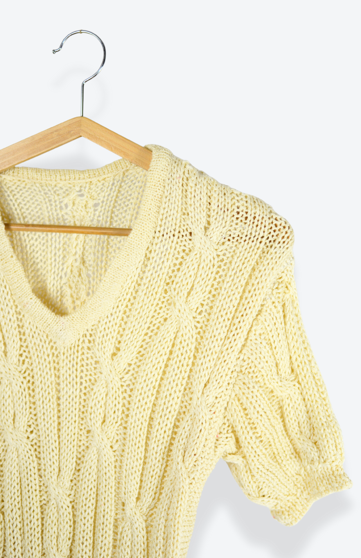 Krémový silný úpletový top / svetr s krátkým rukávem. Má copánkový vzor v úpletu a lehce nabraný rukáv.