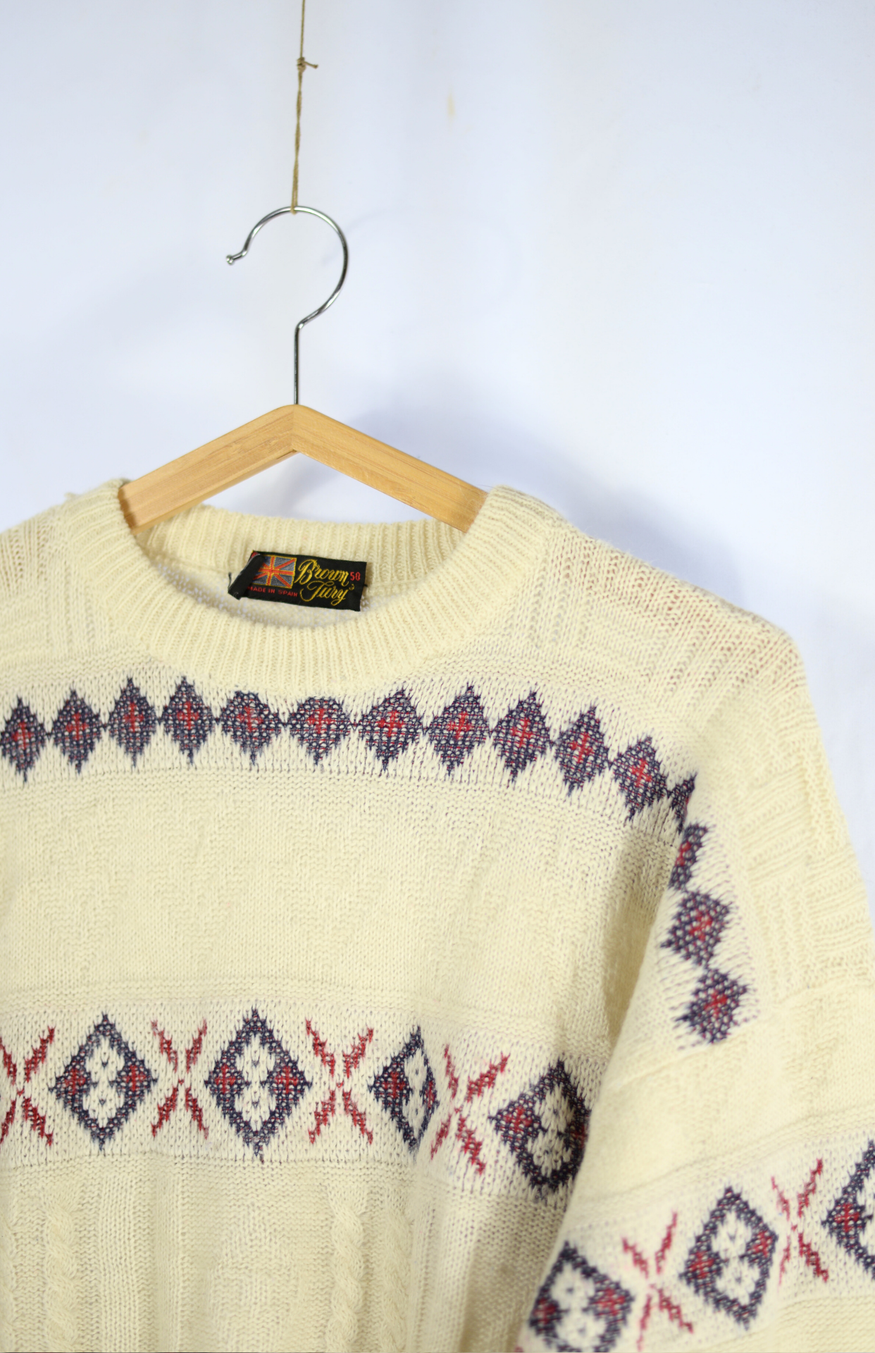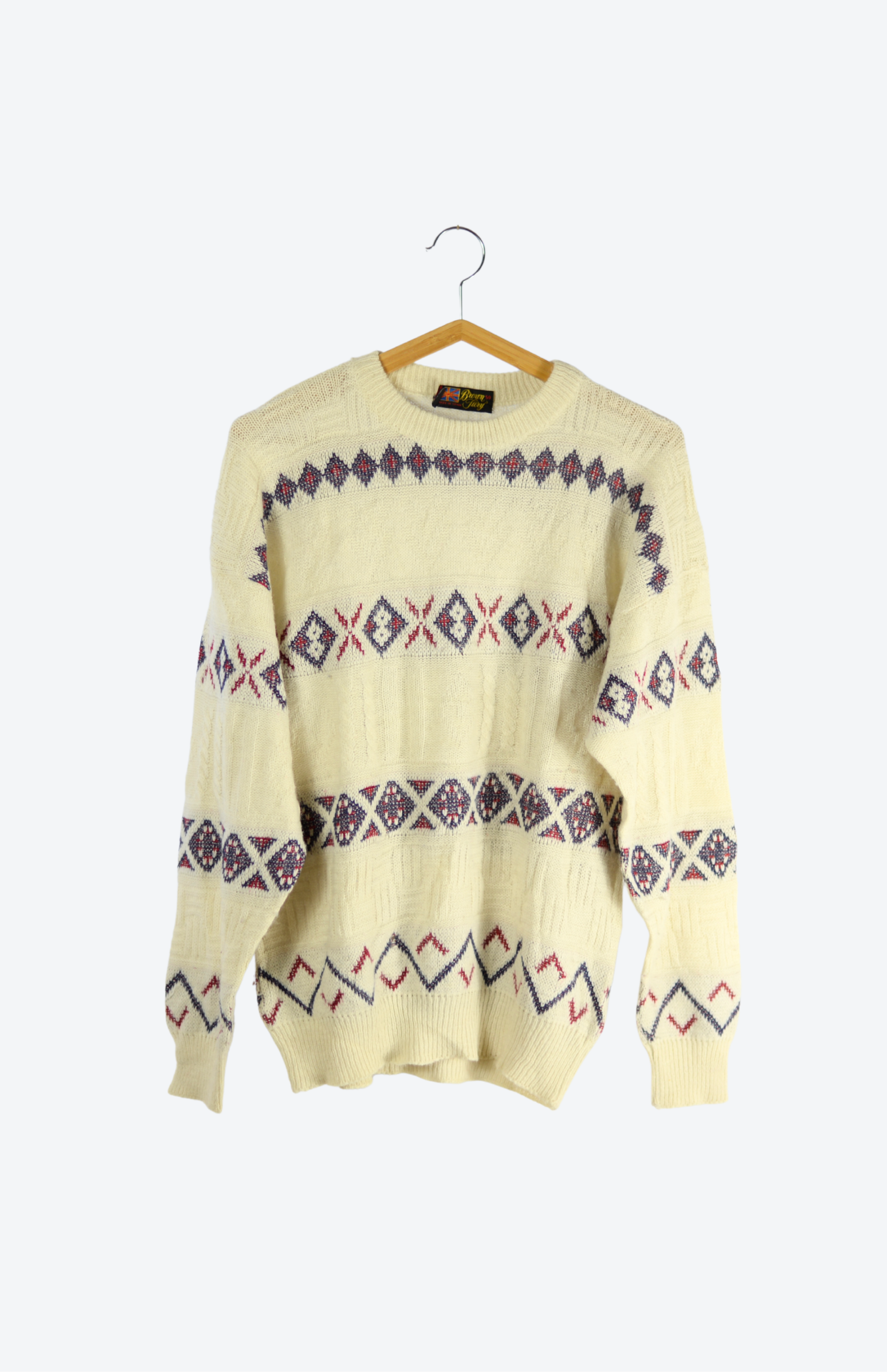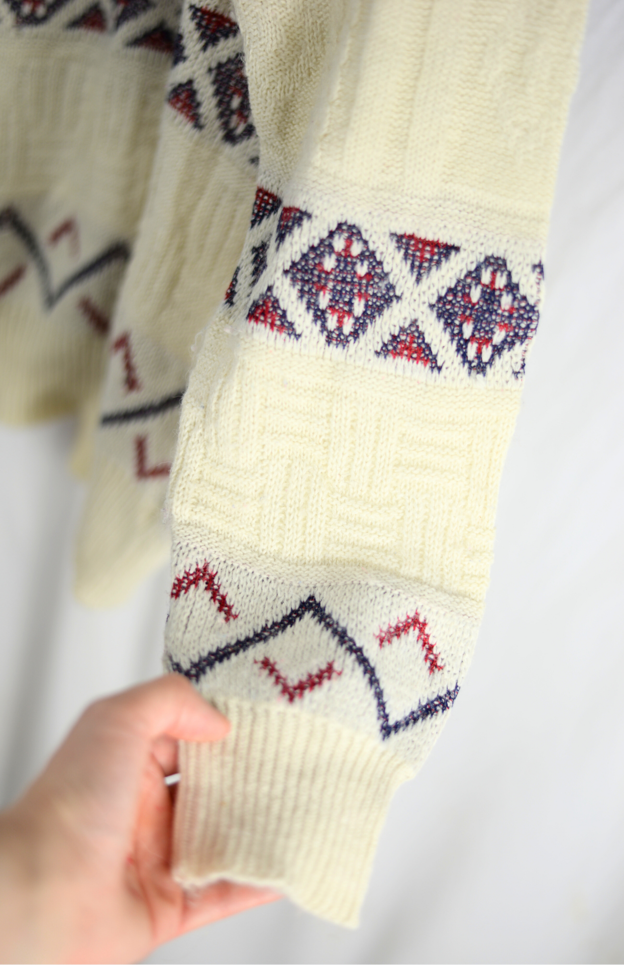 Krémový vintage svetr s barevným, červeno-modrým vzorem. Má strukturu v úpletu a volný střih. Unisex kousek.Stav: Ve skvělém stavu, bez vad. Pouze místy drobný žmolek.