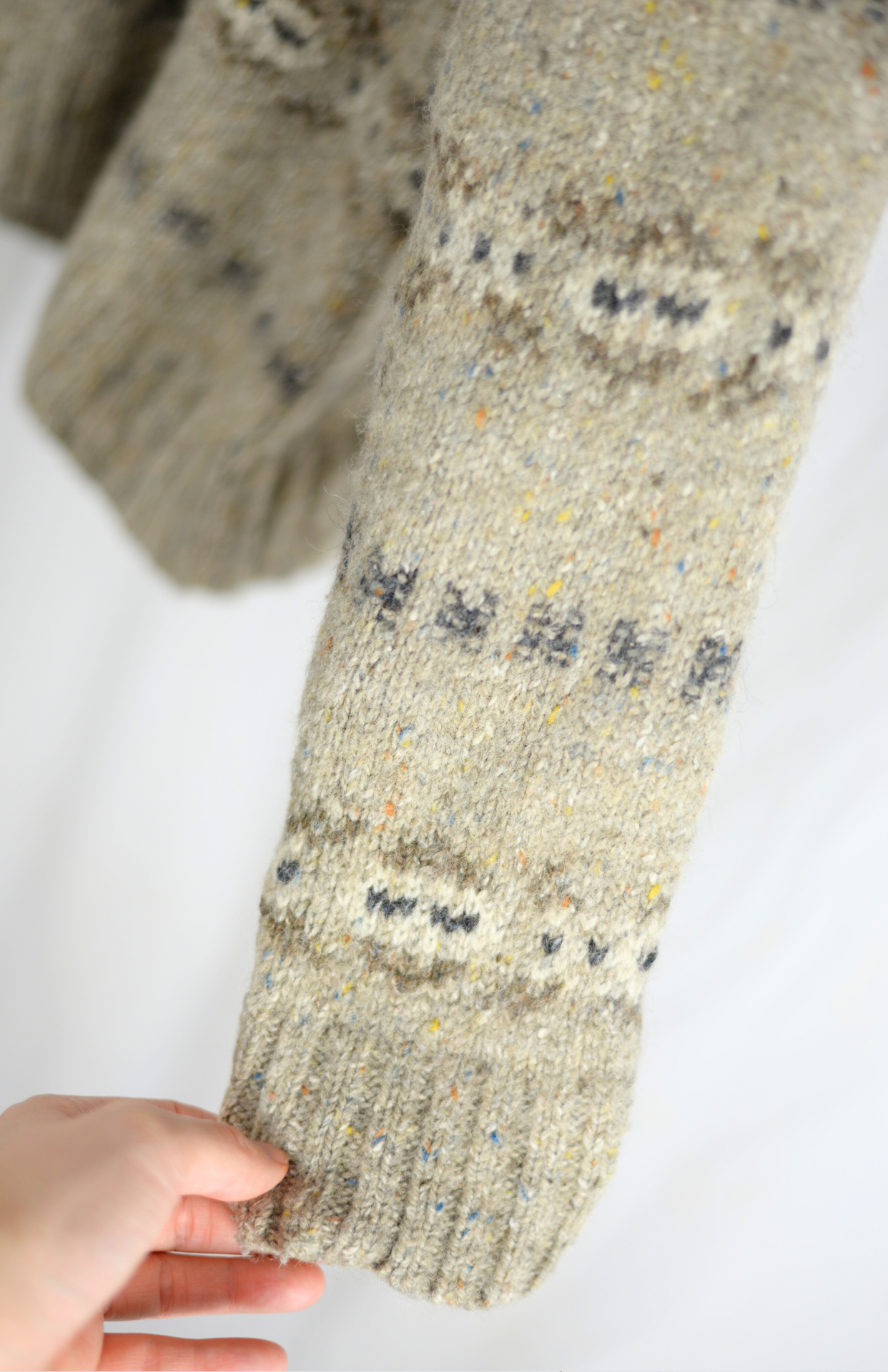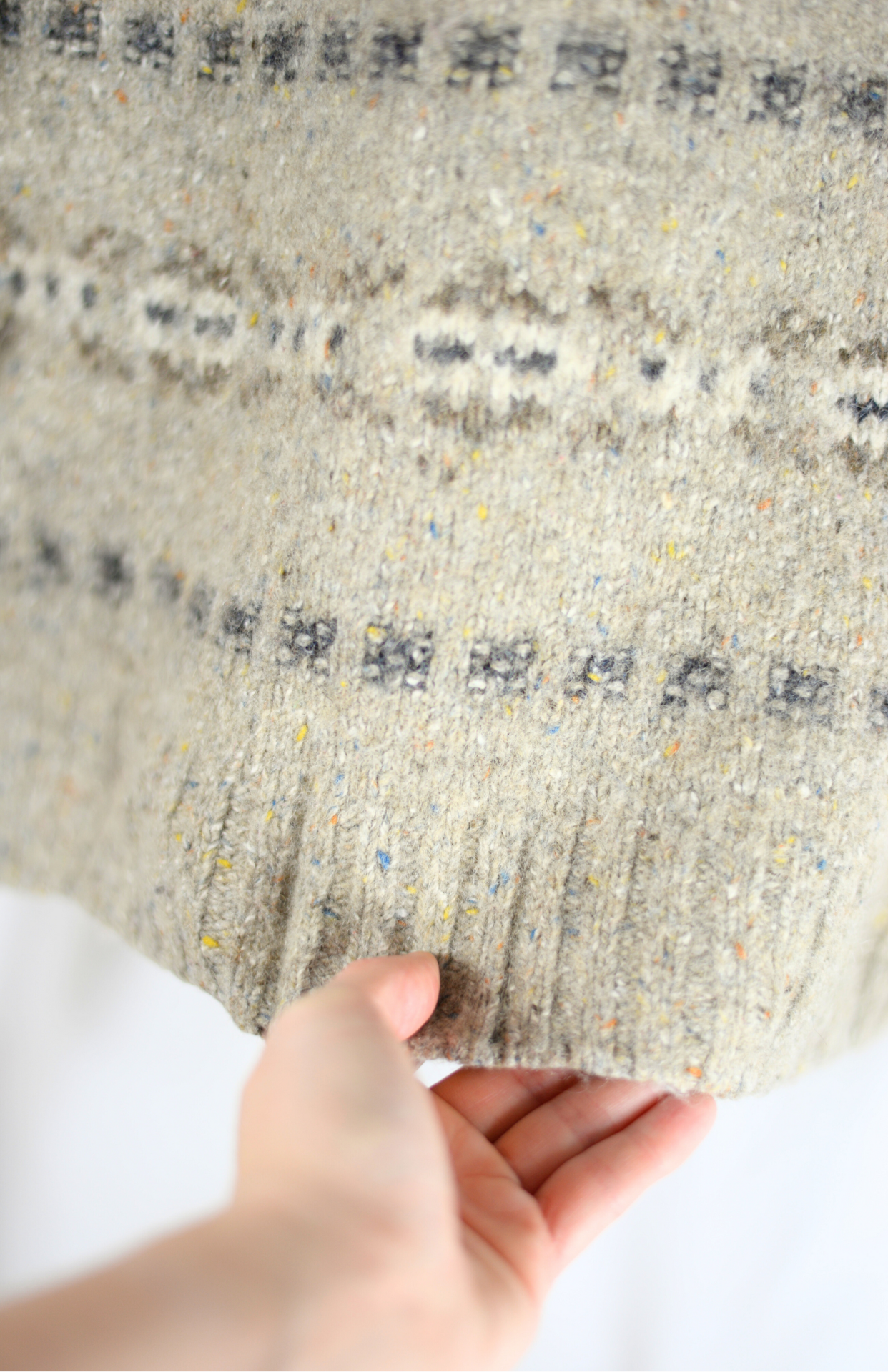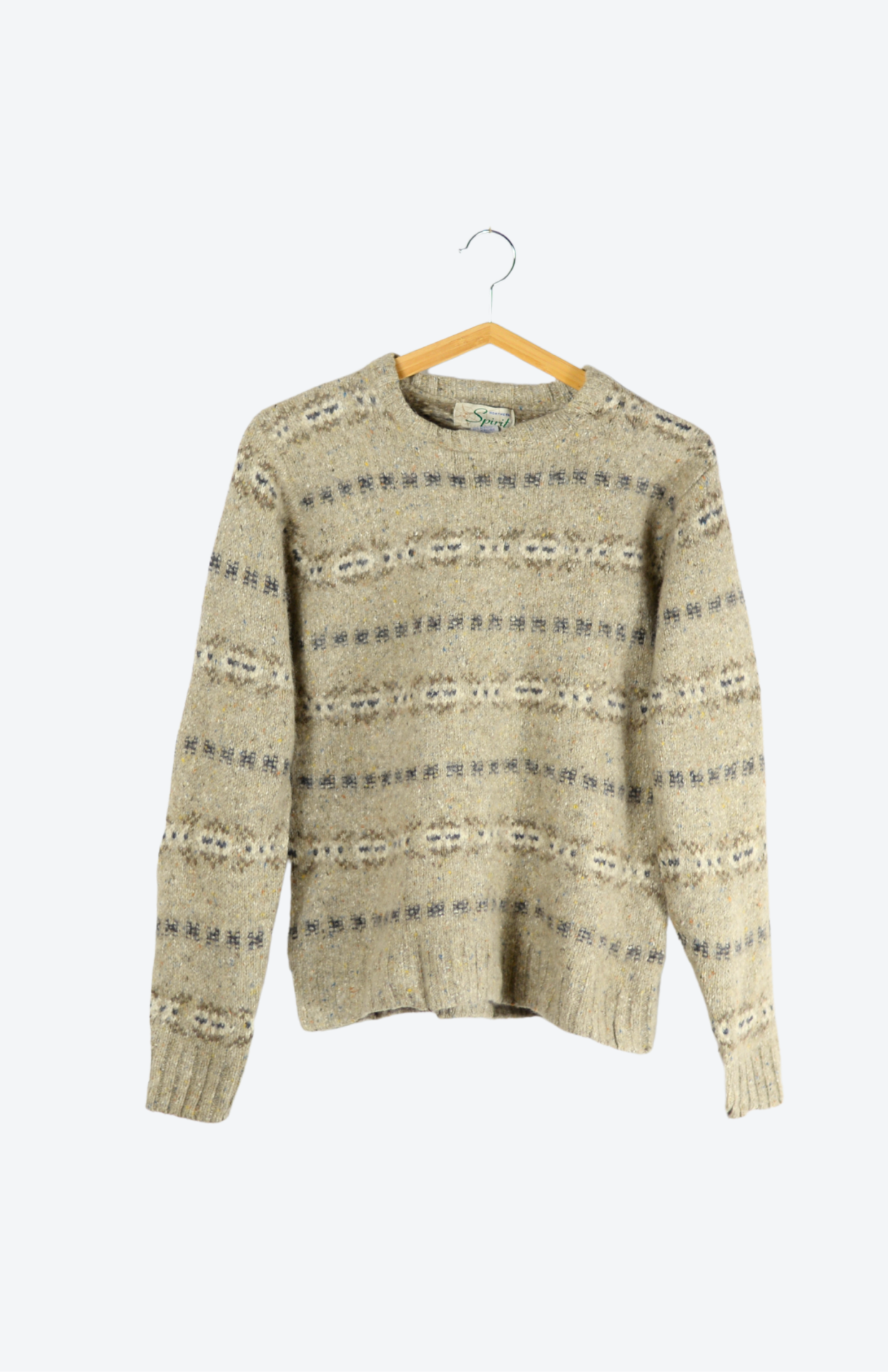 Vinatge svetr s drobným vzorem a barevným žíháním. Má silný vlněný úplet a kratší střih. Originální a pěkně zpracovaný. Unisex střih.