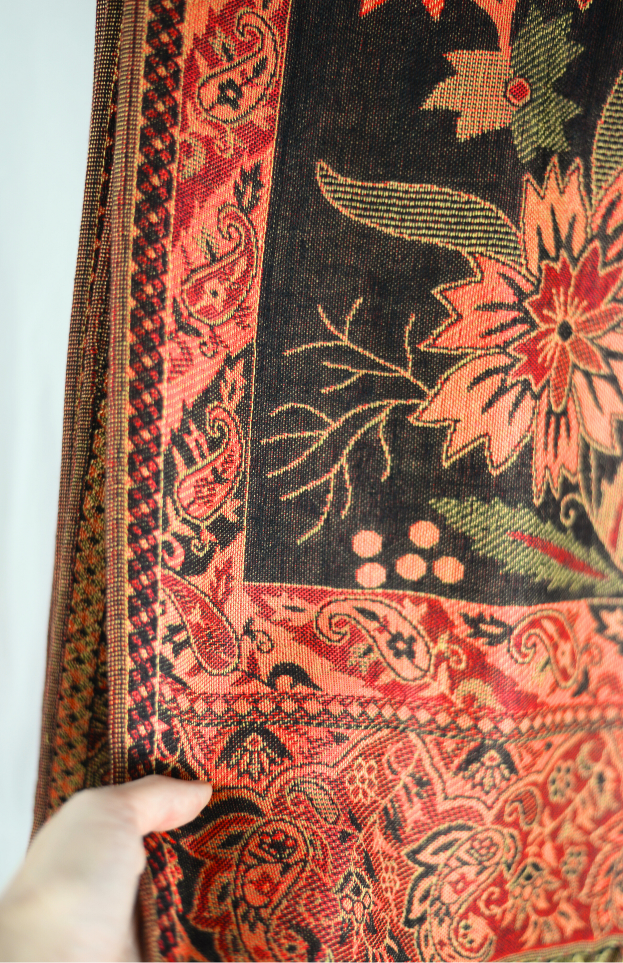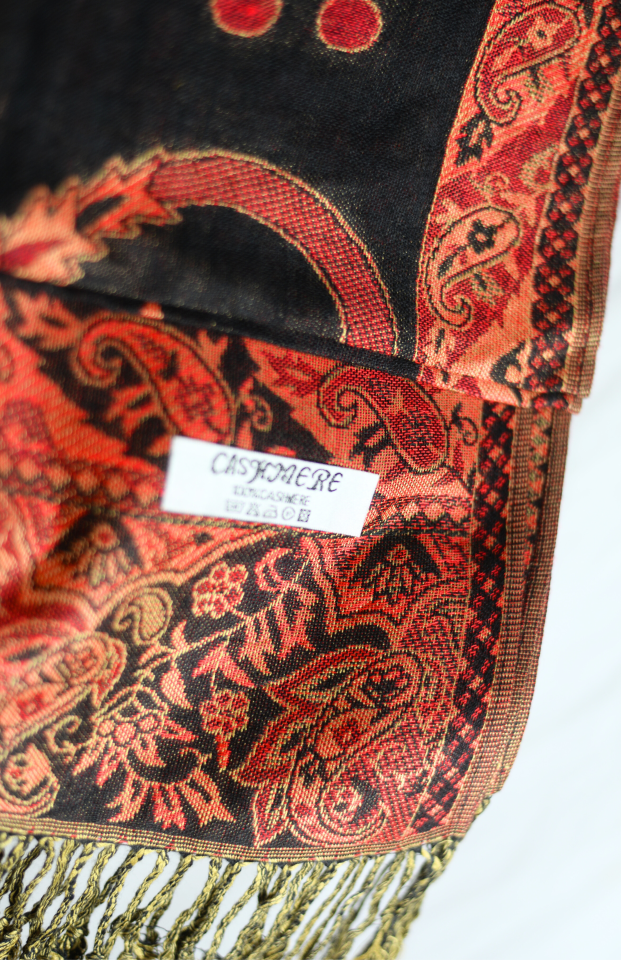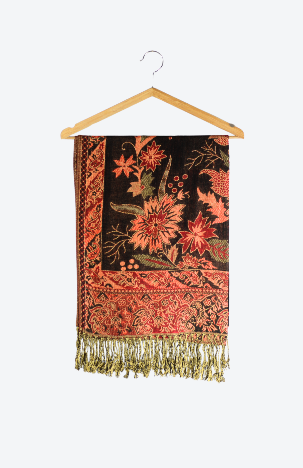 Květinami vytkávaná pašmínová šála z čistého kašmíru. Velmi hebká na omak. Má jemný saténový odlesk a kontrastní střapečky na koncích. Velmi kvalitně zpracovaná. Tip: pašmína se hodí kolem krku, jako přehoz přes ramena, nebo šikovná deka na cesty.