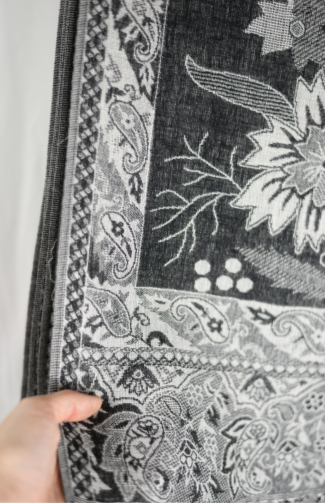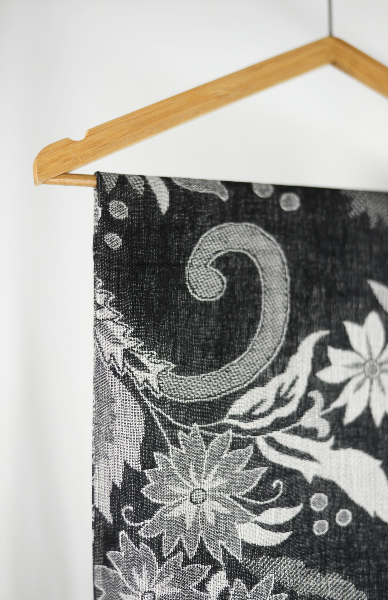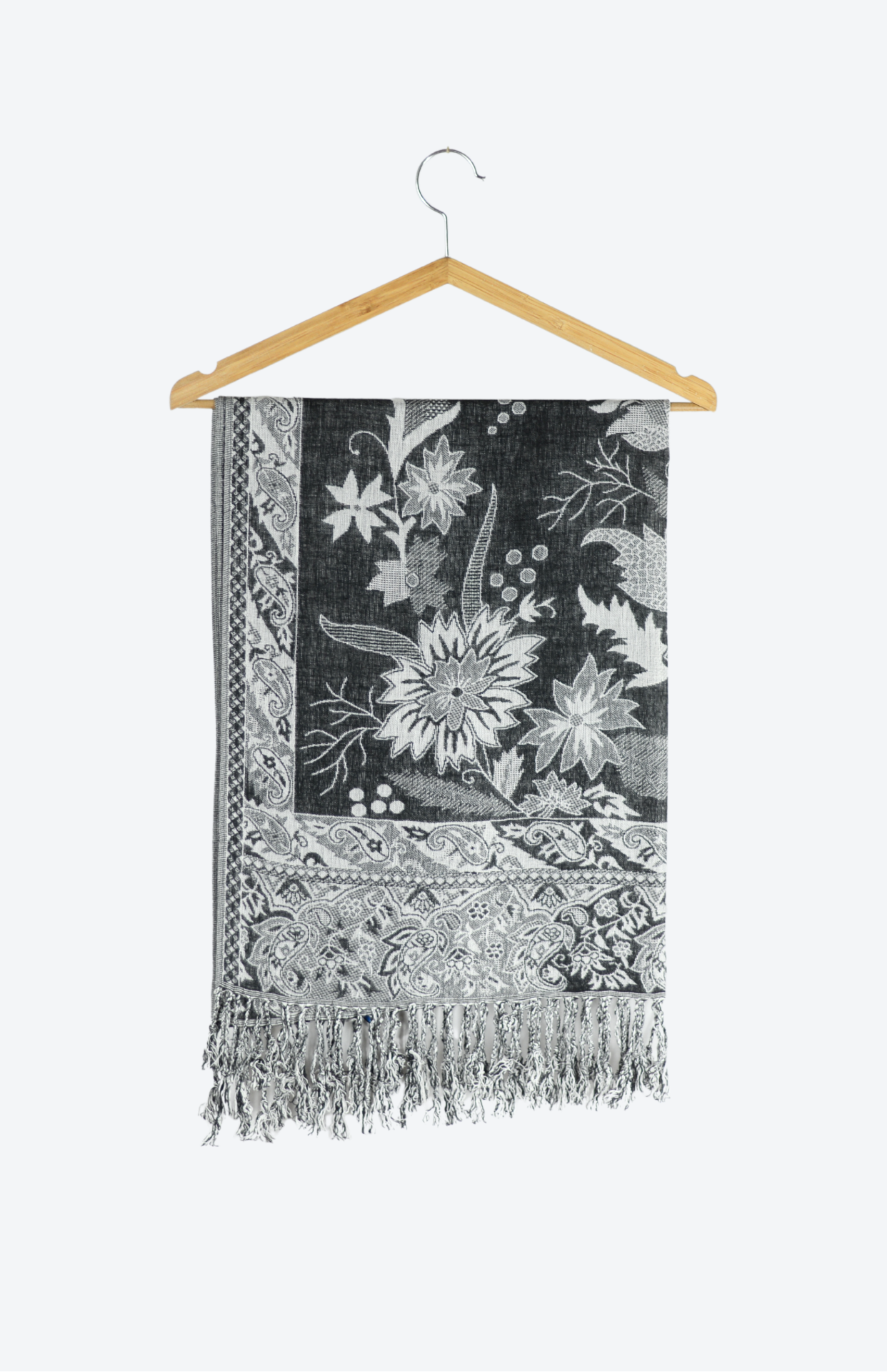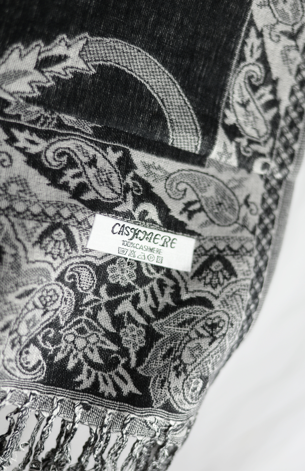 Květinami vytkávaná pašmínová šála z čistého kašmíru. Velmi hebká na omak. Má jemný saténový odlesk a kontrastní střapečky na koncích. Velmi kvalitně zpracovaná. Tip: pašmína se hodí kolem krku, jako přehoz přes ramena, nebo šikovná deka na cesty.