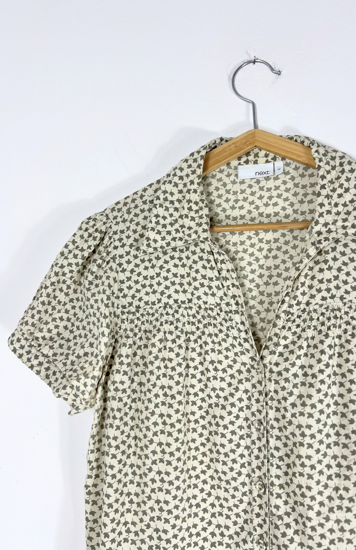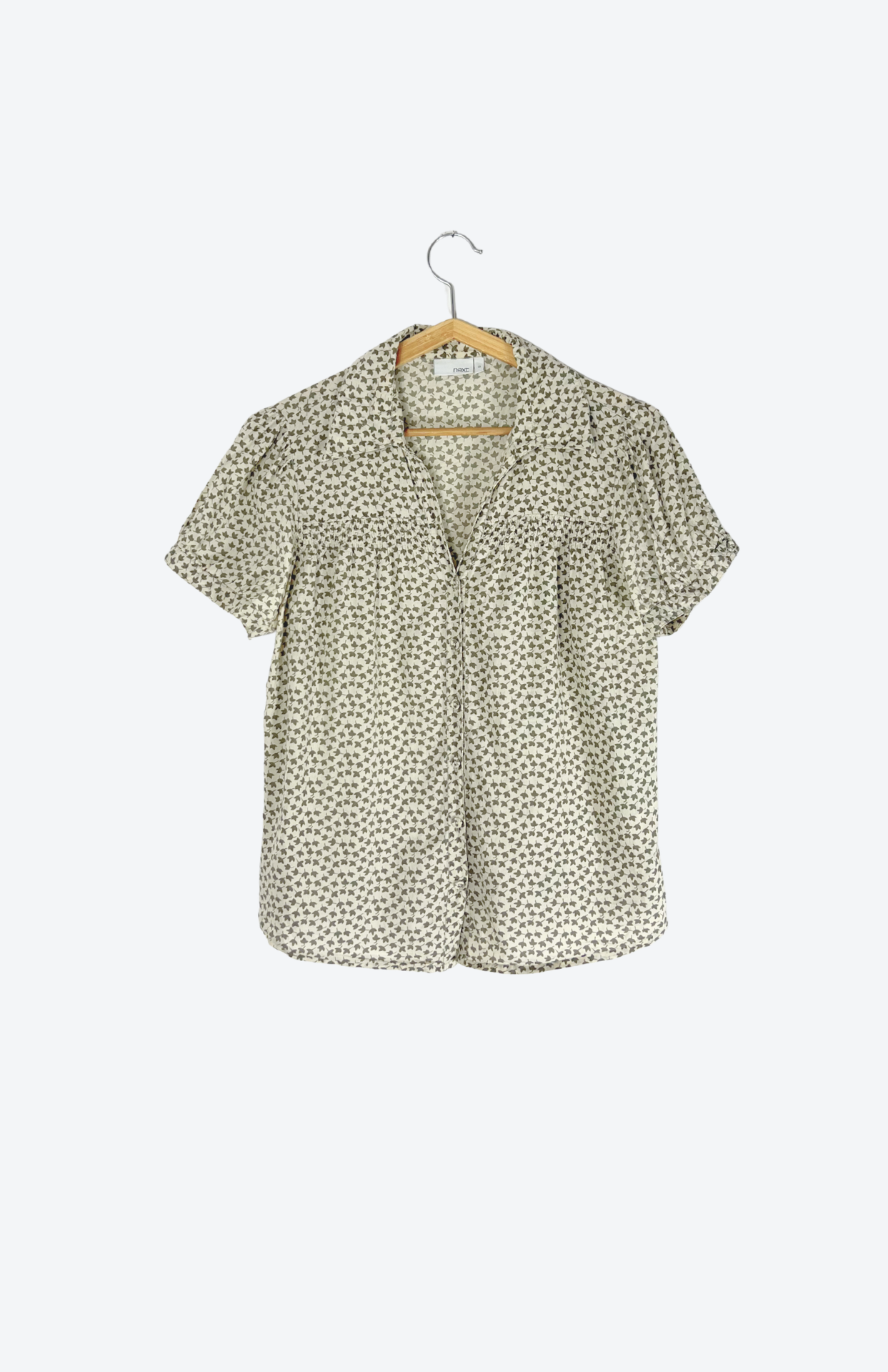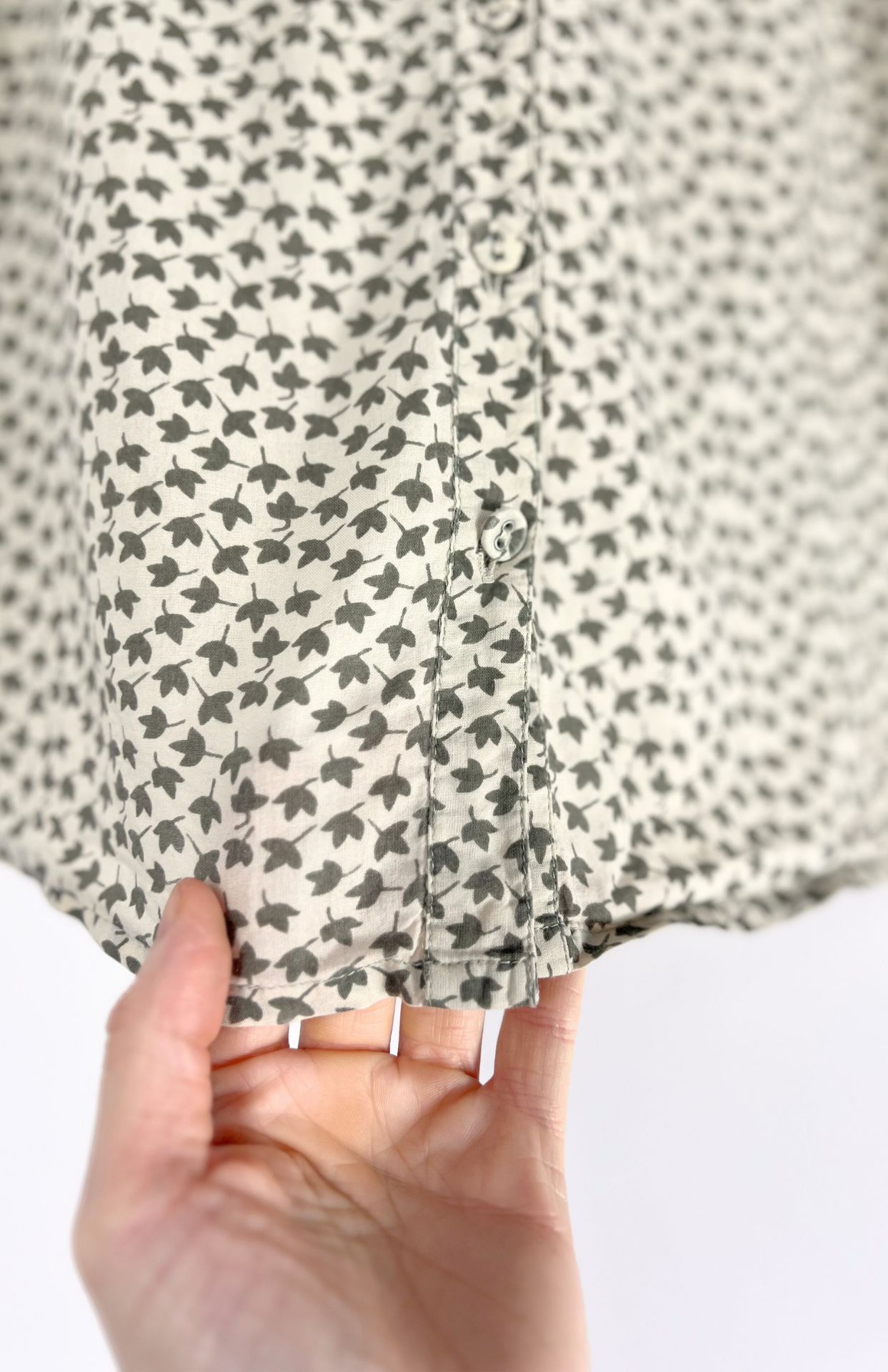 Lehká bavlněná halenka s lístky. Má potažené knoflíčky a jemně nabraný střih.